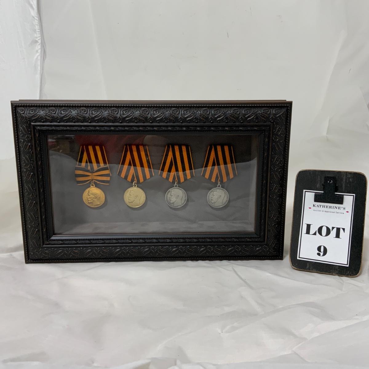 From the Estate of Peter Radovanovich: Set of 4 Elegantly Framed Czar Nicholas II Medallions, awarded for acts of Bravery and Zeal. The medals are believed to be exceptional reproductions, but please use your best judgement. Framed with Conservation Glass by a reputable local frame shop. Please see photos for details and condition. ::: Shipping is available on this lot. If you require shipping you must let us know at the close of the auction. We will coordinate with you after the item has been won. Shipping fees will include insurance up to or exceeding the value of all items being mailed. If you have any questions regarding this lot please contact the auctioneer either via this website, by direct email or by phone. PICK UP TIMES and other important information can be found in the TERMS and DESCRIPTION of the auction. Please take a look for pertinent information. Thanks!