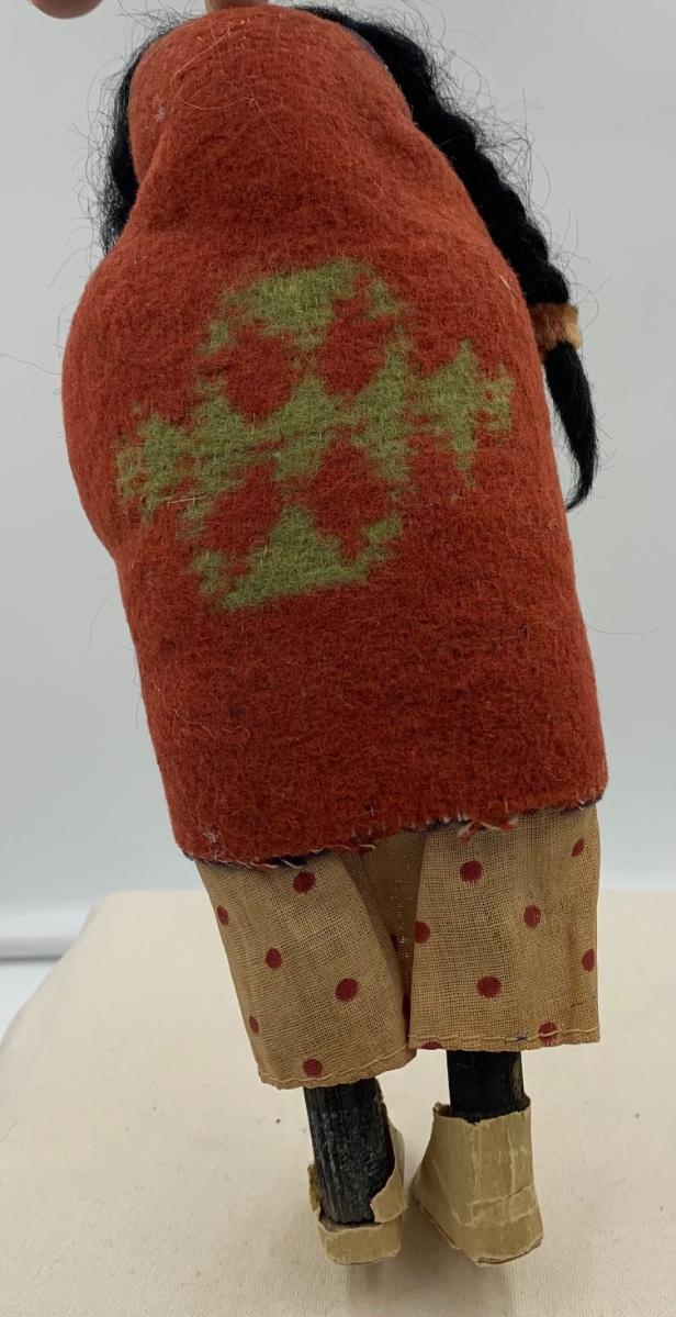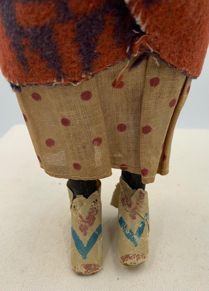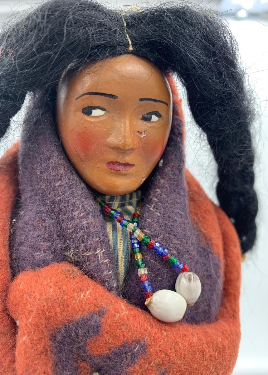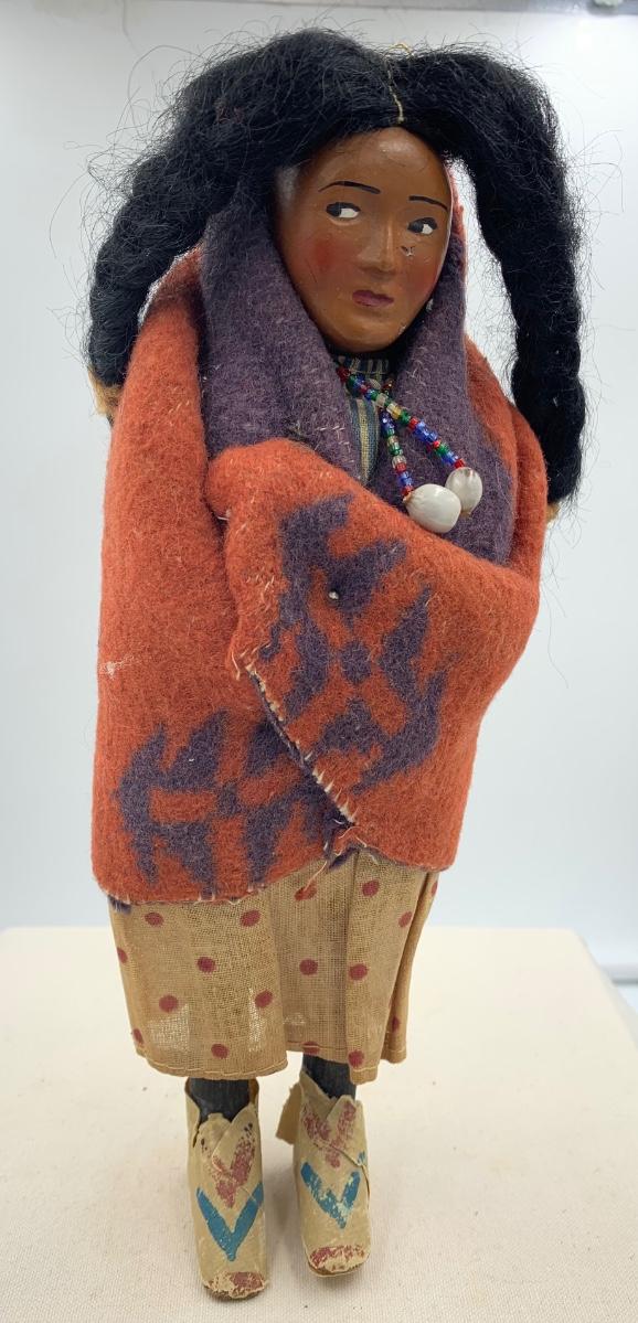 This is a great vintage skookum! Stands 9” H. Some wear as seen in photos. Paper tape shoes.