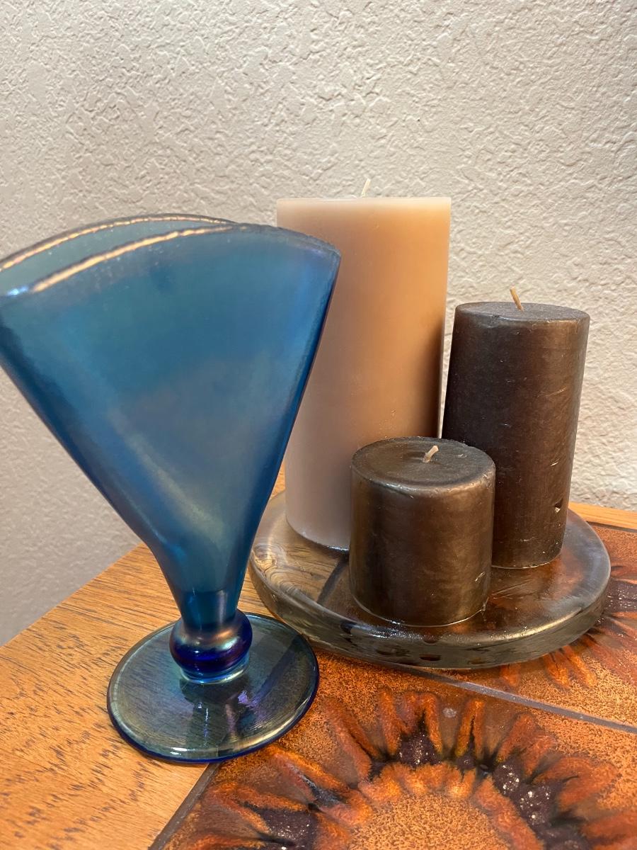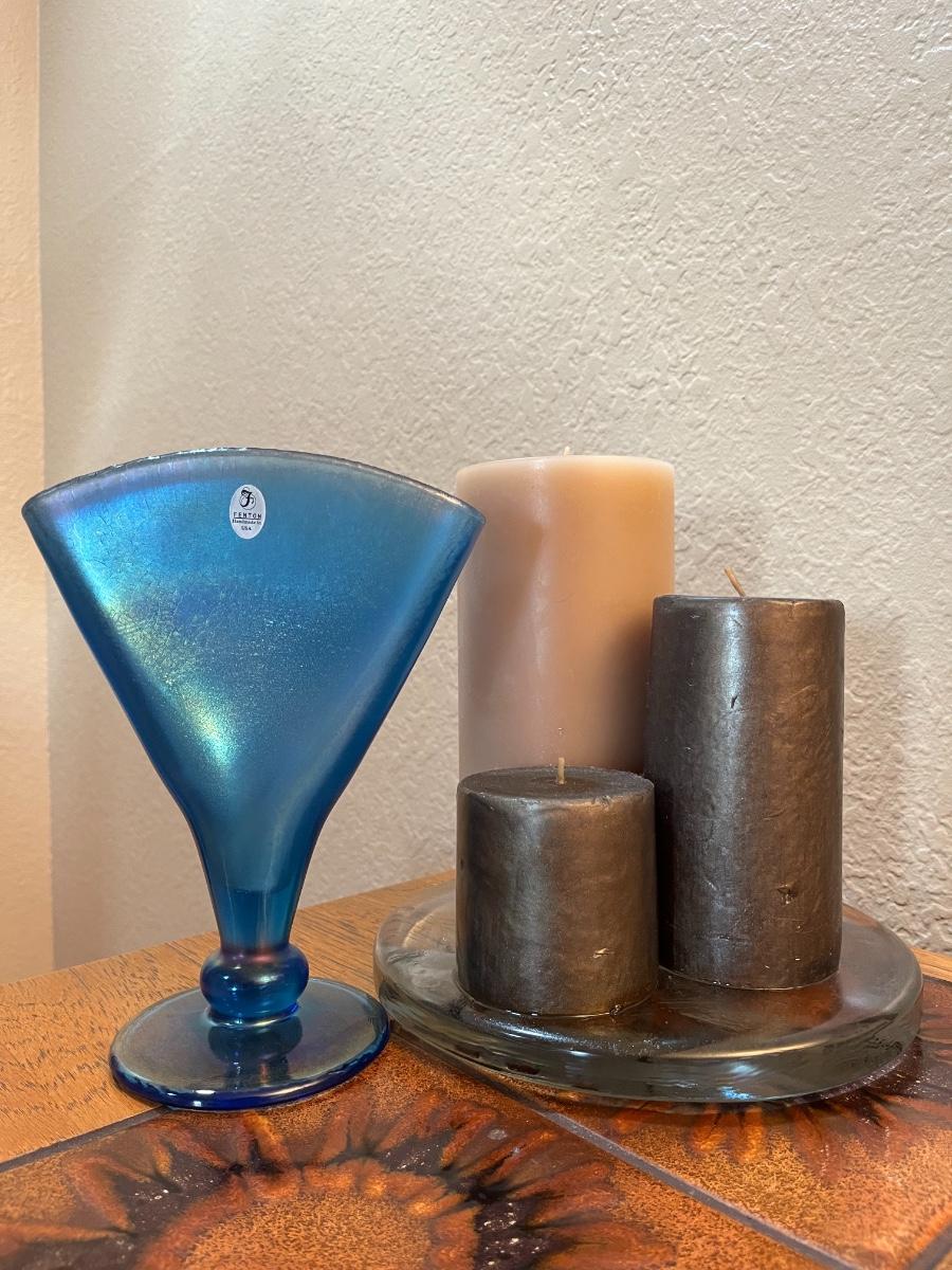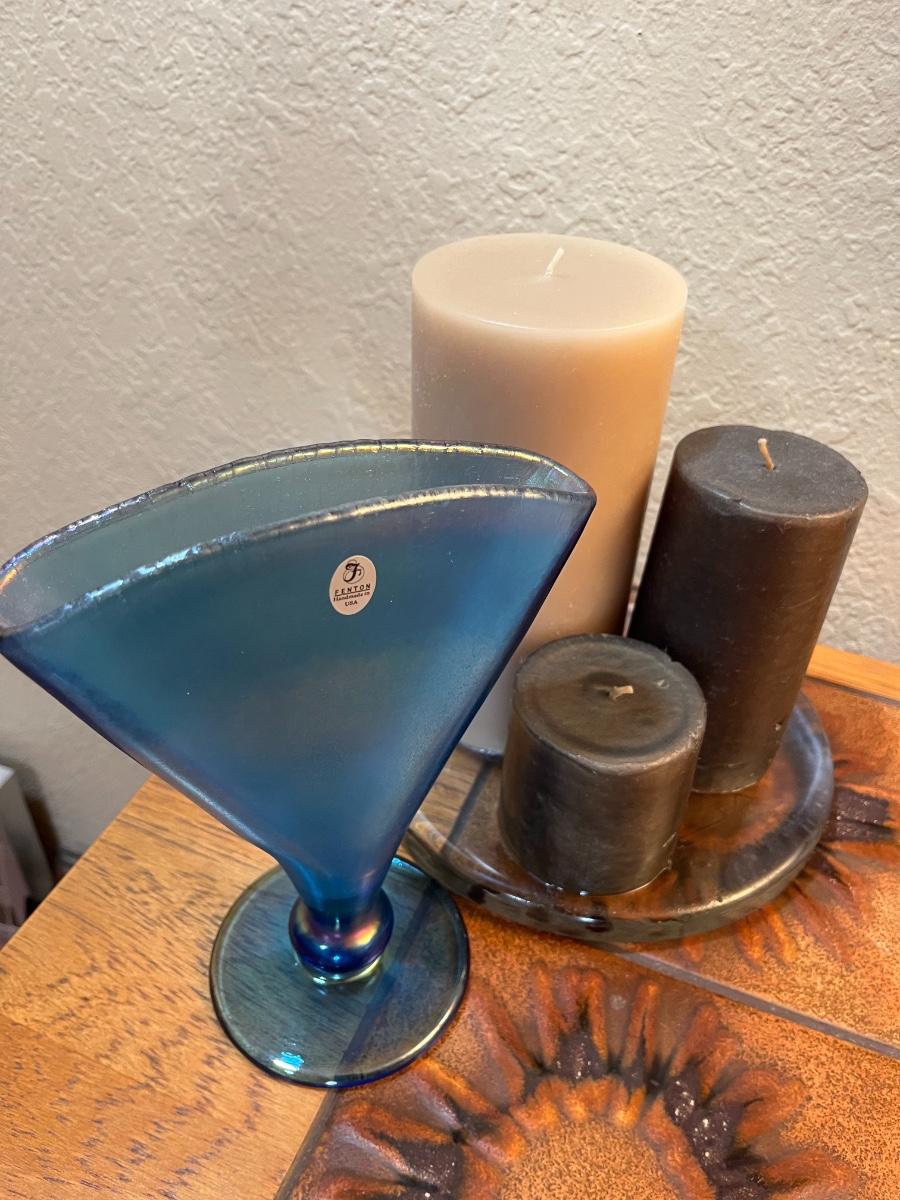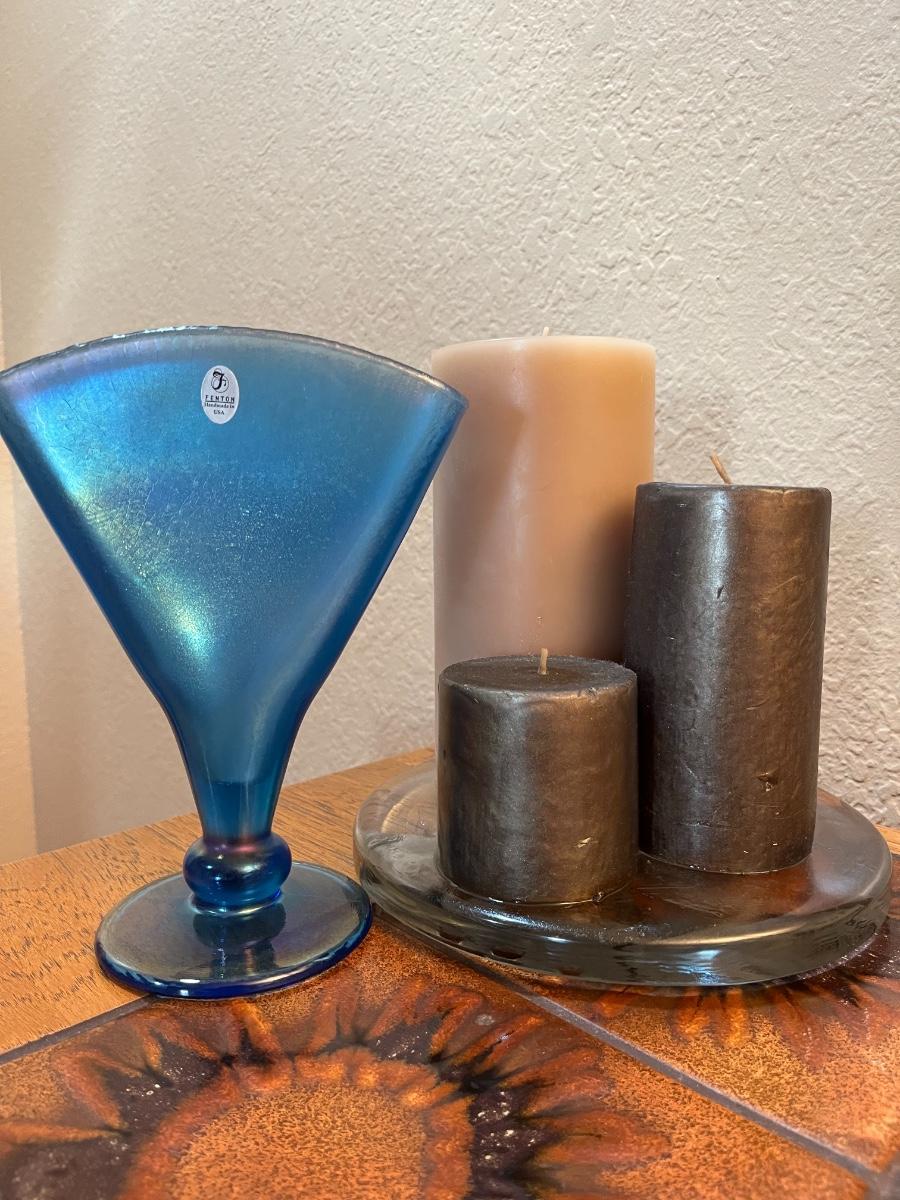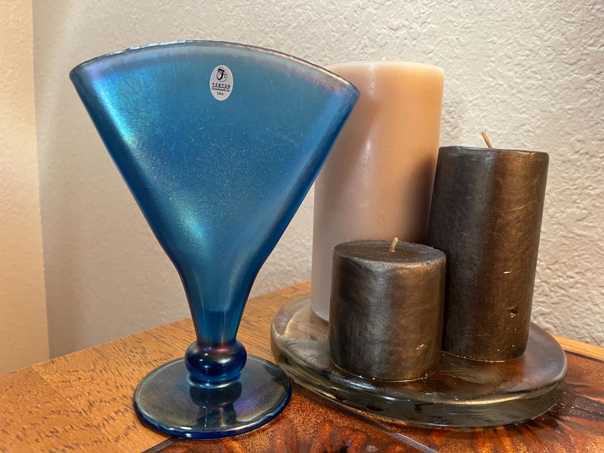 9” decorative Fenton glass (blue/purpleish)/ 3 candles on glass tray