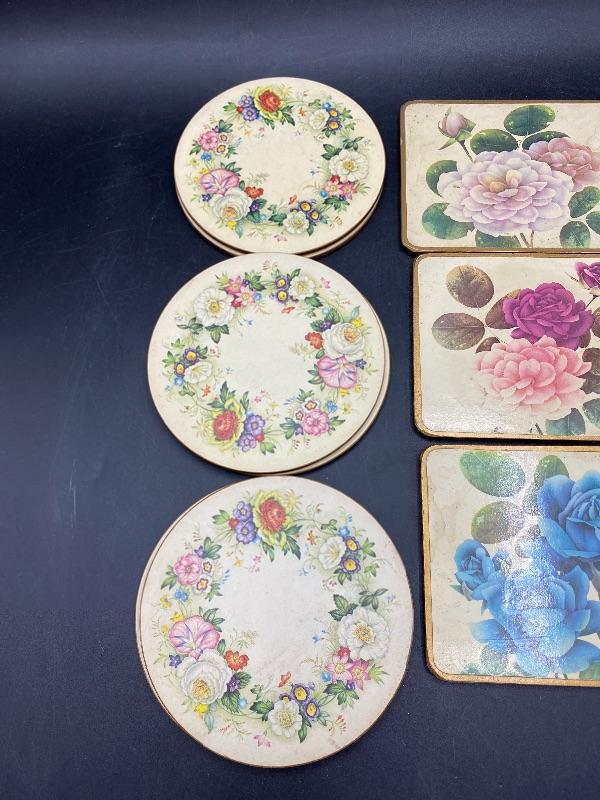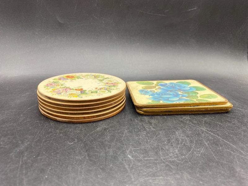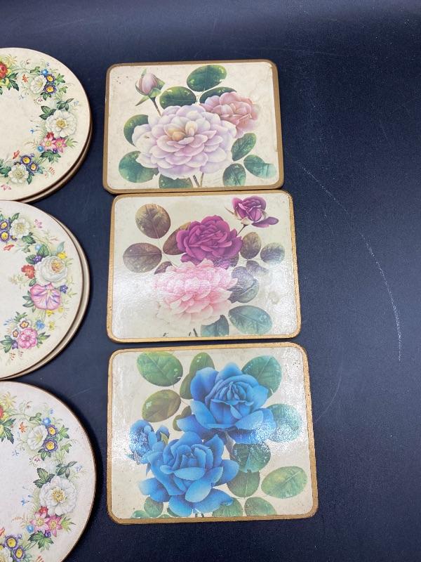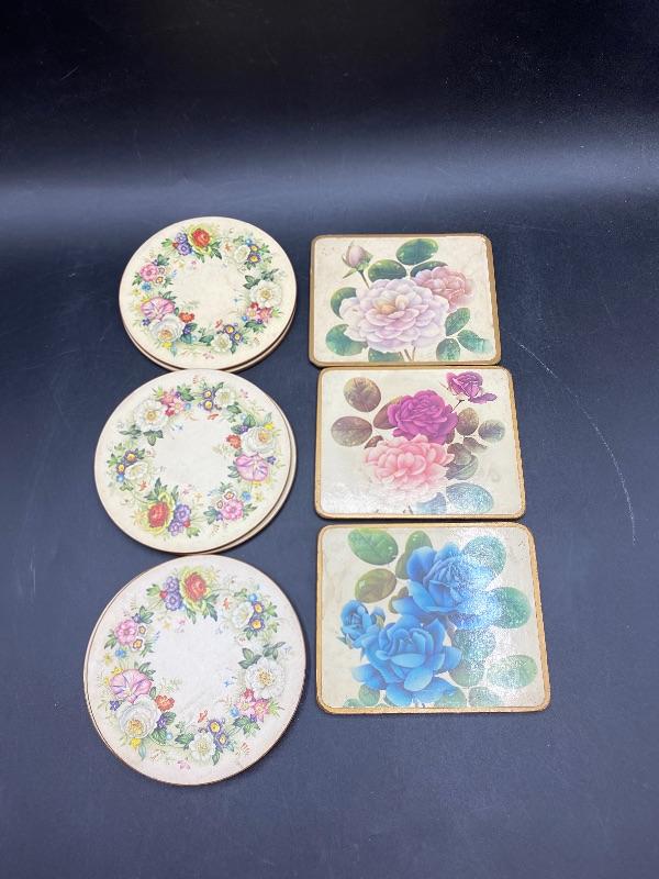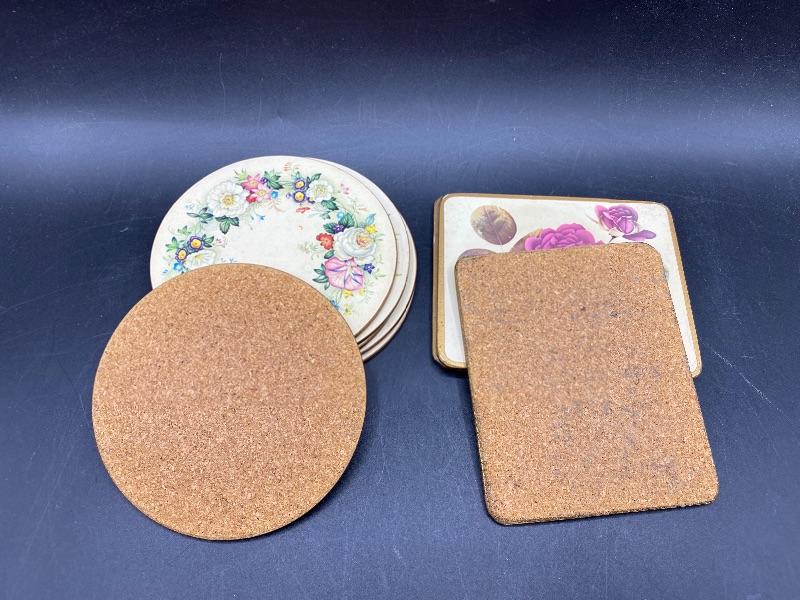 Set of 9 vintage floral coasters. 6 round ones are matching pattern. Good used condition. A couple need to be cleaned. Cork back.