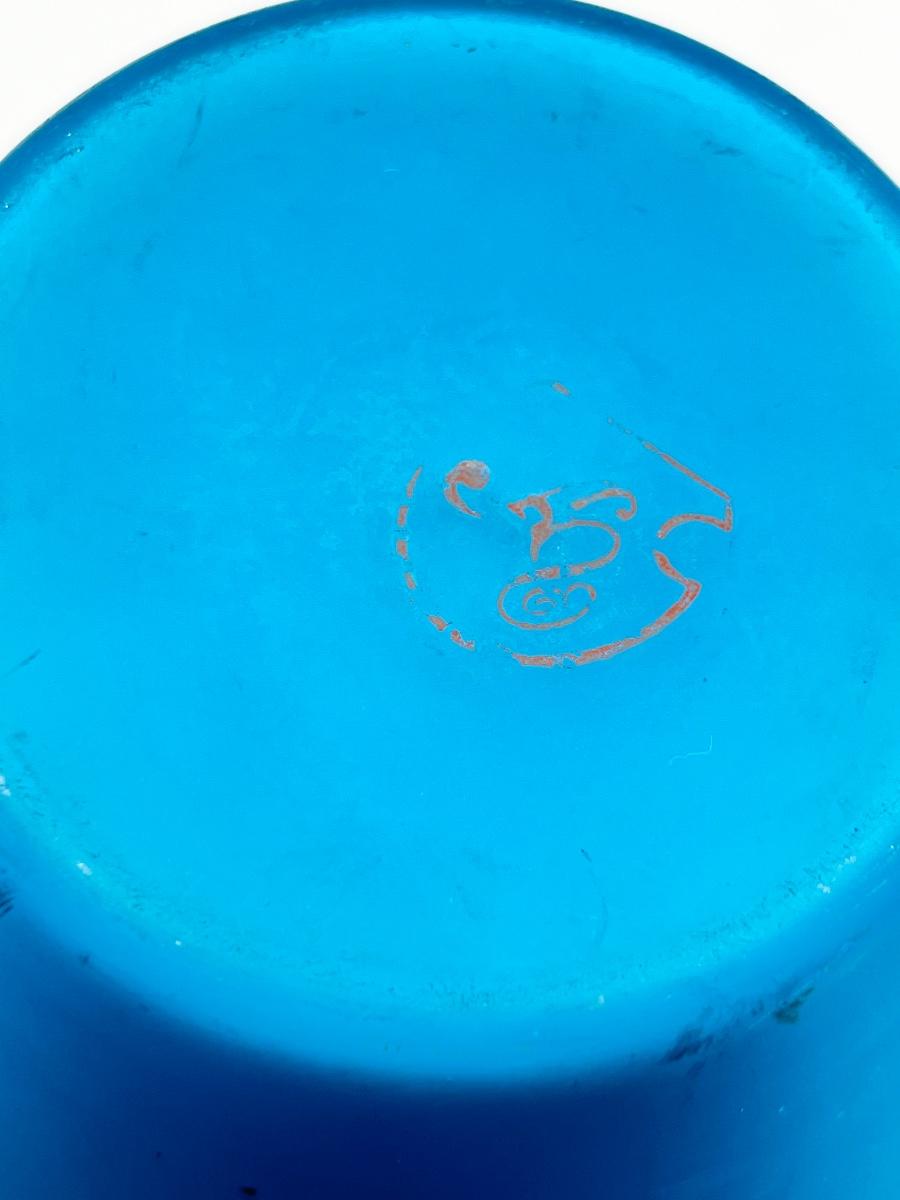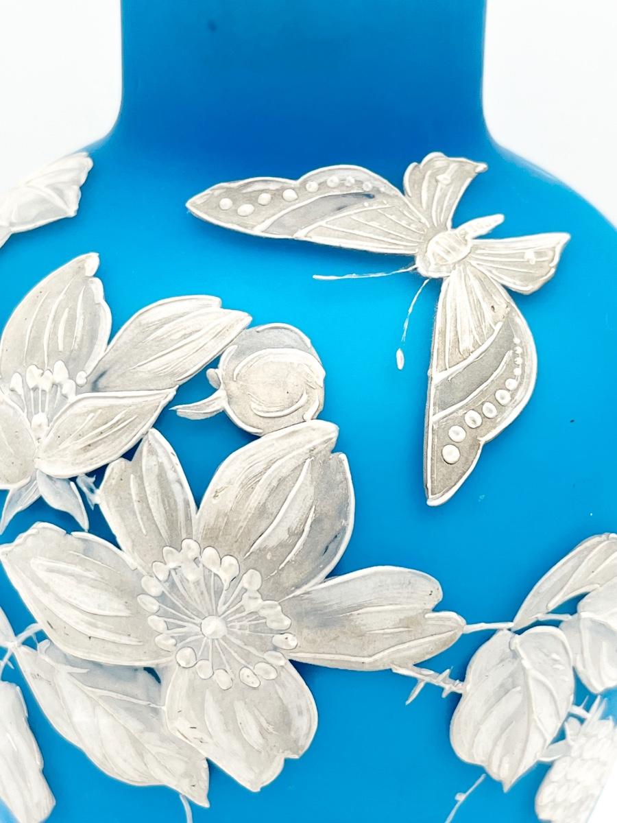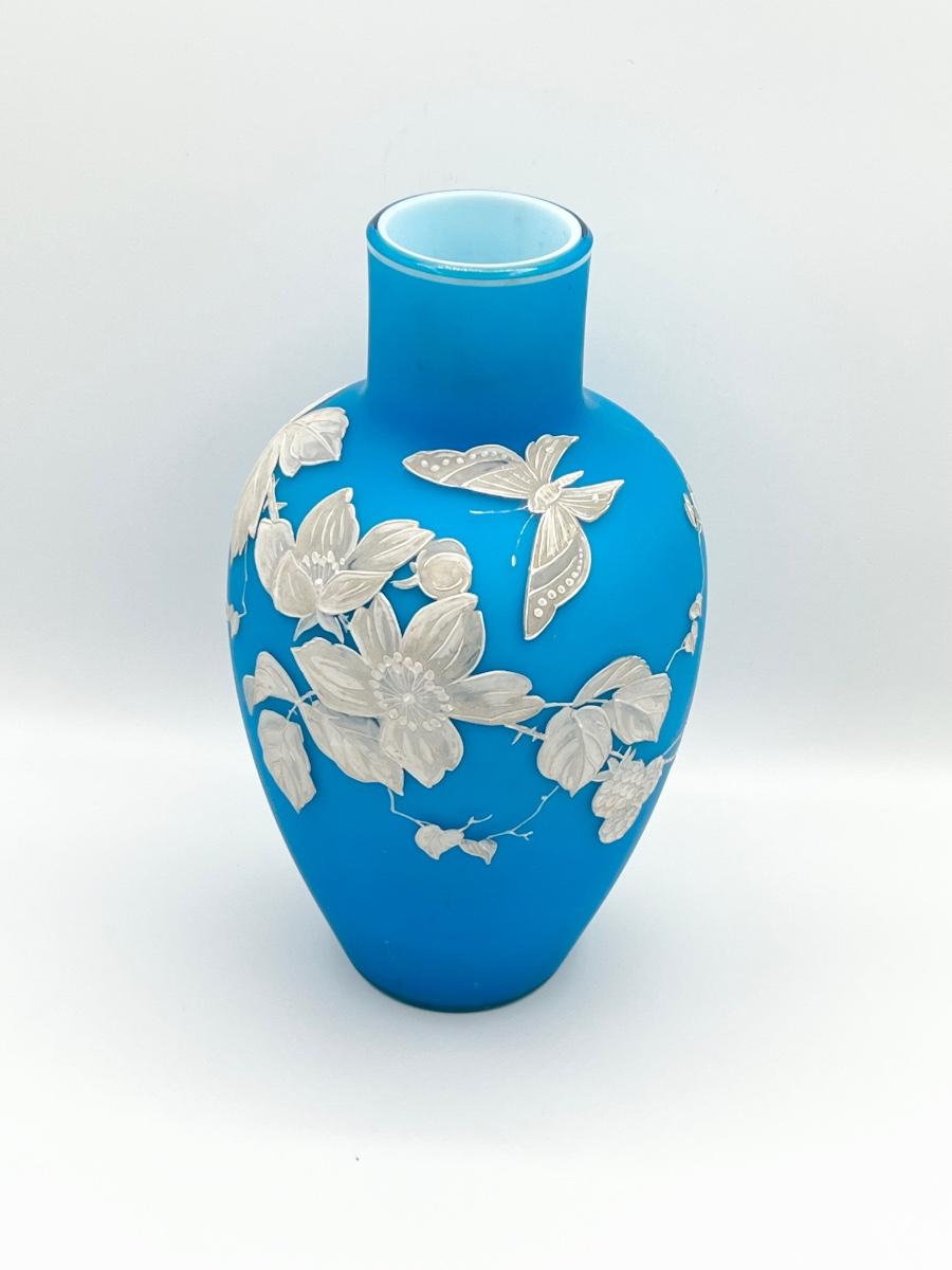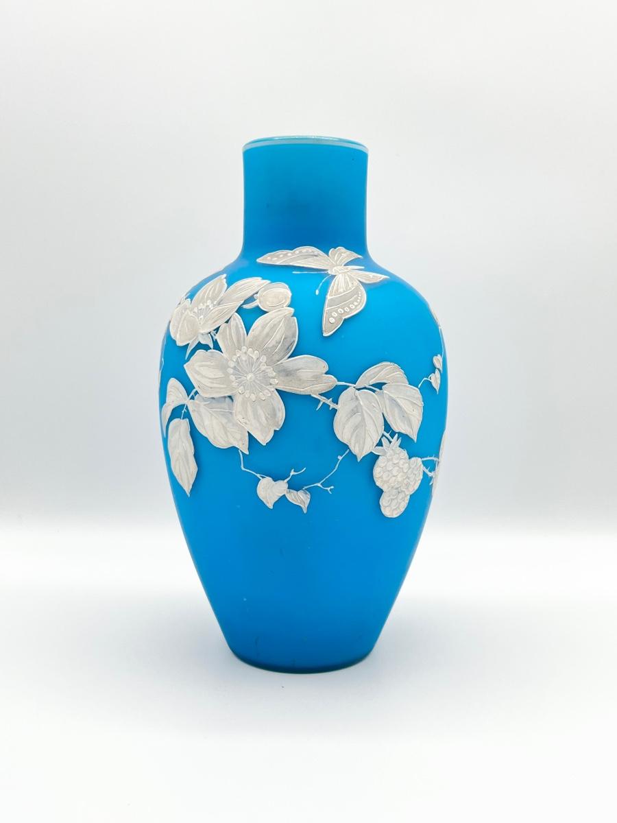 9” Frosted Blued Blue Floral & Butterfly Art Glass Vase
