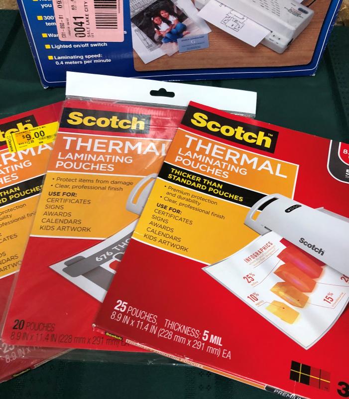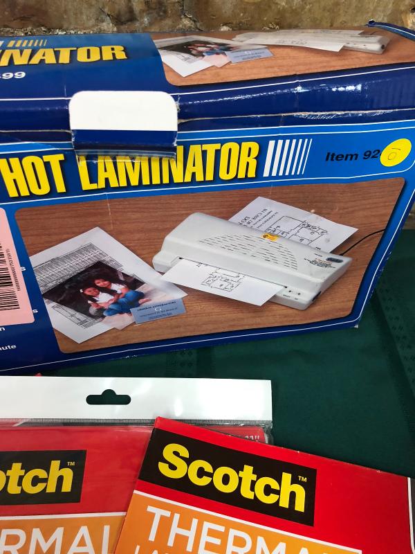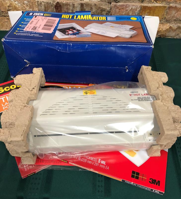 In the box here is a 9 Inch Hot Laminator with 3 packages of Scotch brand Thermal Laminating Pouches....