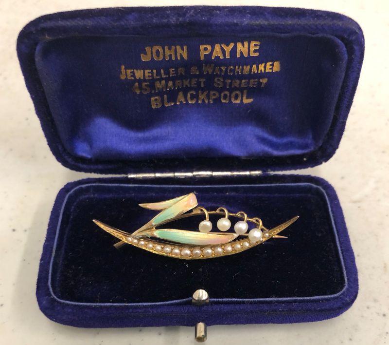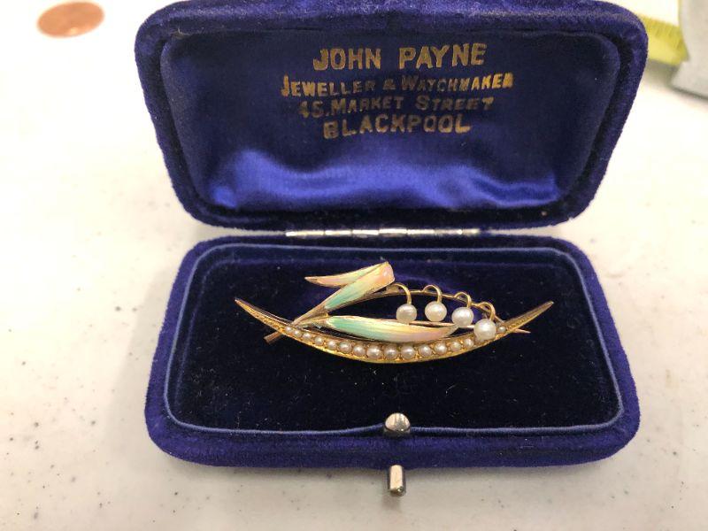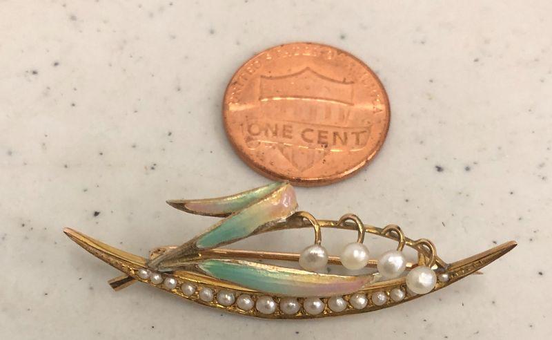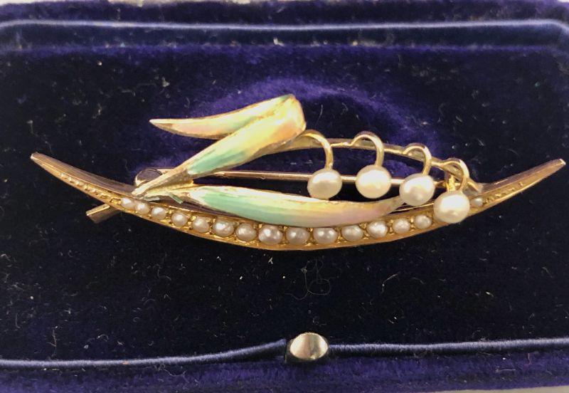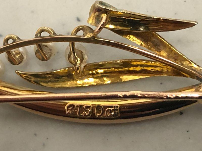 This adorable 9ct gold (so marked) brooch is hand painted and has 21 very small pearls in it. I believe that it's in it's original box.