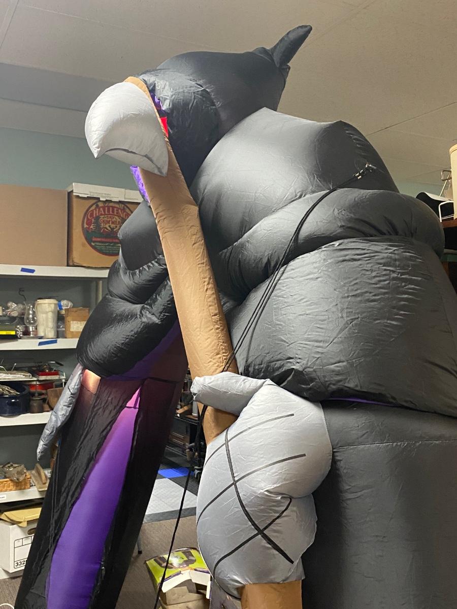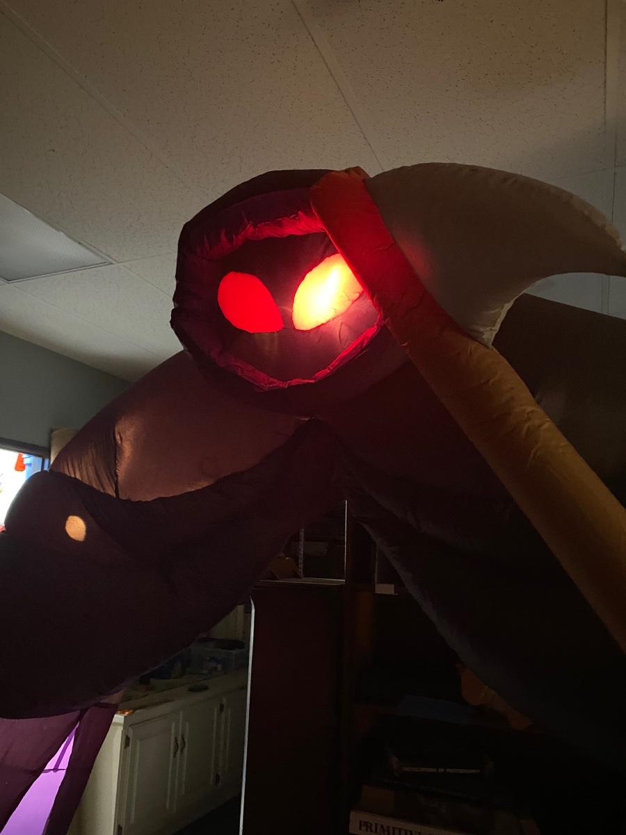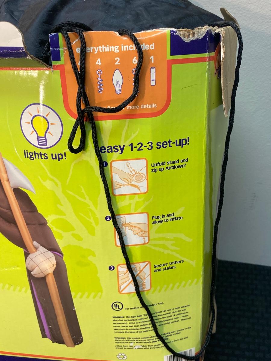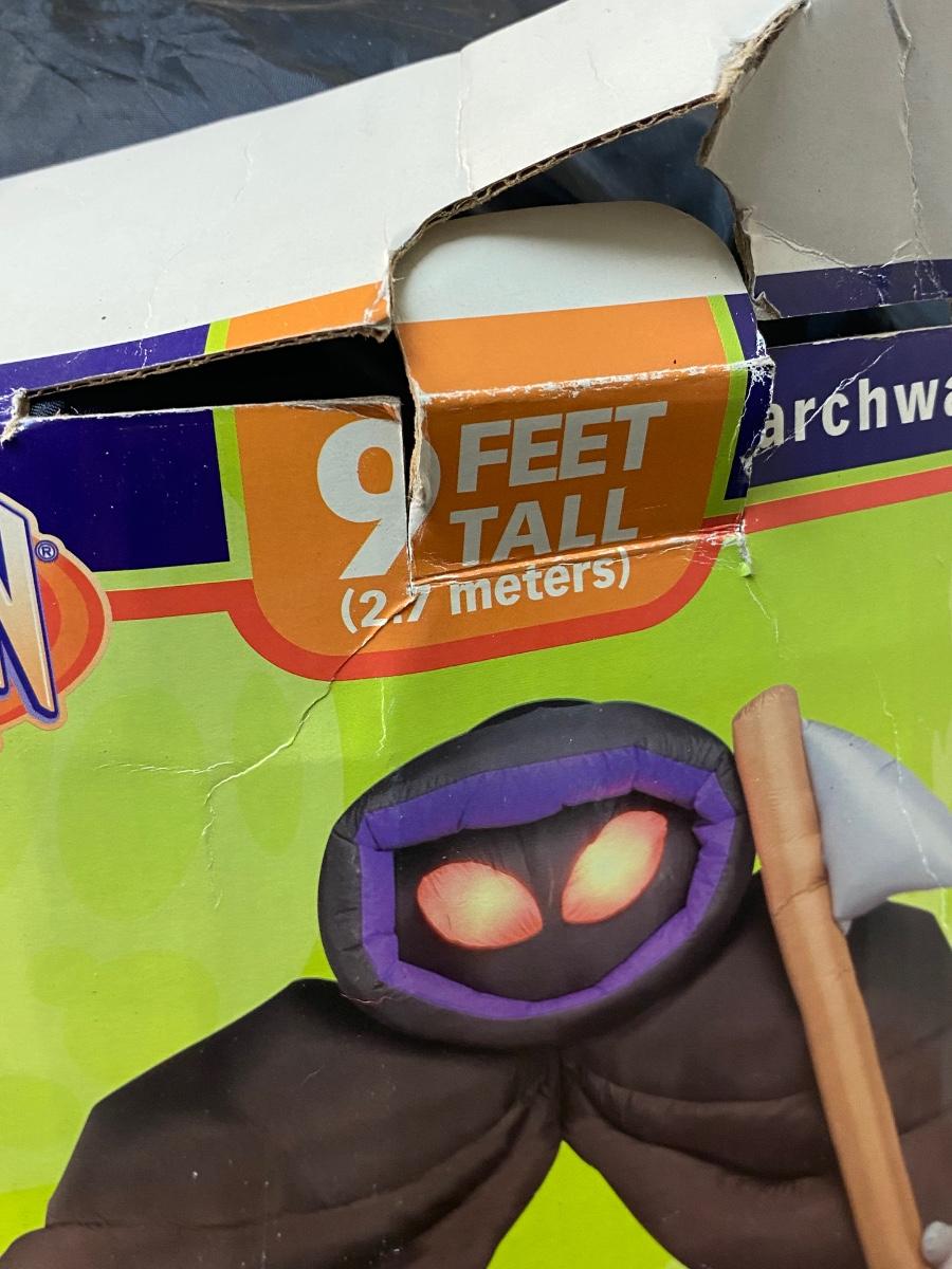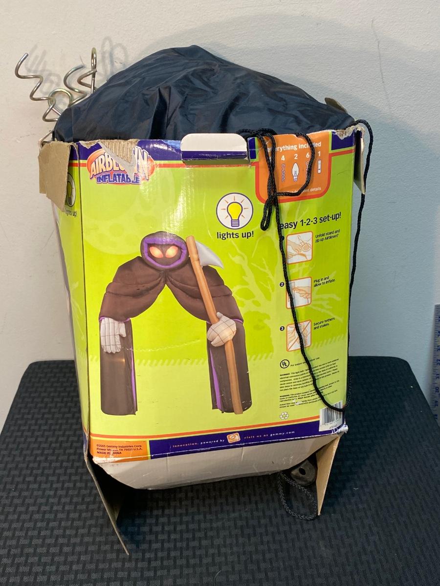9' Light Up Halloween Grim Reaper Death Archway Inflatable Yard Decor. In good condition. Has original box and ground stakes. Box is in poor condition, cannot get inflatable to fit properly inside of it.