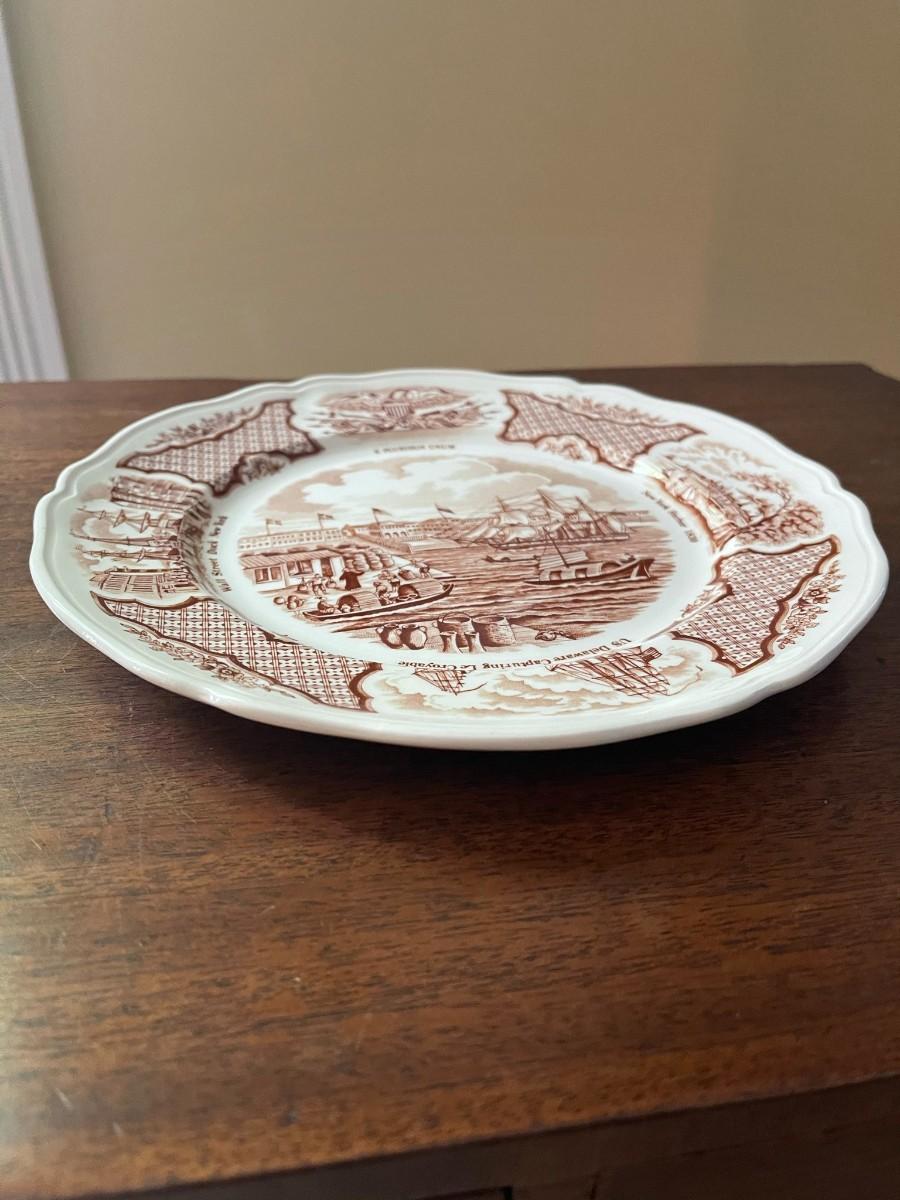 Alfred Meakin, Fair Winds, Brown, One Salad Plate. Staffordshire, England. Visuals include NY Harbor 1830, Wall St. Dock, US Delaware Capturing La Croyable, E Pluribus Unum.