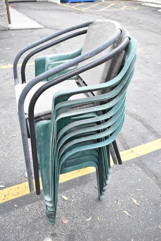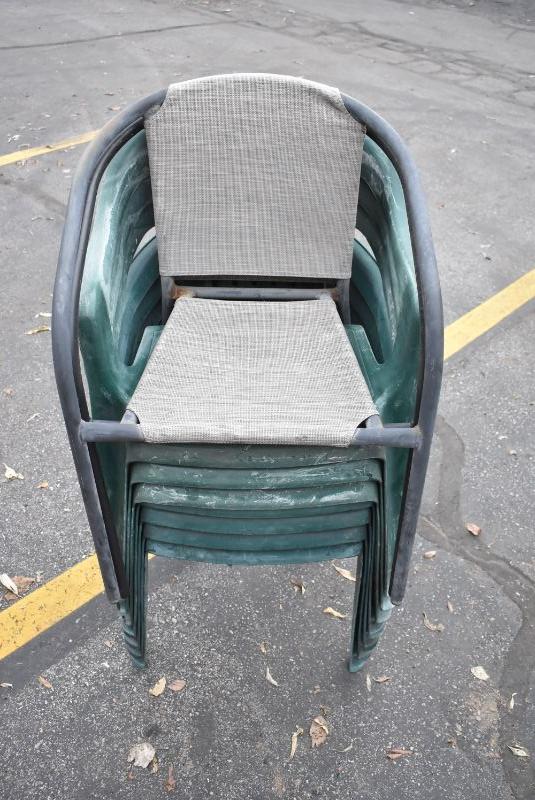 9 Outdoor Chairs: 7 Green Plastic & 2 Metal