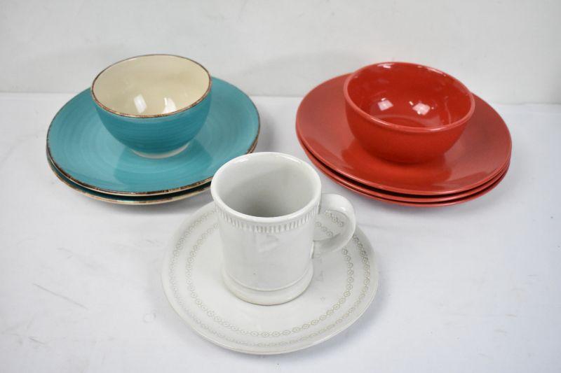 9 pc Dishes: Turquoise 2 Plates & 1 Bowl, Red 3 plates & 1 Bowl, Tan Plate & Cup
