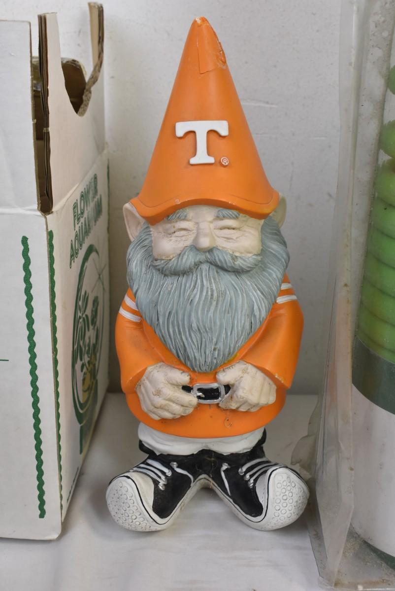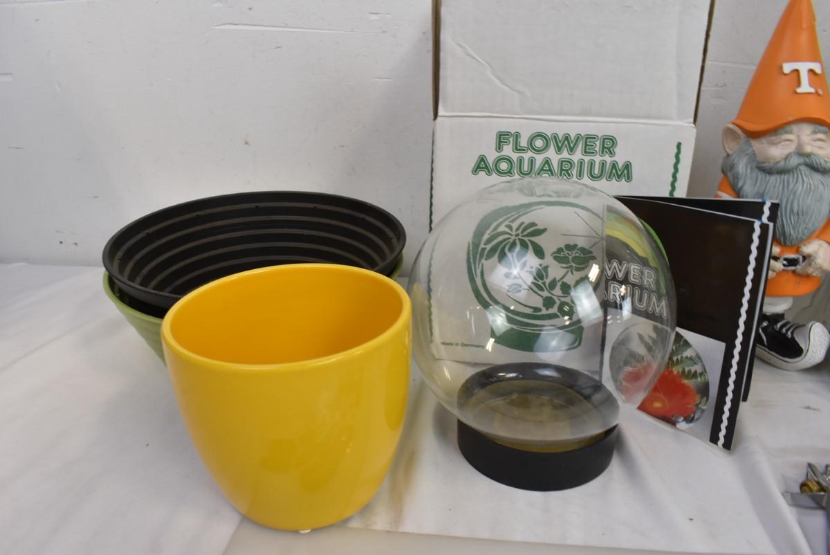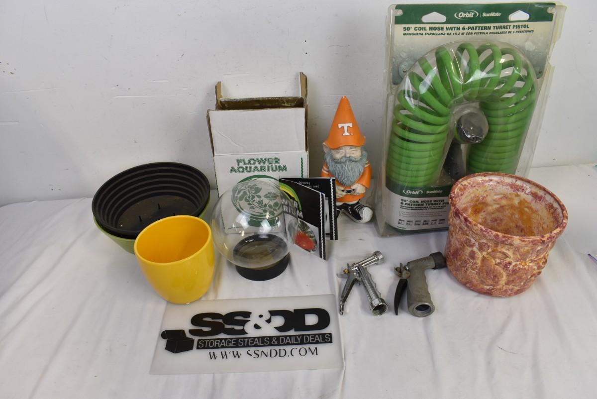 9 pc Gardening/Outdoor Decor: Garden Gnome, Flower Aquarium, Coil Hose