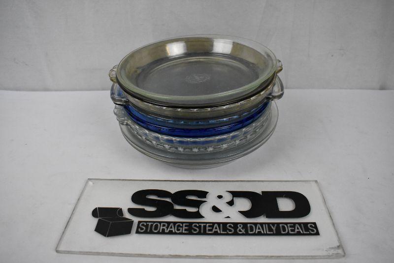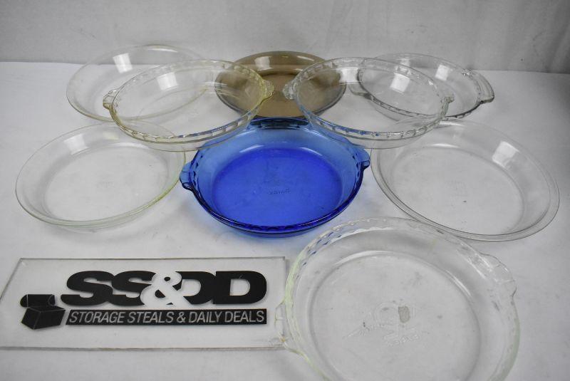 9 pc Glass Pie Plates: 8 pyrex 1 anchor hocking. 1 brown 1 blue 7 clear