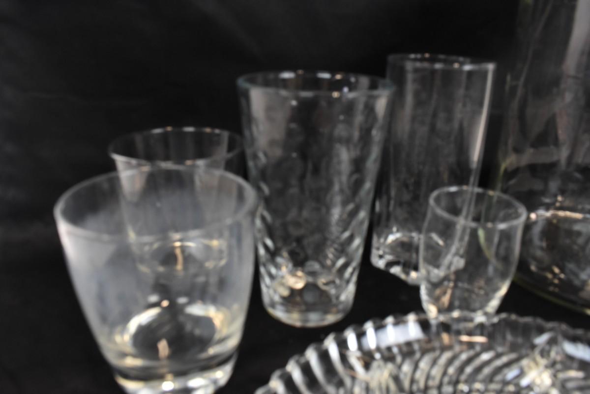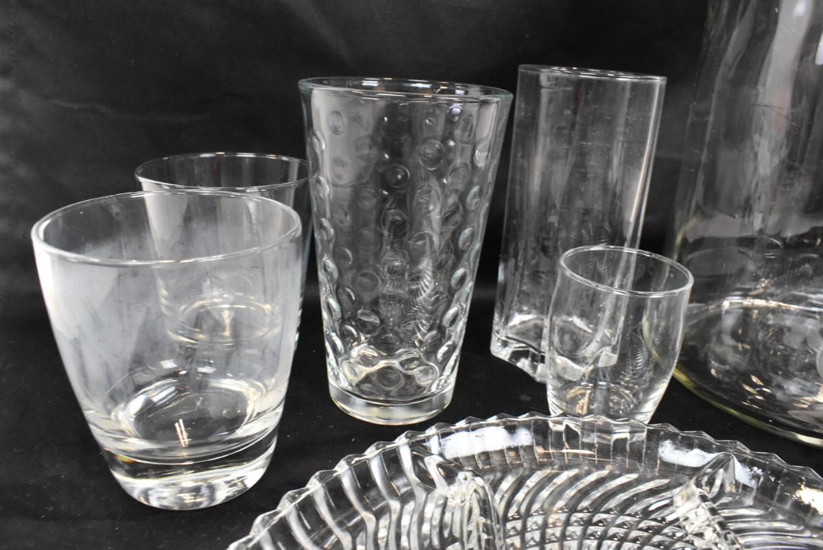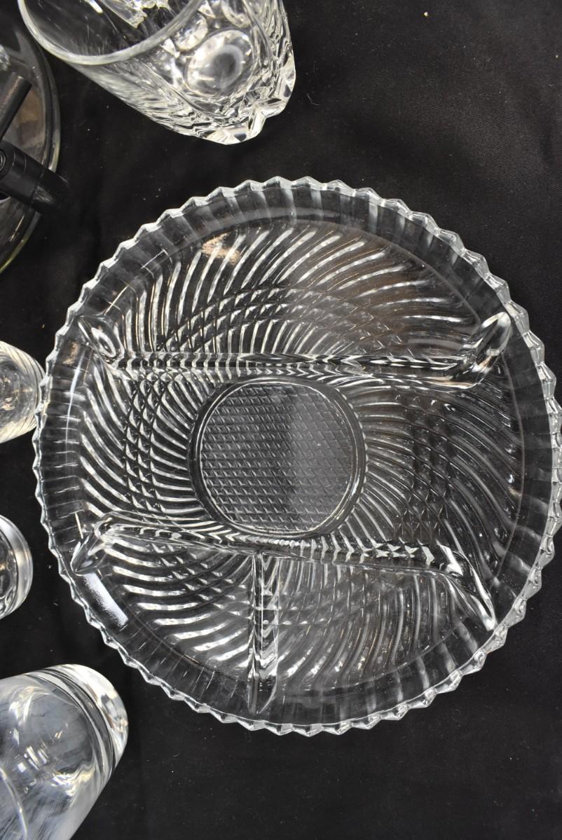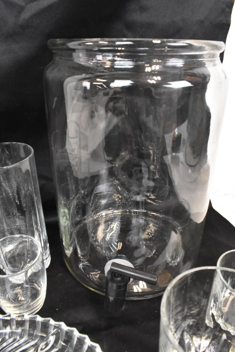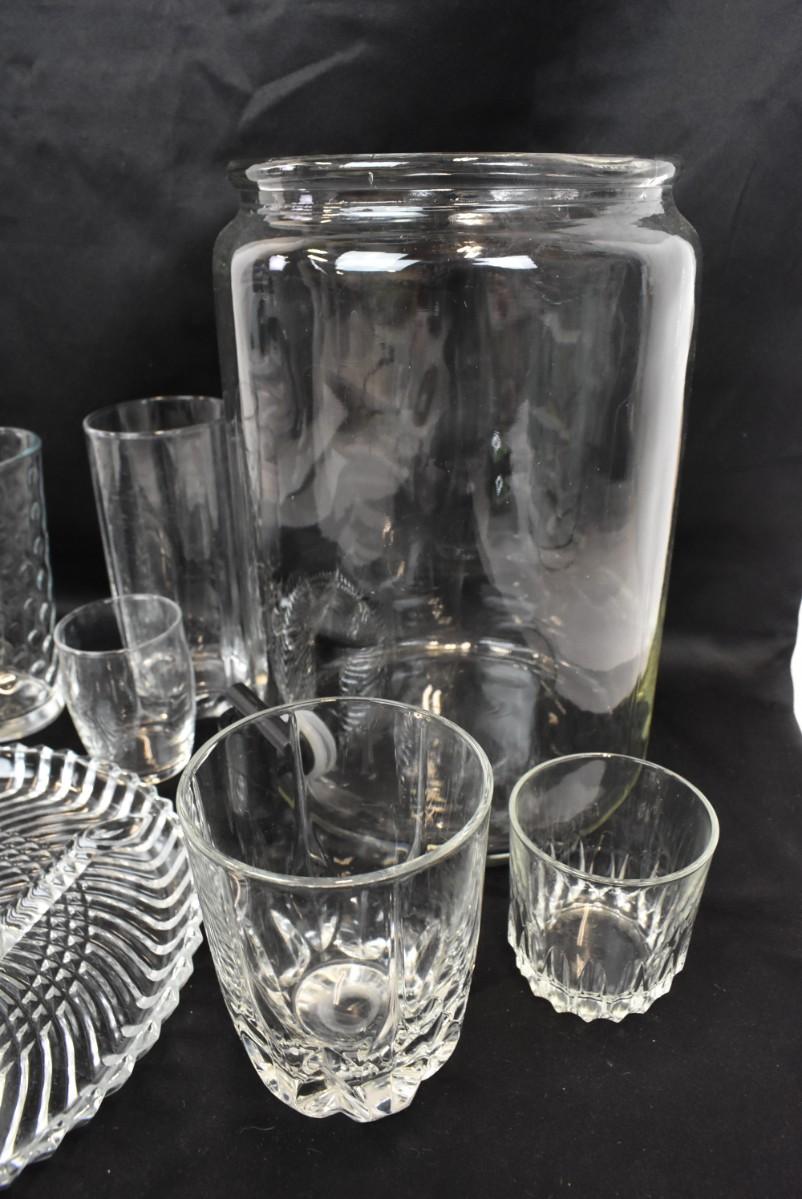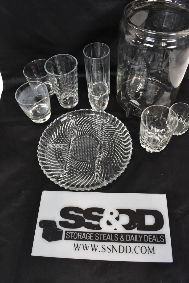 9 pc Glassware, Platter, Liquid Dispenser, 7 Glasses, assorted Sizes