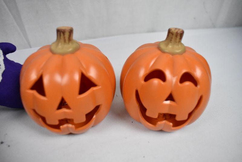 9 pc Holiday Decor: Halloween/Fall/Thanksgiving: Candy Bowl, 6 pumpkins, Pumpkin Head Doll, & Spider Webs