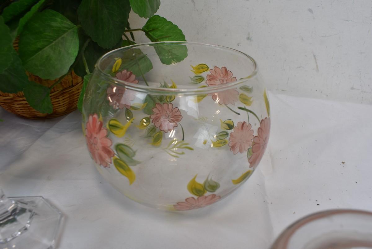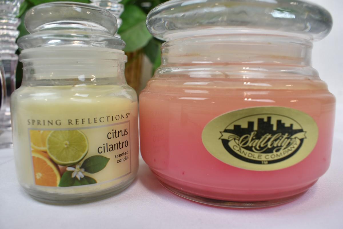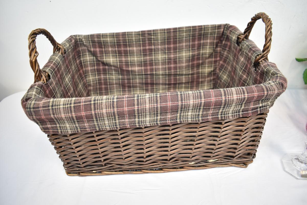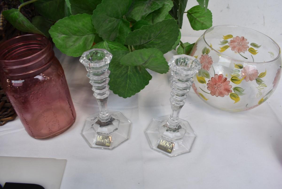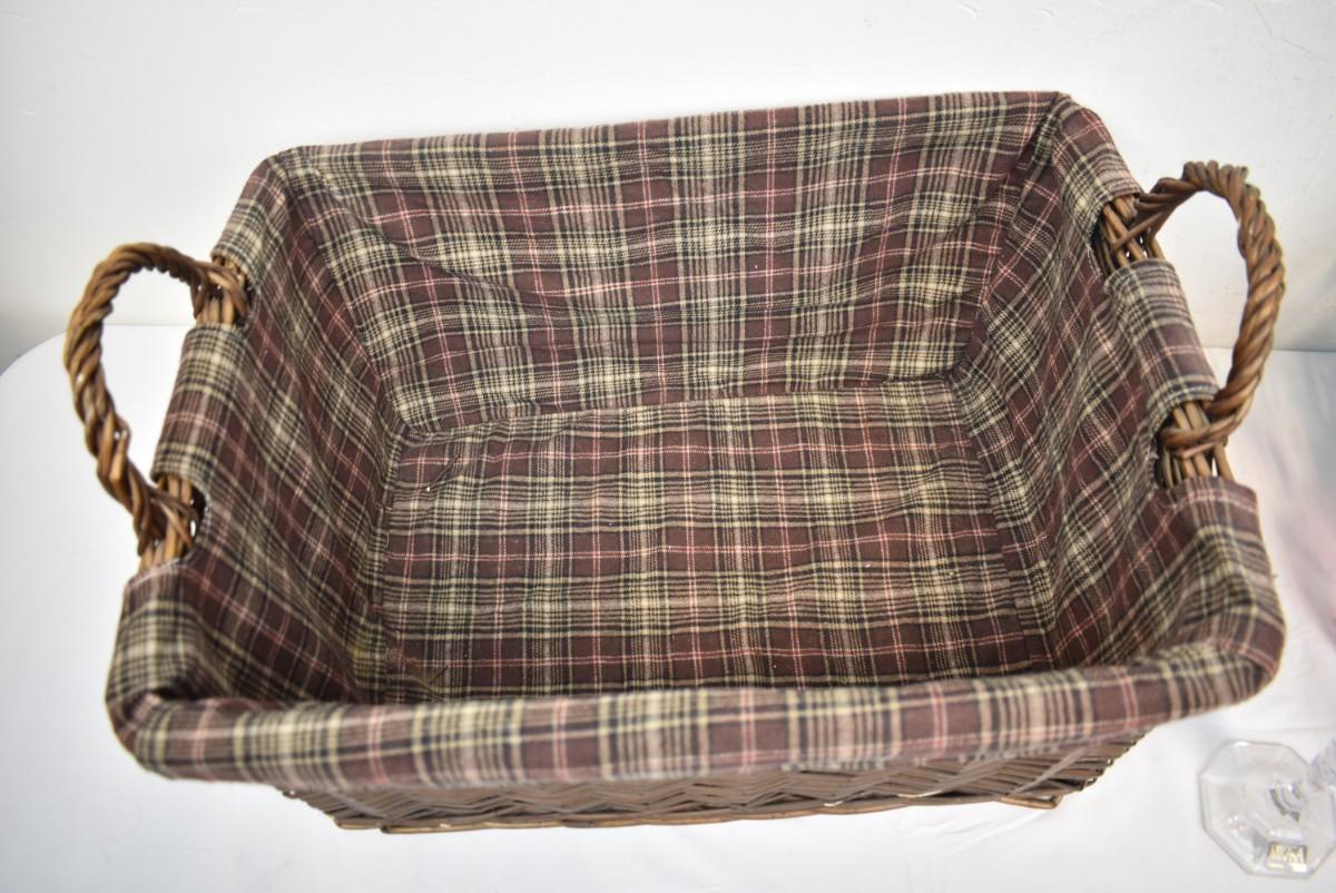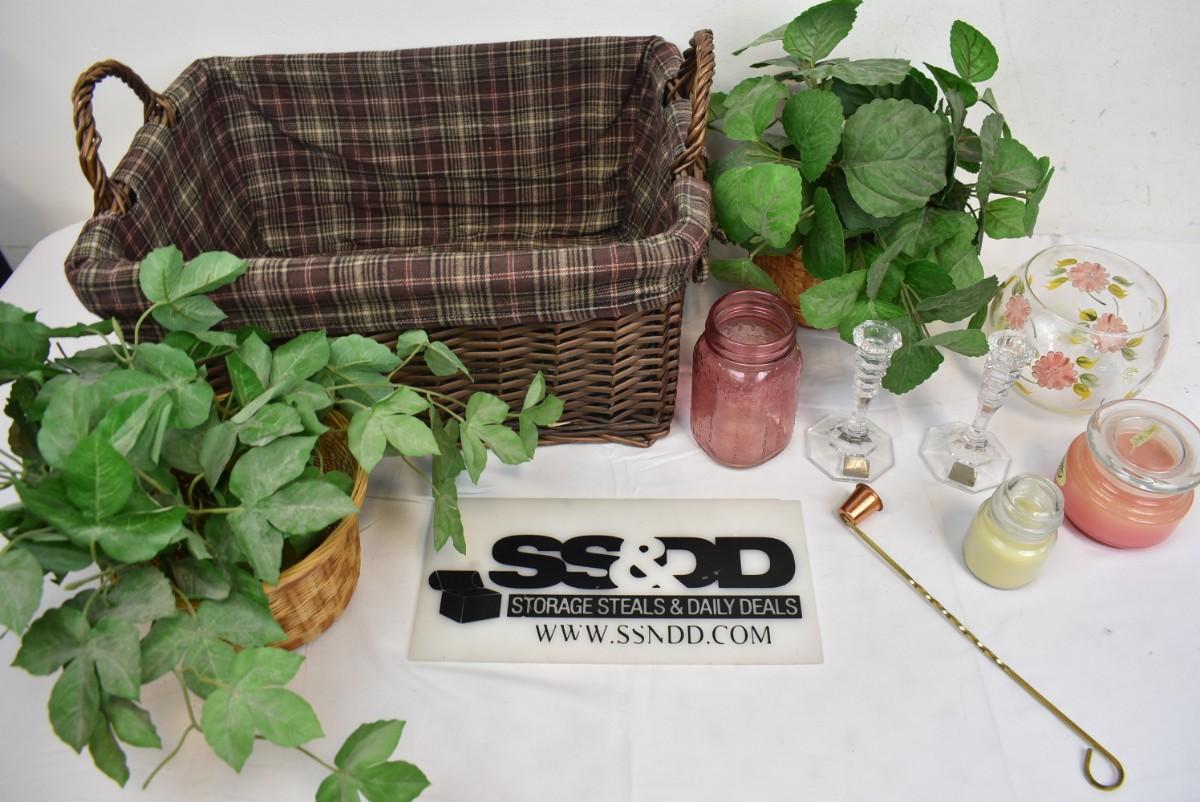 9 pc Home Decor: Large Wicker Basket, Candle Holders, Faux Plants
