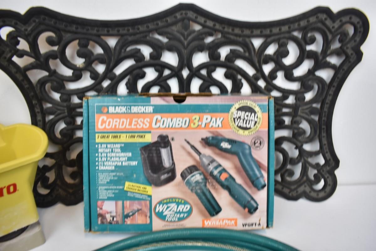 9 pc Outdoor Home: Doormat, Hose, Cordless tools, Sprinkler, etc
