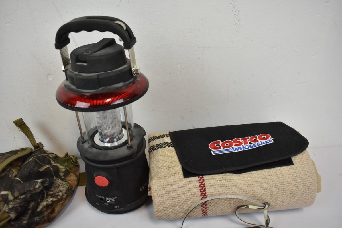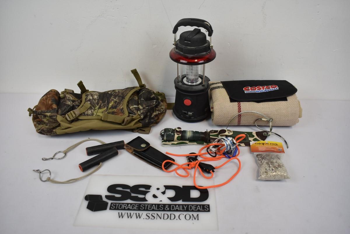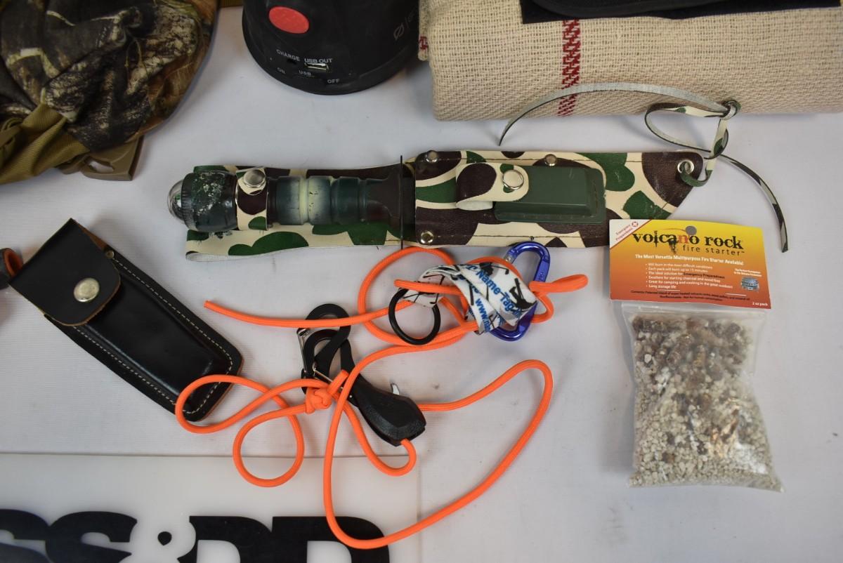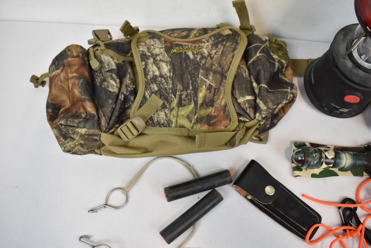 9 pc Outdoor/Hunting: Waist pack, Lantern, Blanket, 2 knives, Firestarter