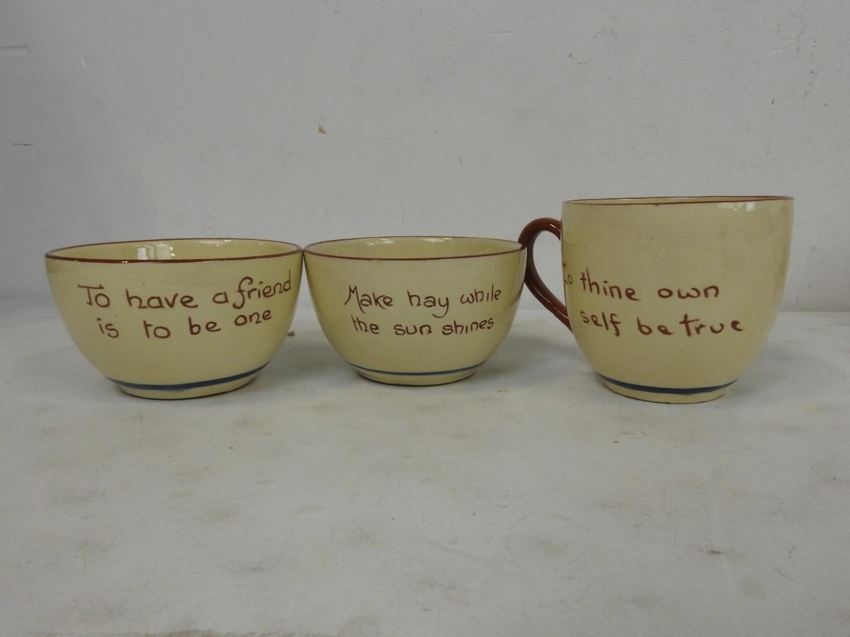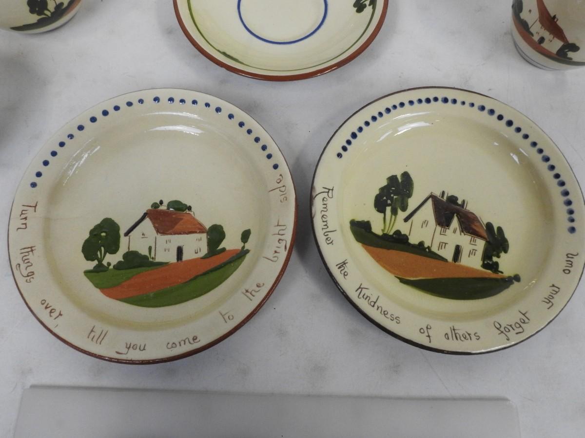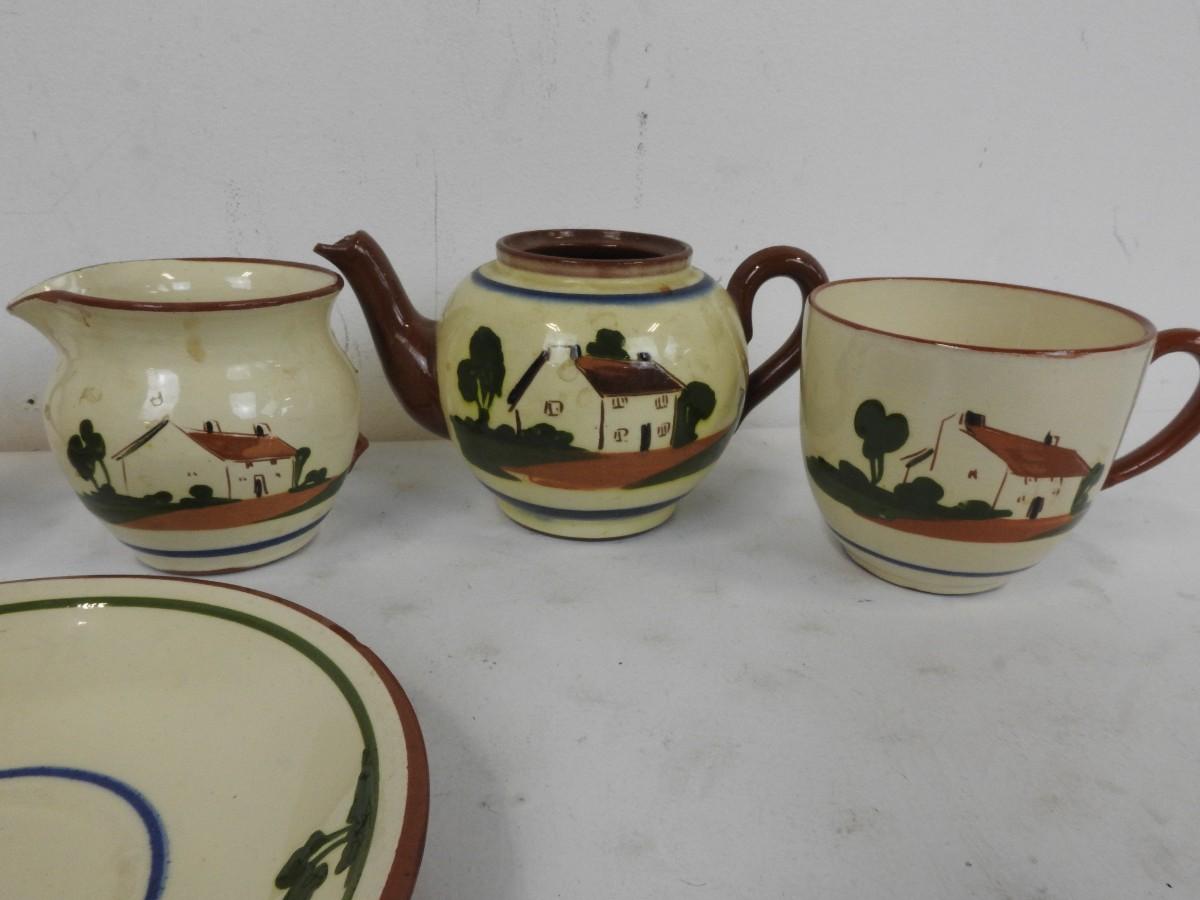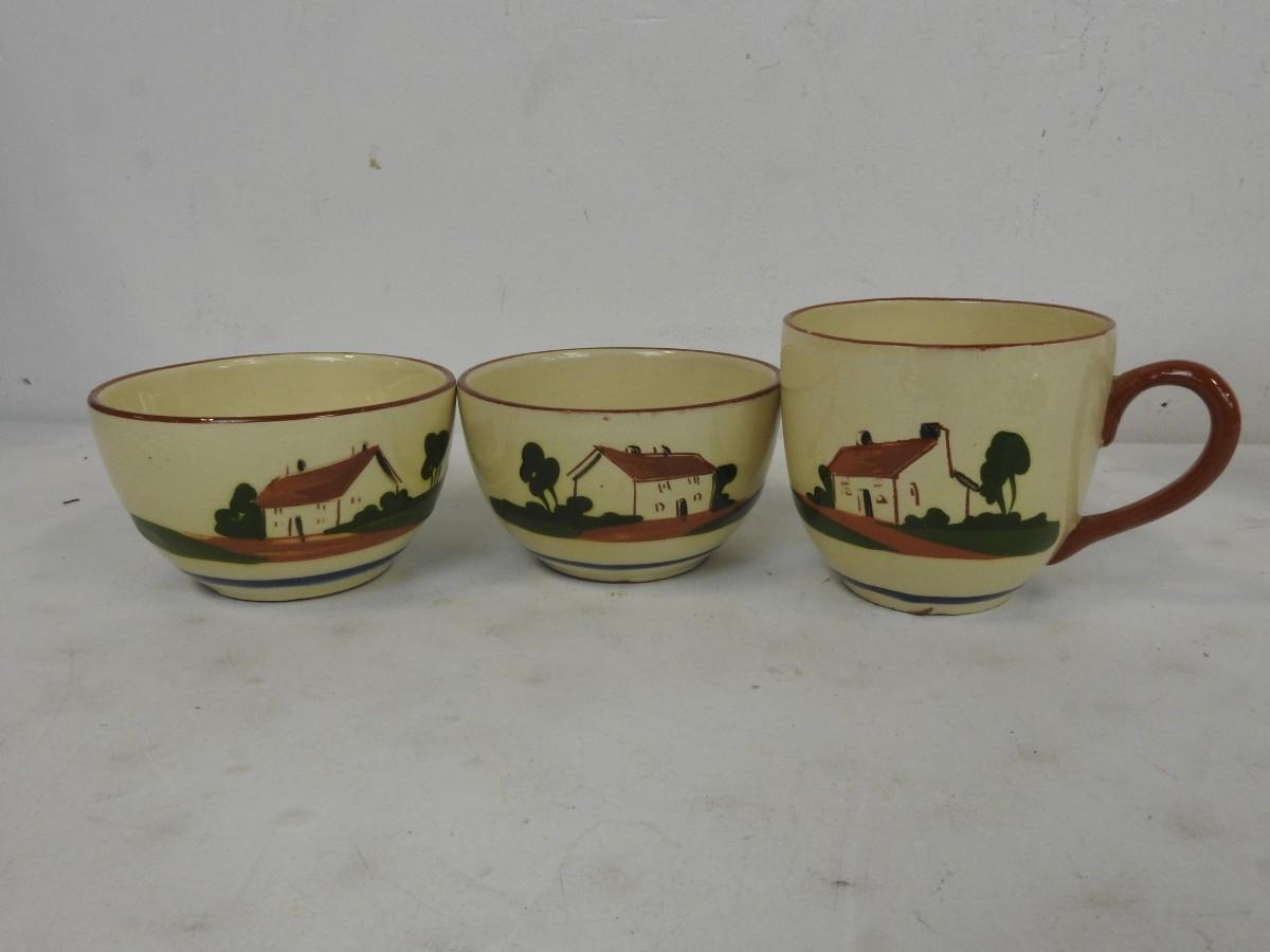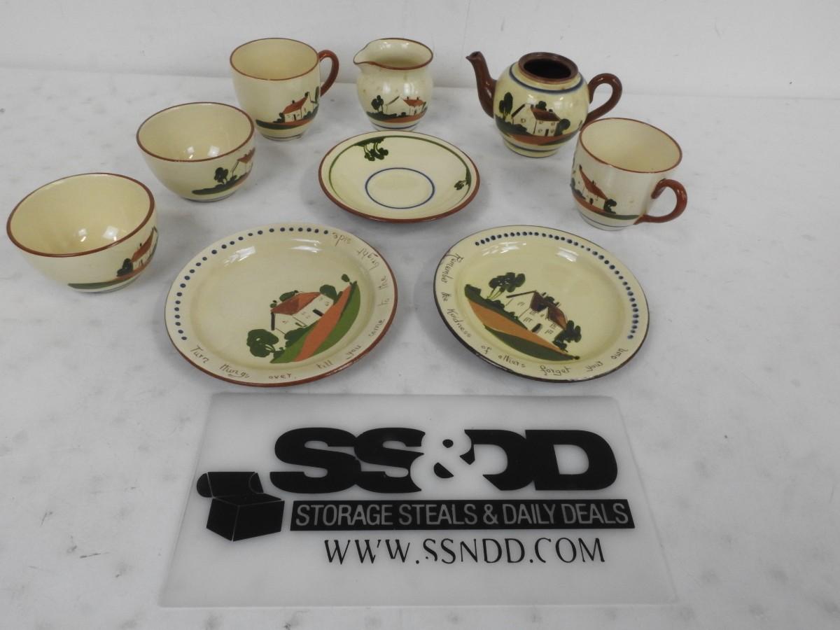 9 pc Tea Set: 2 plates, Shallow bowl, 2 bowls, 2 mugs, tea pot, creamer pitcher
