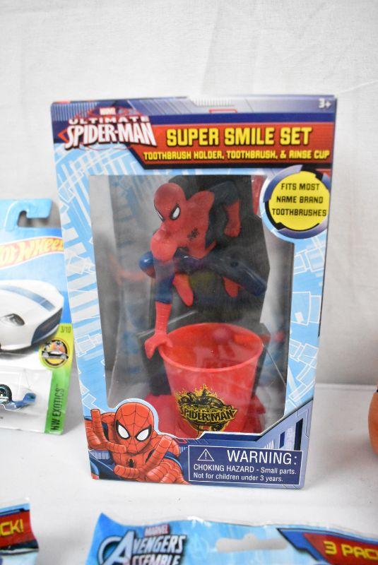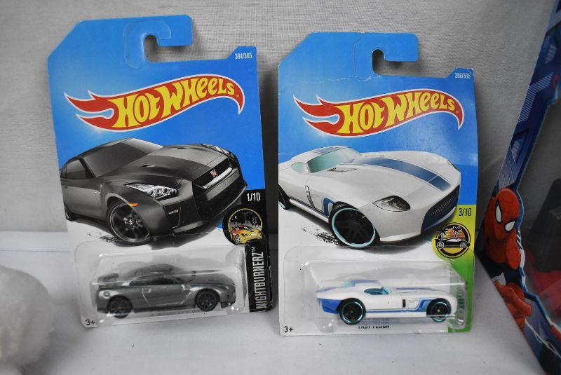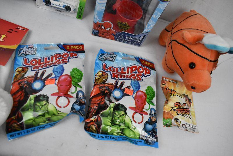 9 pc Toys: Dino Kite, Soccer Santa Hat, Basketball Pig, Hot Wheels, Lollipop Rings - New
