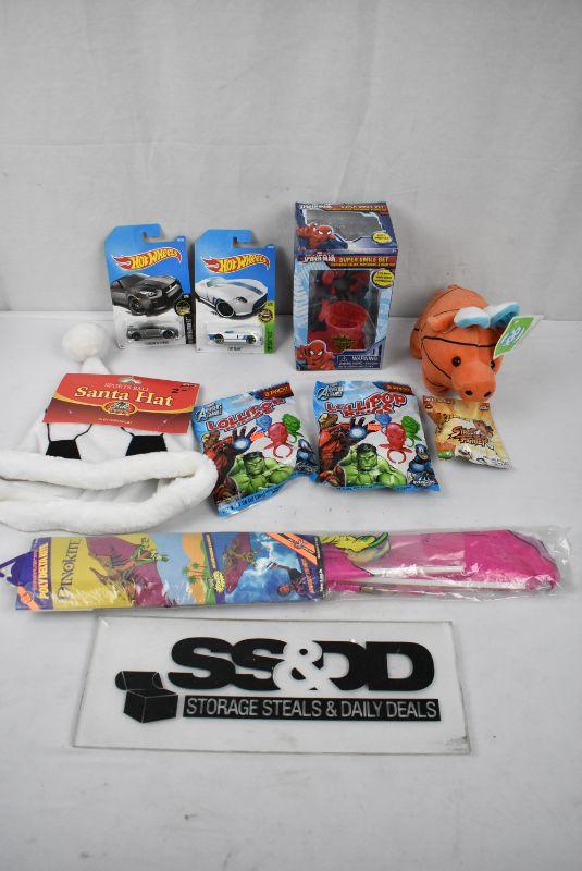 9 pc Toys: Dino Kite, Soccer Santa Hat, Basketball Pig, Hot Wheels, & More - New