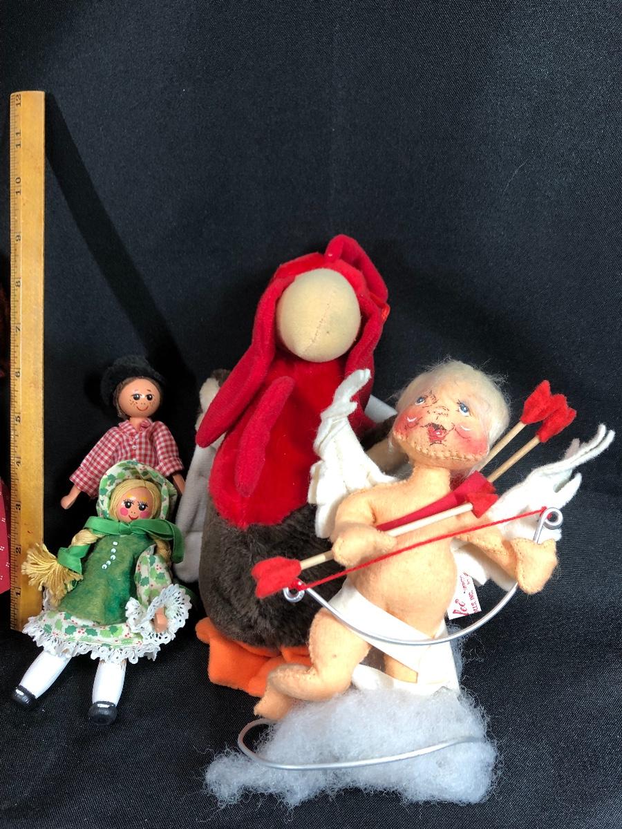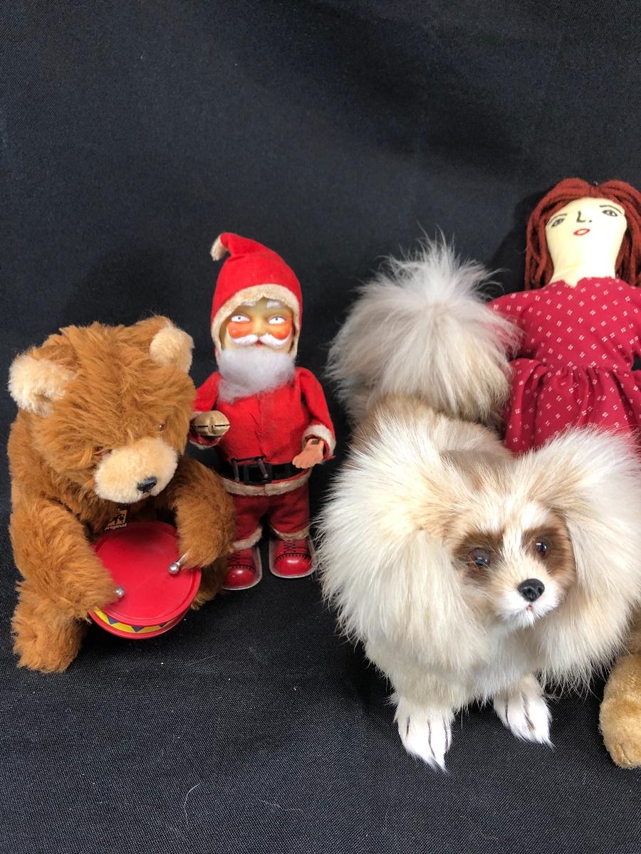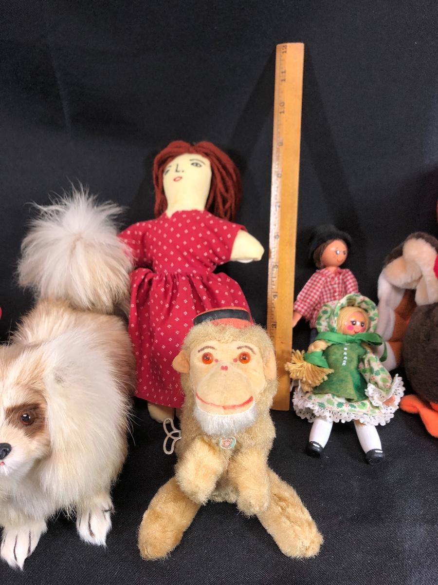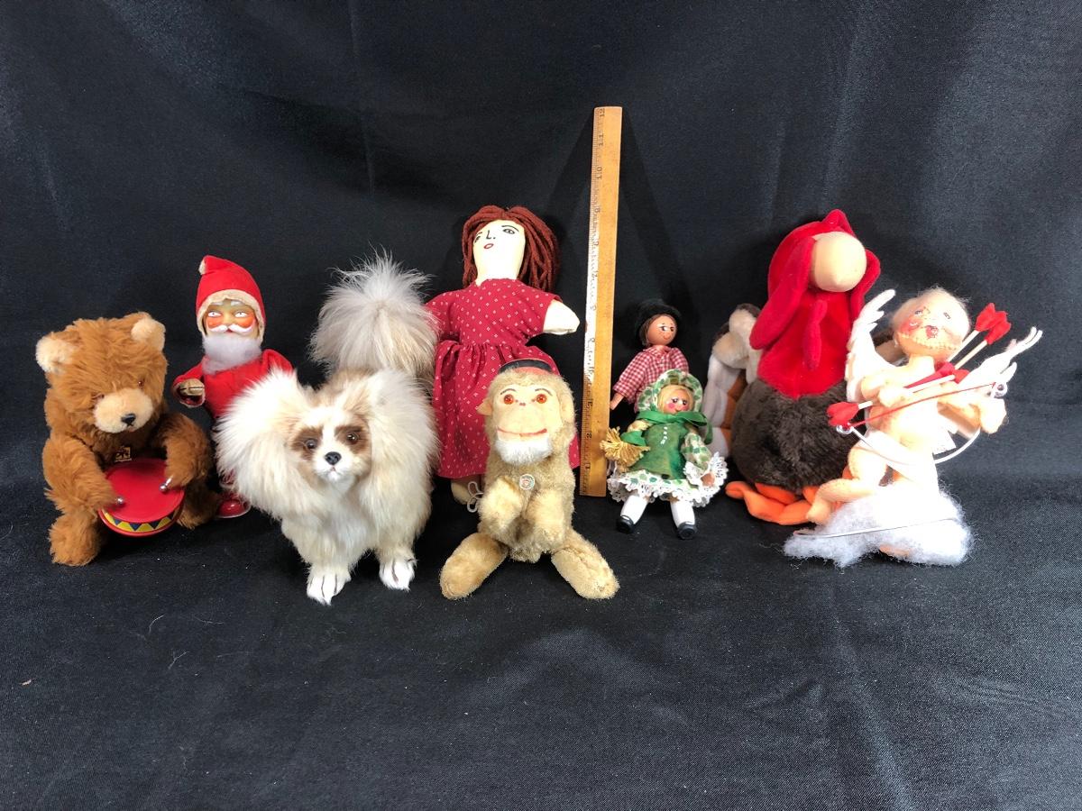 9 pc Vintage toy lot - windup, wood dolls, plush, AnnaLee etc