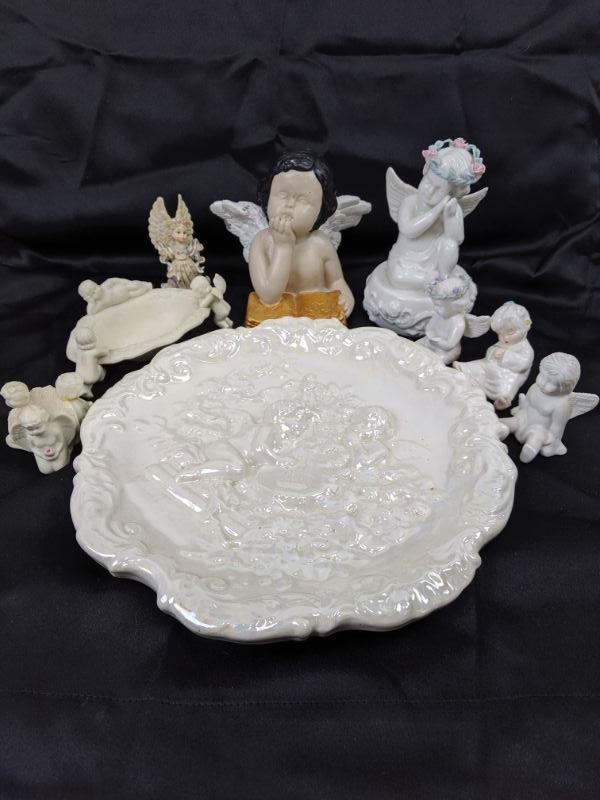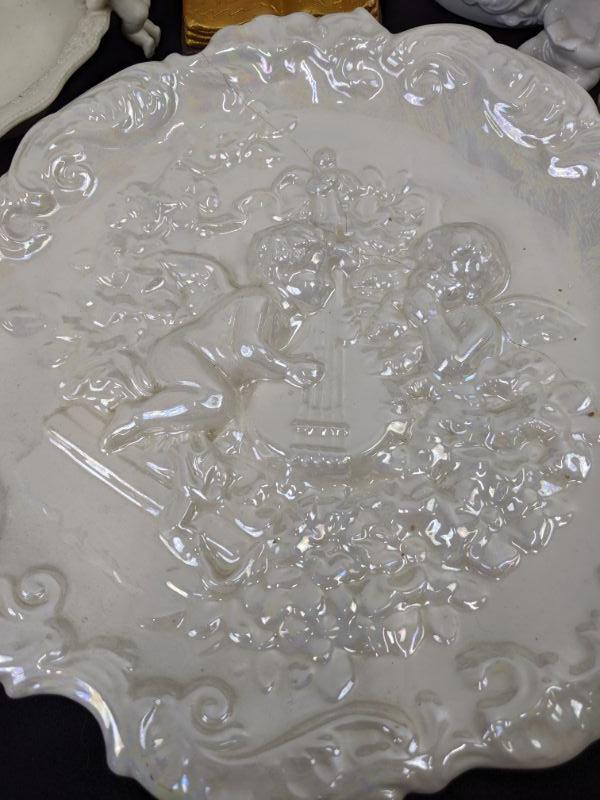 9 Piece Cherubs Lot - Most Ceramic, Some Hard Plastic - Large Plate Has Been Repaired