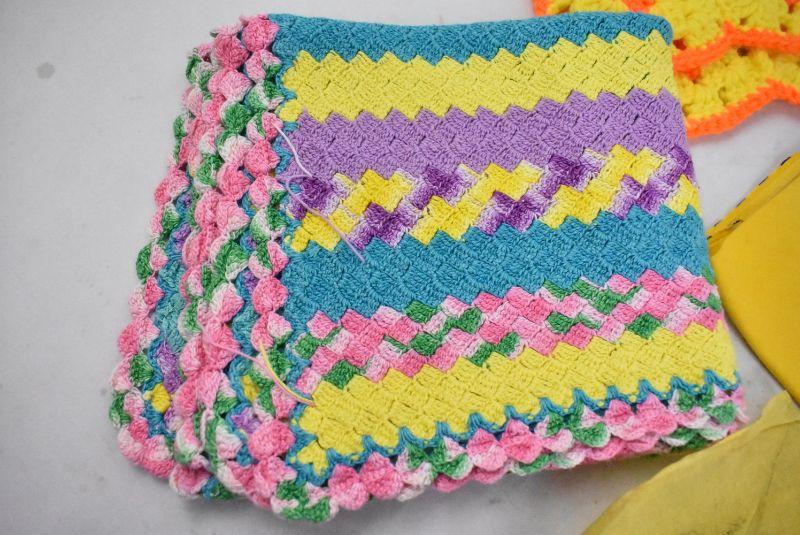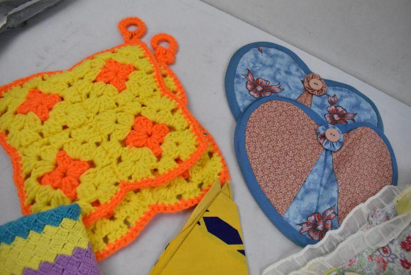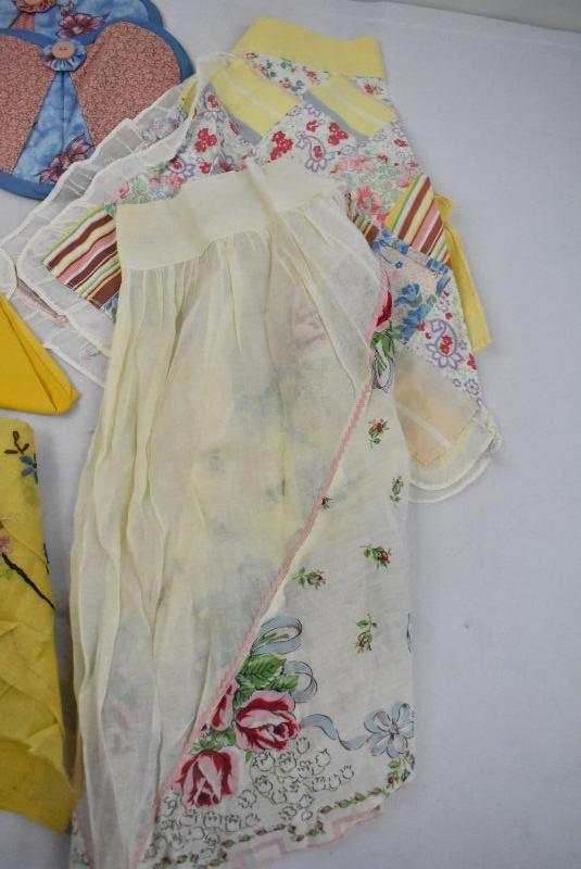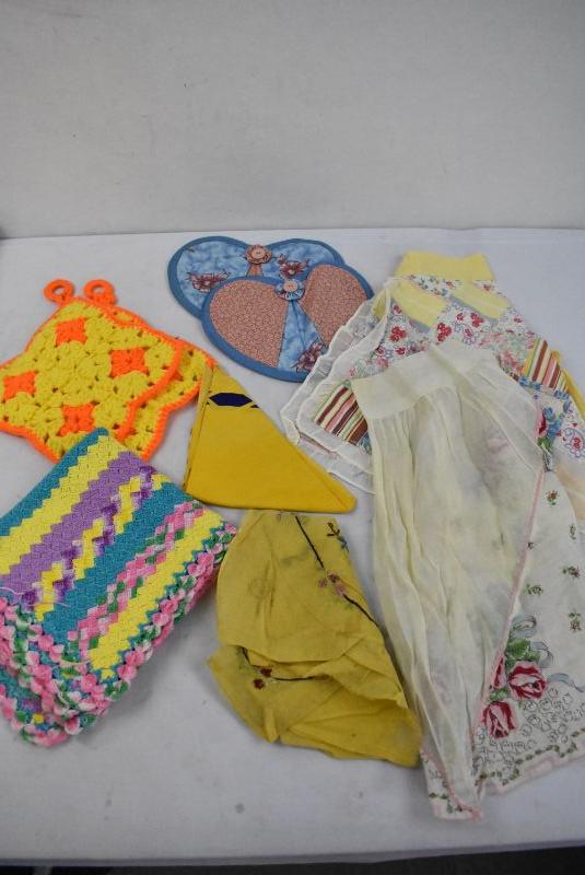 9 Piece Vintage Fabrics: 4 Hot Pads, 2 Aprons, 1 Blanket, and 2 Hankies