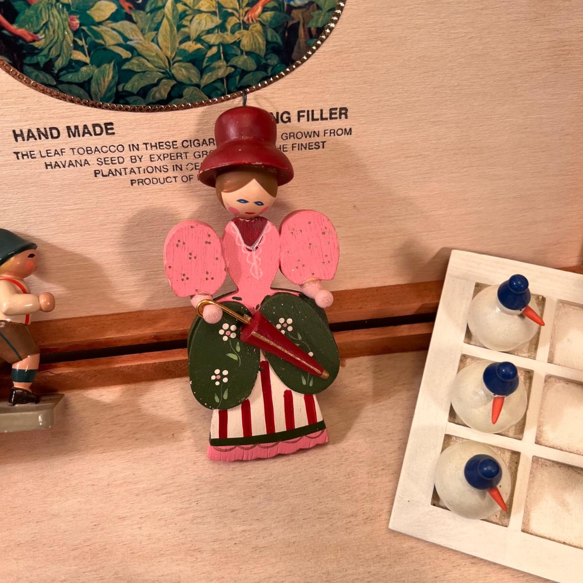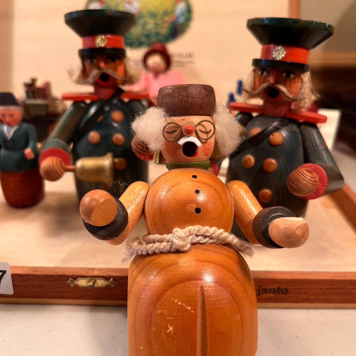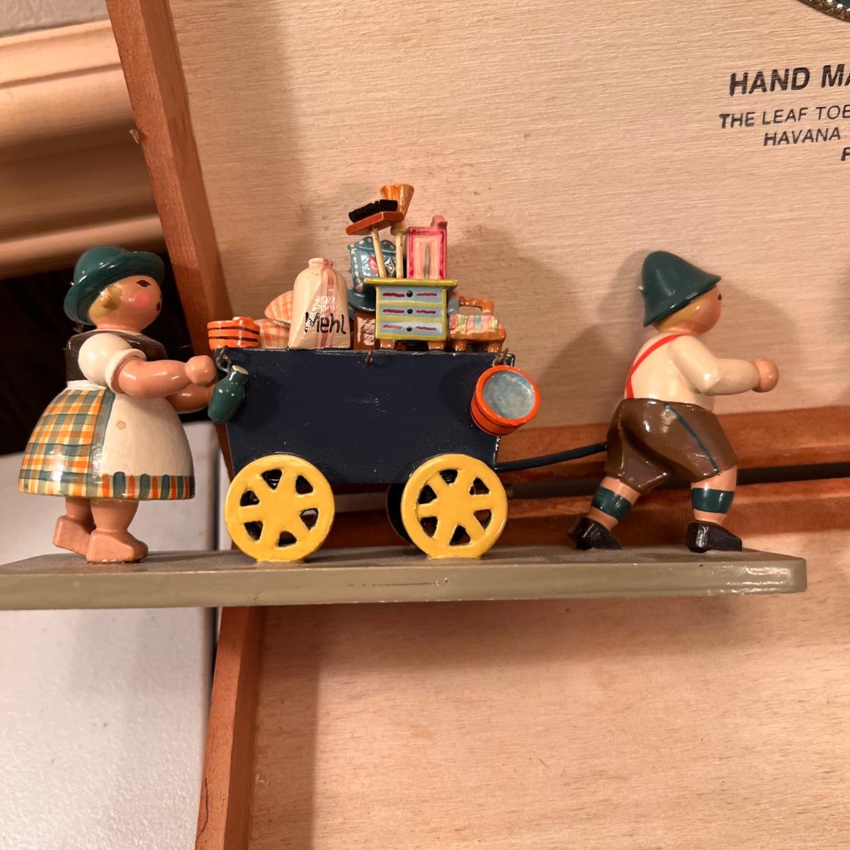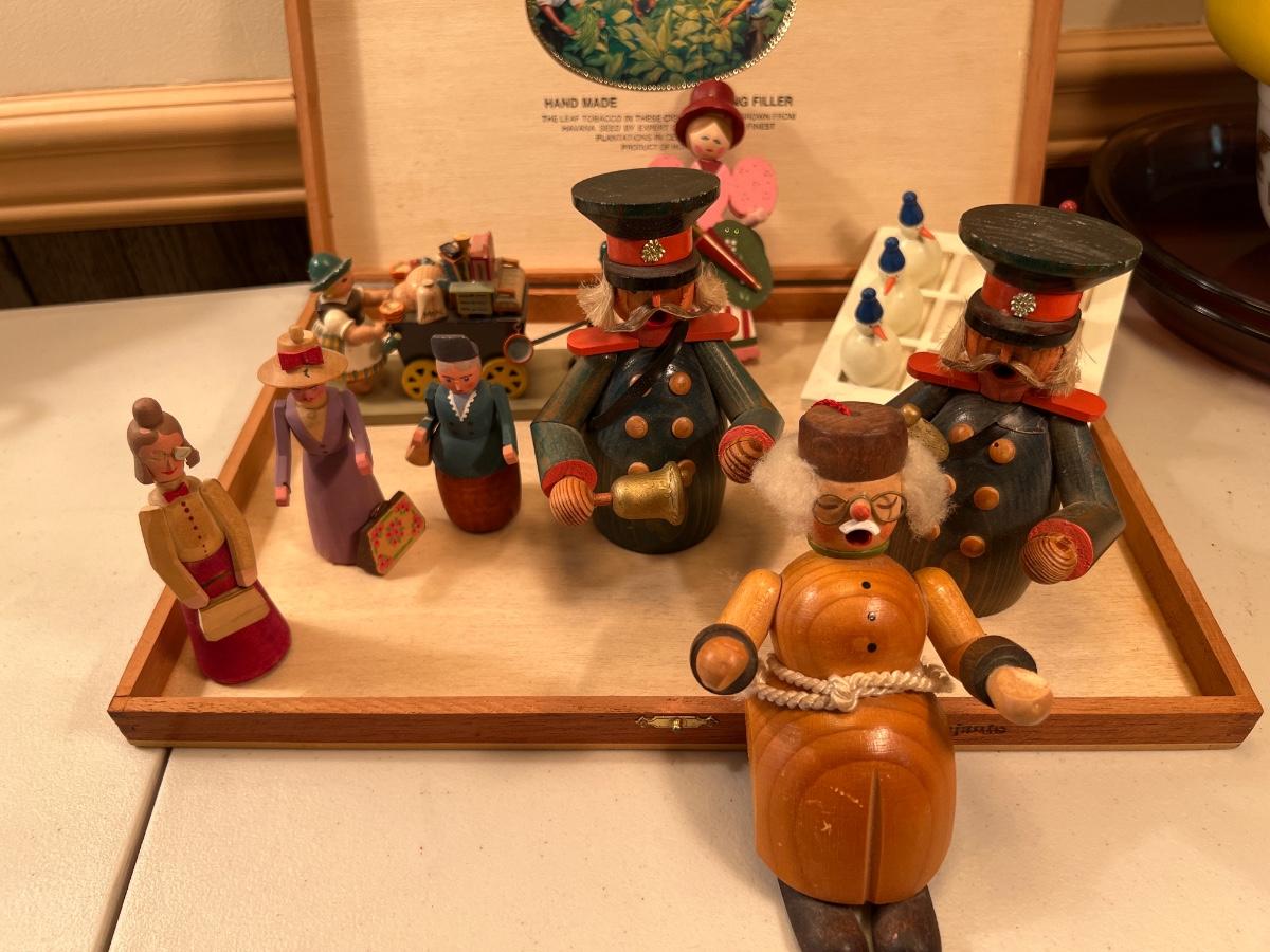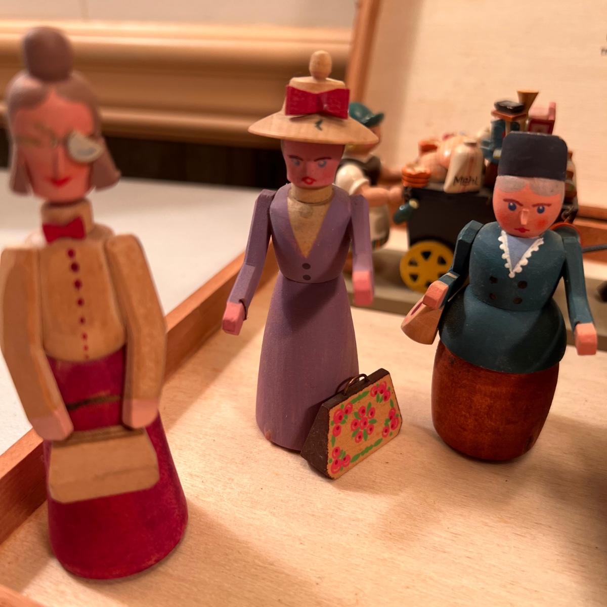 Erzgebirge original wood art miniature figures 3 ladies vintage seiffenfiguren german folk art, Erzgebirge girl and boy with cart, 3 larger wooden German figures without bases, snowman tick tack toe set and woman ornament