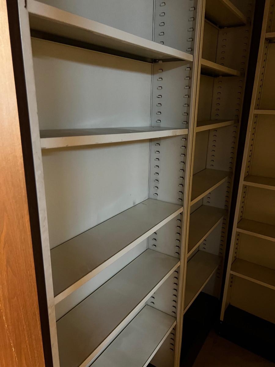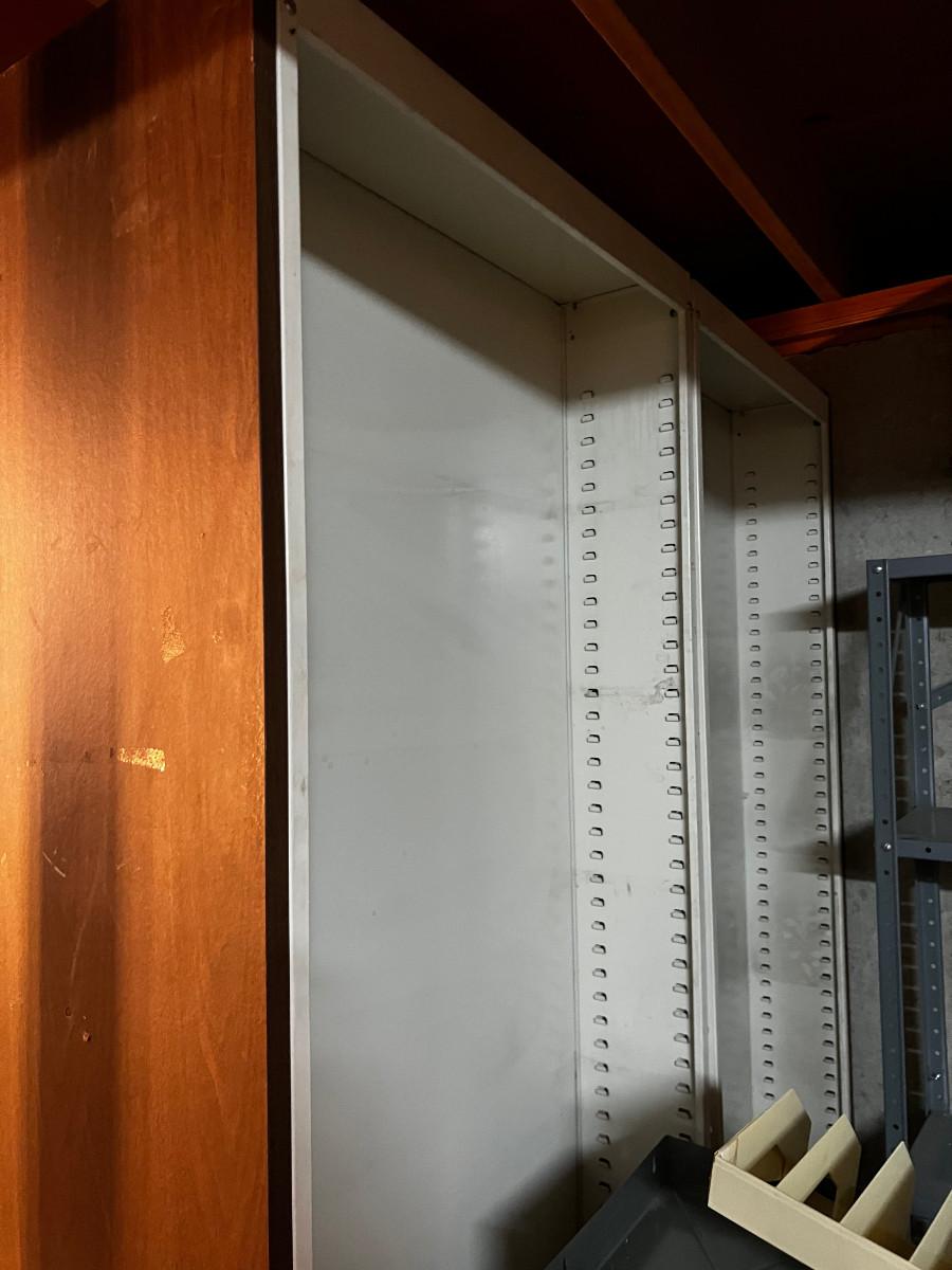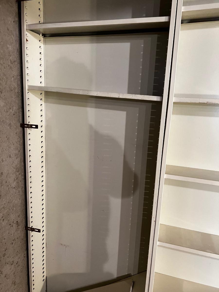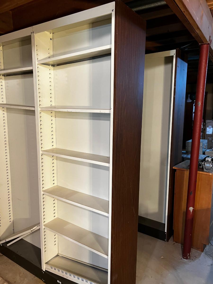 Double Sided. Tall. May be missing a few shelves. METAL 58" X 15" X 86" In Basement! Must be prepared to move yourself out of basement. 9 Total Bring Wrench and screwdrivers