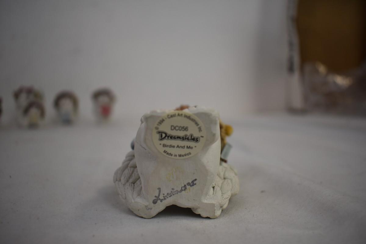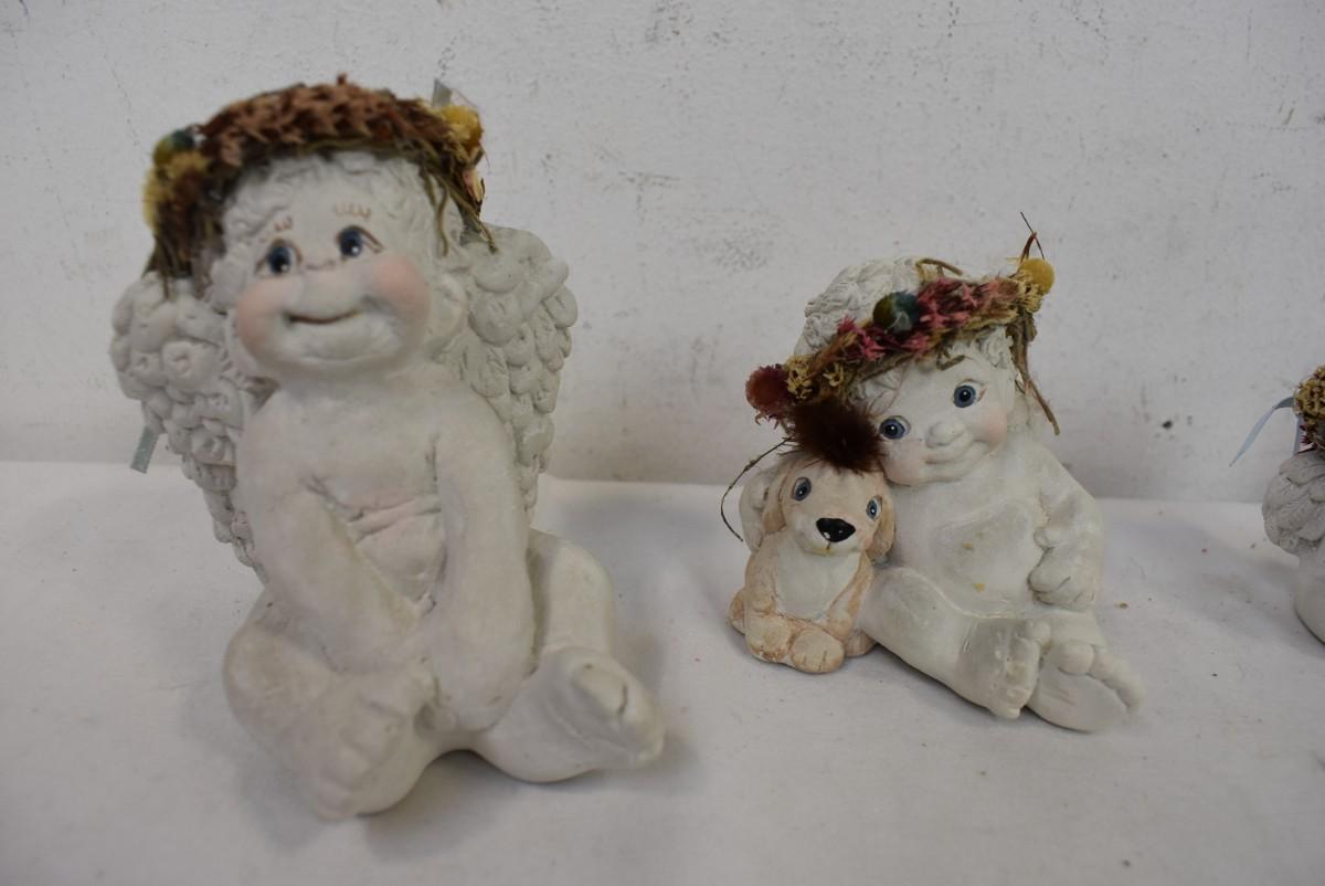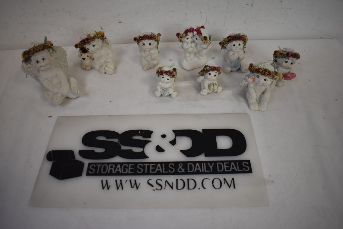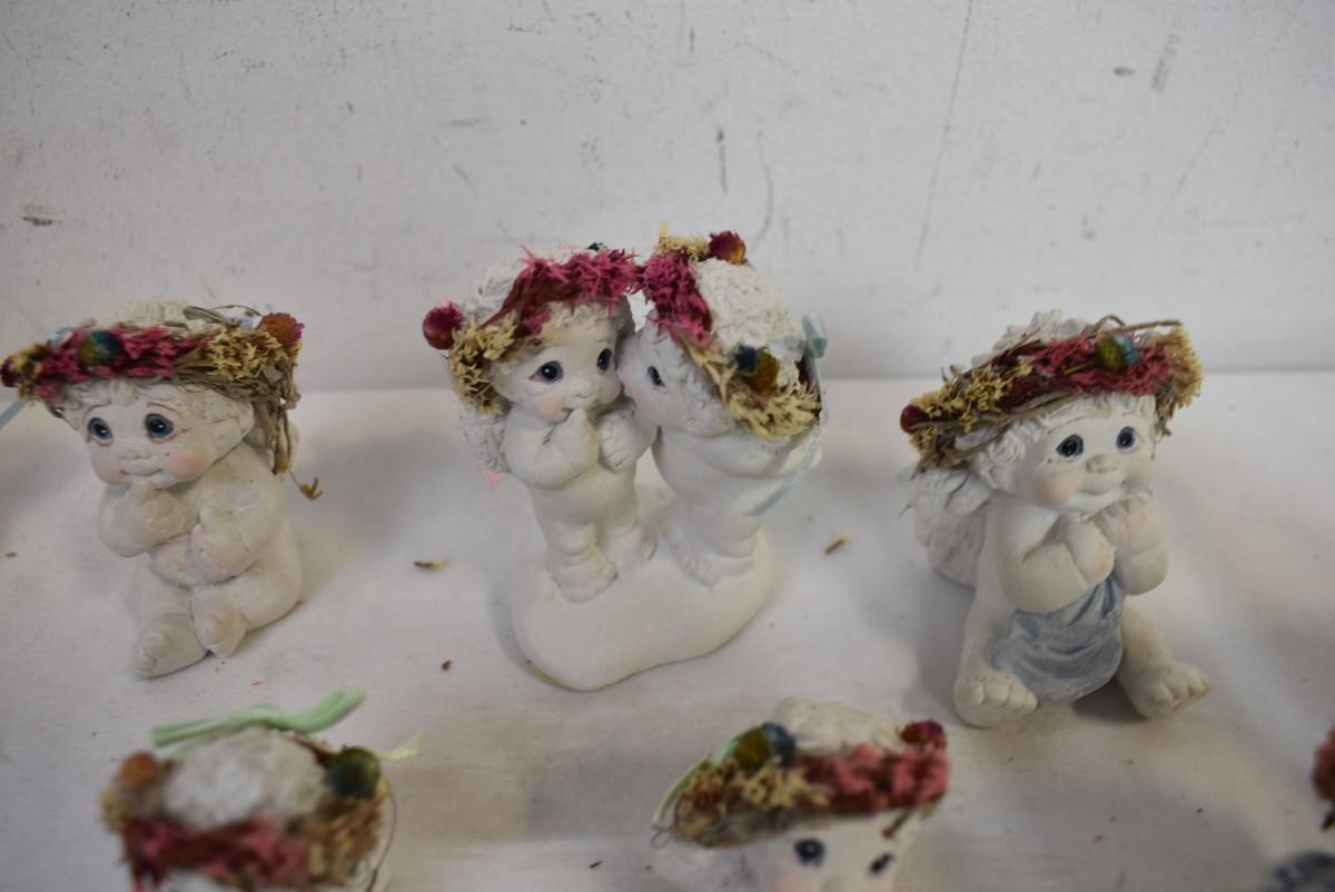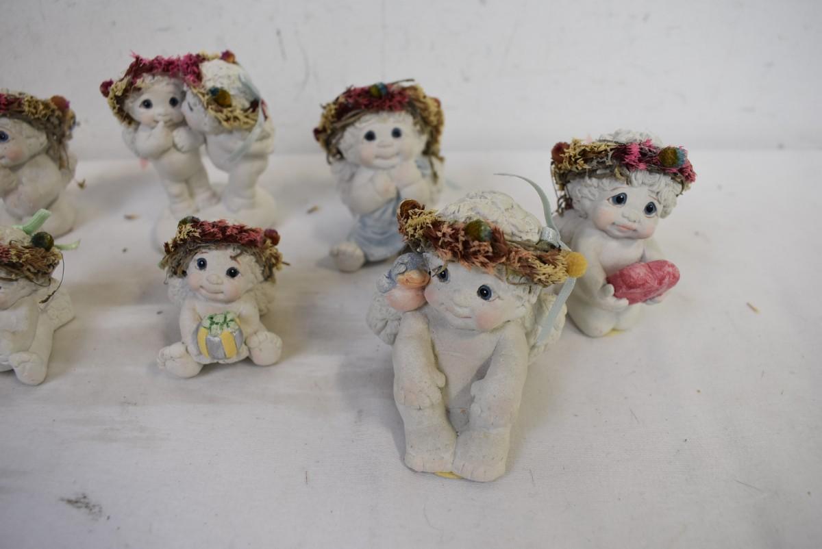 9 Small Angel Statues with Floral Wreathes, Good Condition