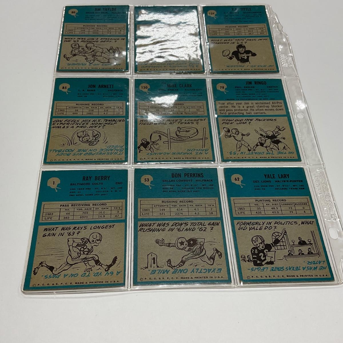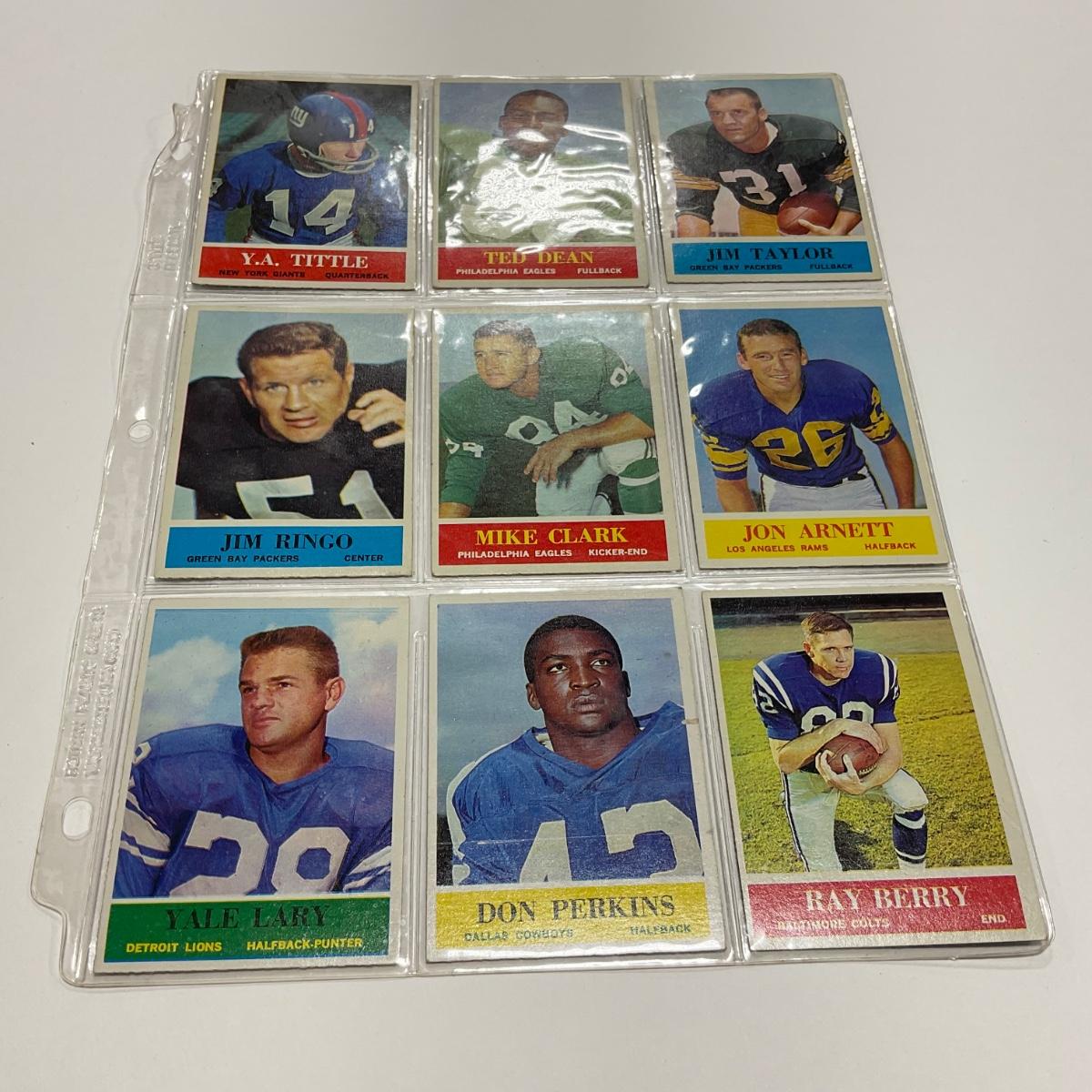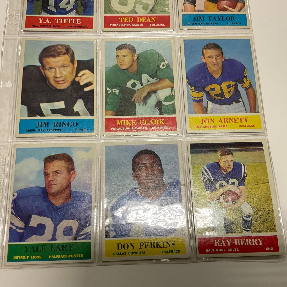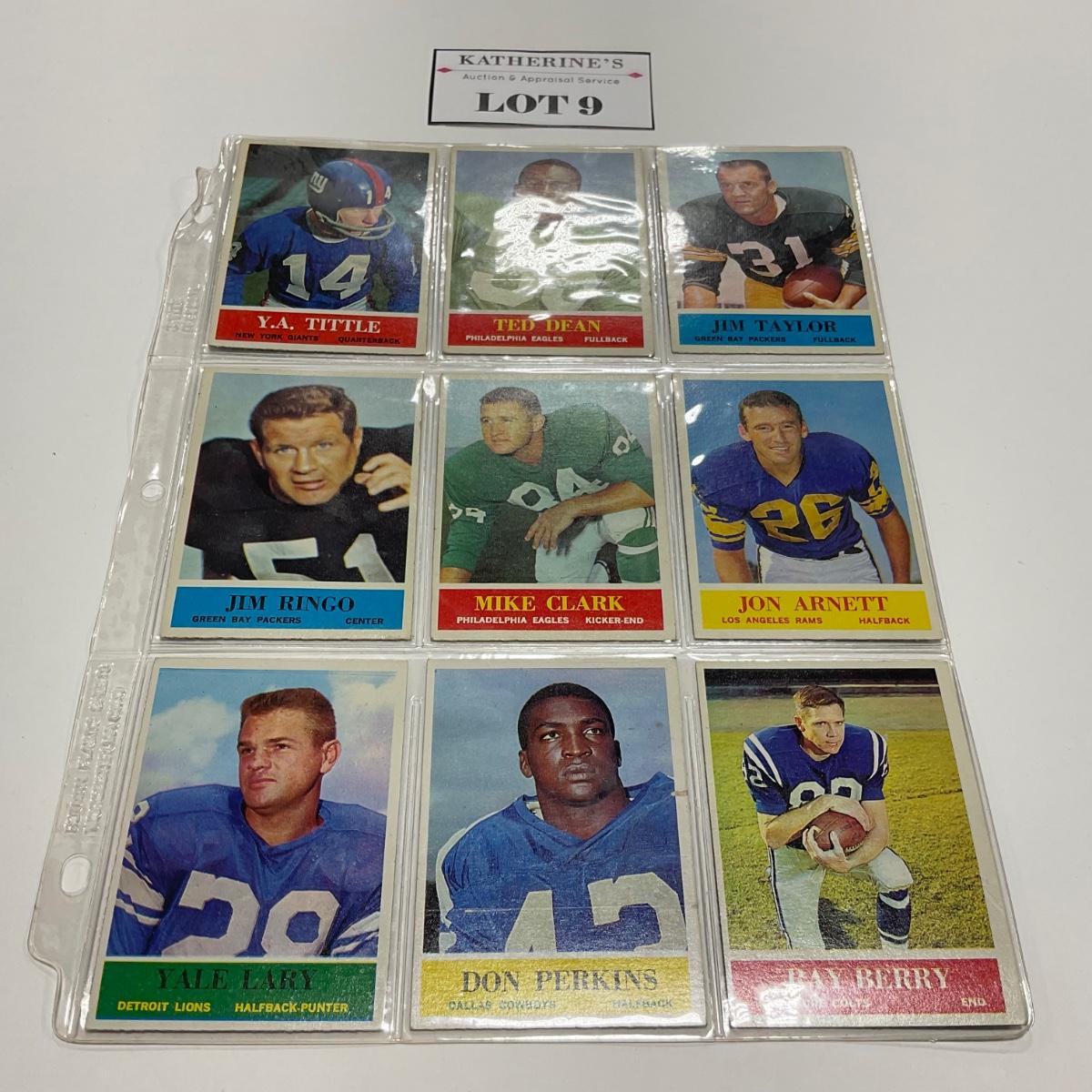 Nine vintage football cards including: Y.A. Tittle, Ted Dean, Jim Taylor, Jim Ringo, Mike Clark Jon Arnett, Yale Larry, Don Perkins, and Ray Berry sports cards. Please see photos for details and condition. ::: Shipping is available on this lot. If you require shipping you must let us know at the close of the auction. We will coordinate with you after the item has been won. Shipping fees will include insurance up to or exceeding the value of all items being mailed. If you have any questions regarding this lot please contact the auctioneer either via this website, by direct email or by phone. PICK UP TIMES and other important information can be found in the TERMS and DESCRIPTION of the auction. Please take a look for pertinent information. Thanks!