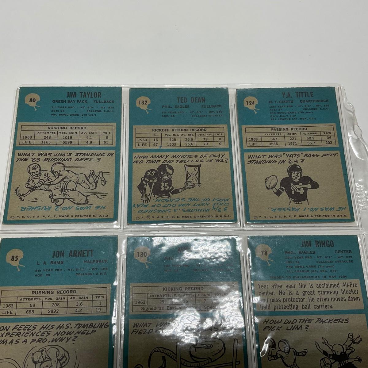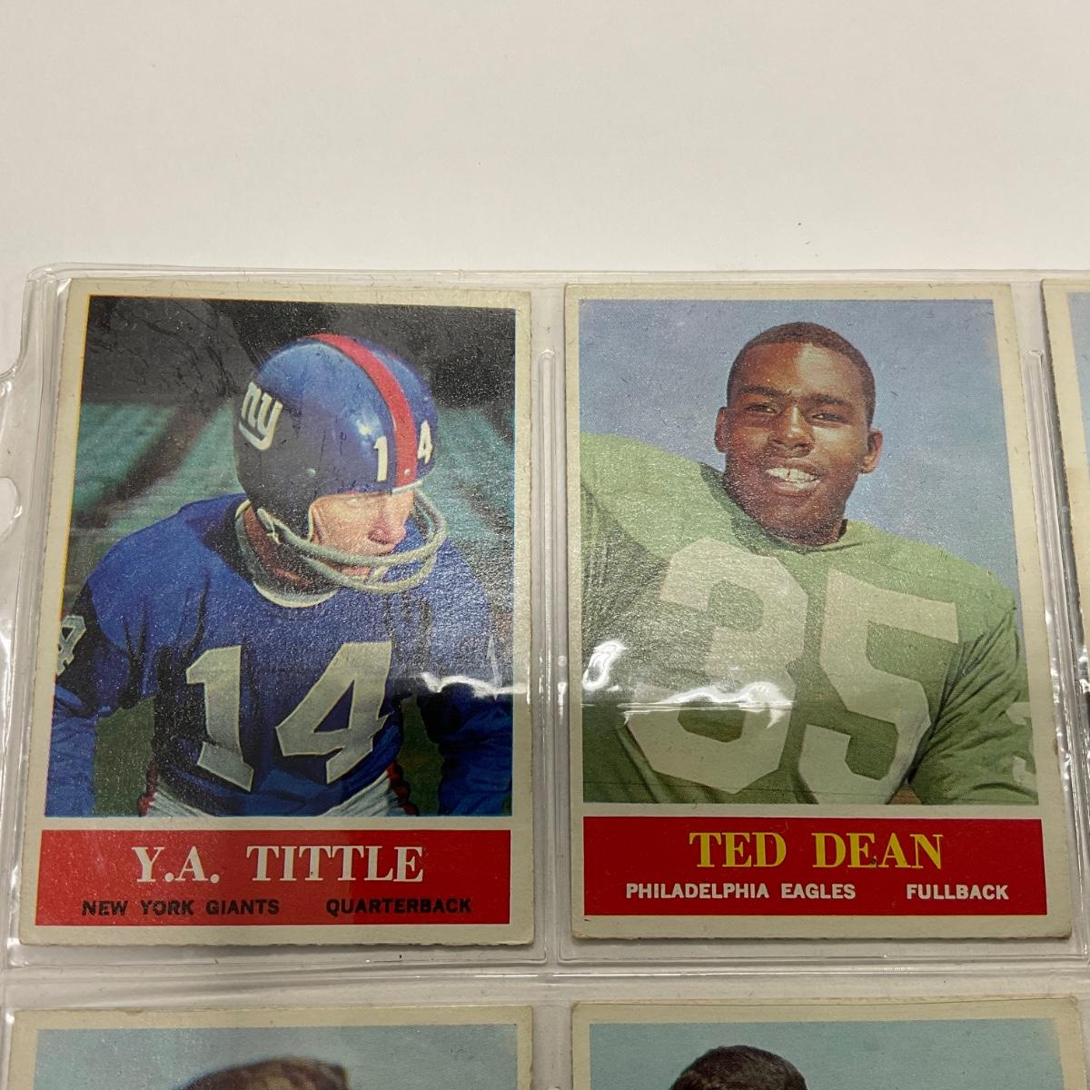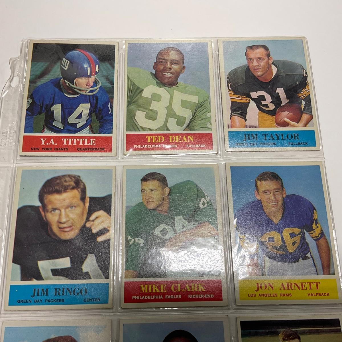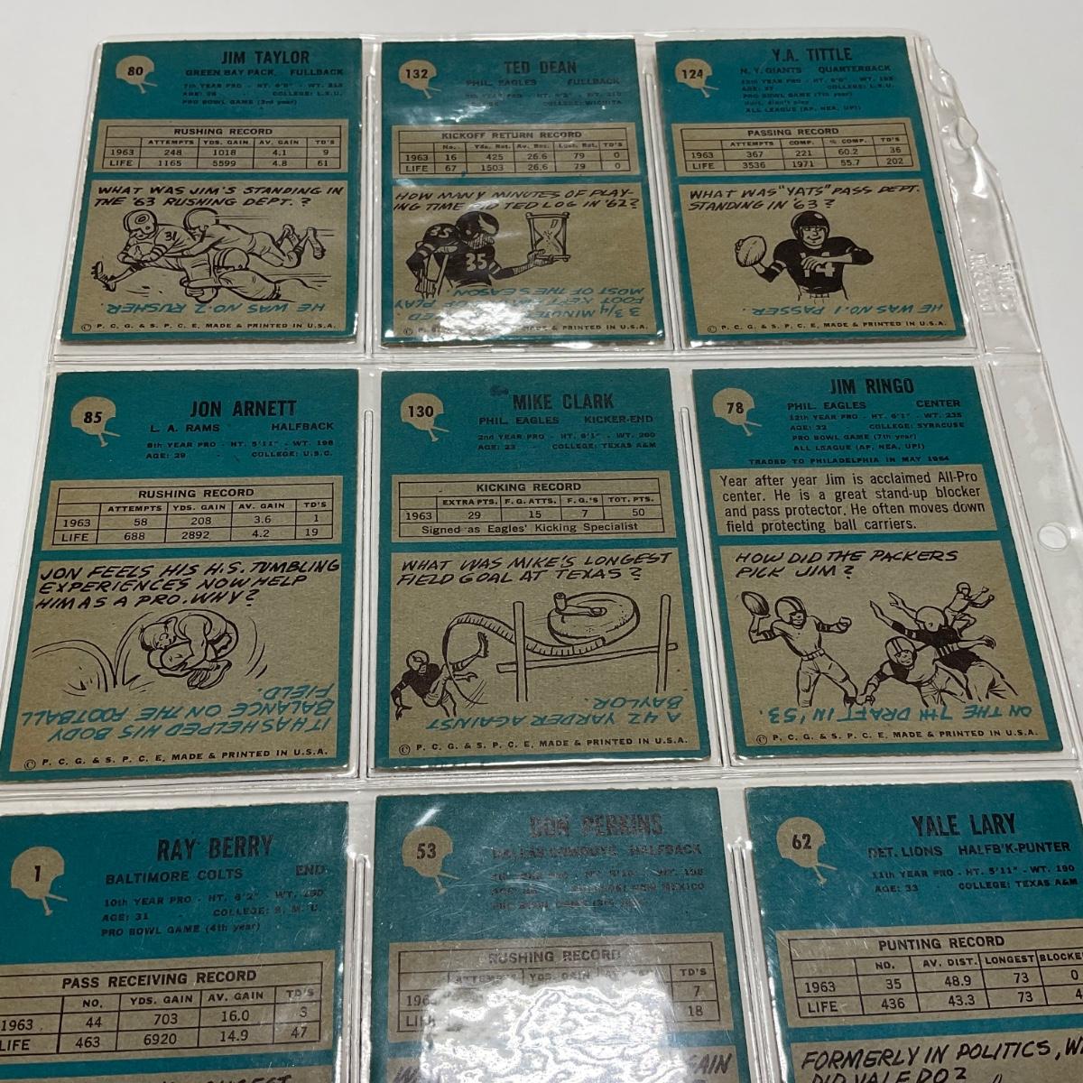 Nine vintage football cards including: Y.A. Tittle, Ted Dean, Jim Taylor, Jim Ringo, Mike Clark Jon Arnett, Yale Larry, Don Perkins, and Ray Berry sports cards. Please see photos for details and condition. ::: Shipping is available on this lot. If you require shipping you must let us know at the close of the auction. We will coordinate with you after the item has been won. Shipping fees will include insurance up to or exceeding the value of all items being mailed. If you have any questions regarding this lot please contact the auctioneer either via this website, by direct email or by phone. PICK UP TIMES and other important information can be found in the TERMS and DESCRIPTION of the auction. Please take a look for pertinent information. Thanks!