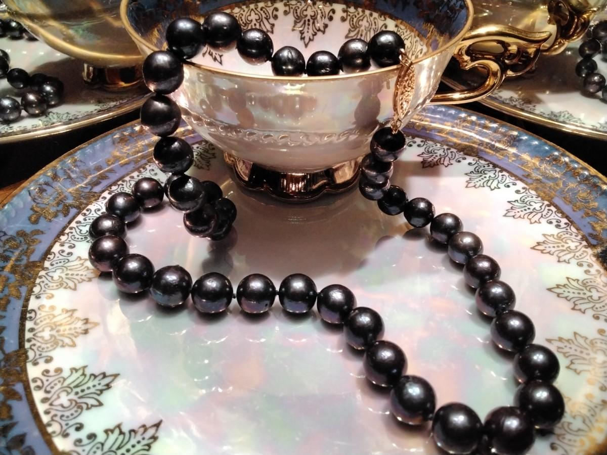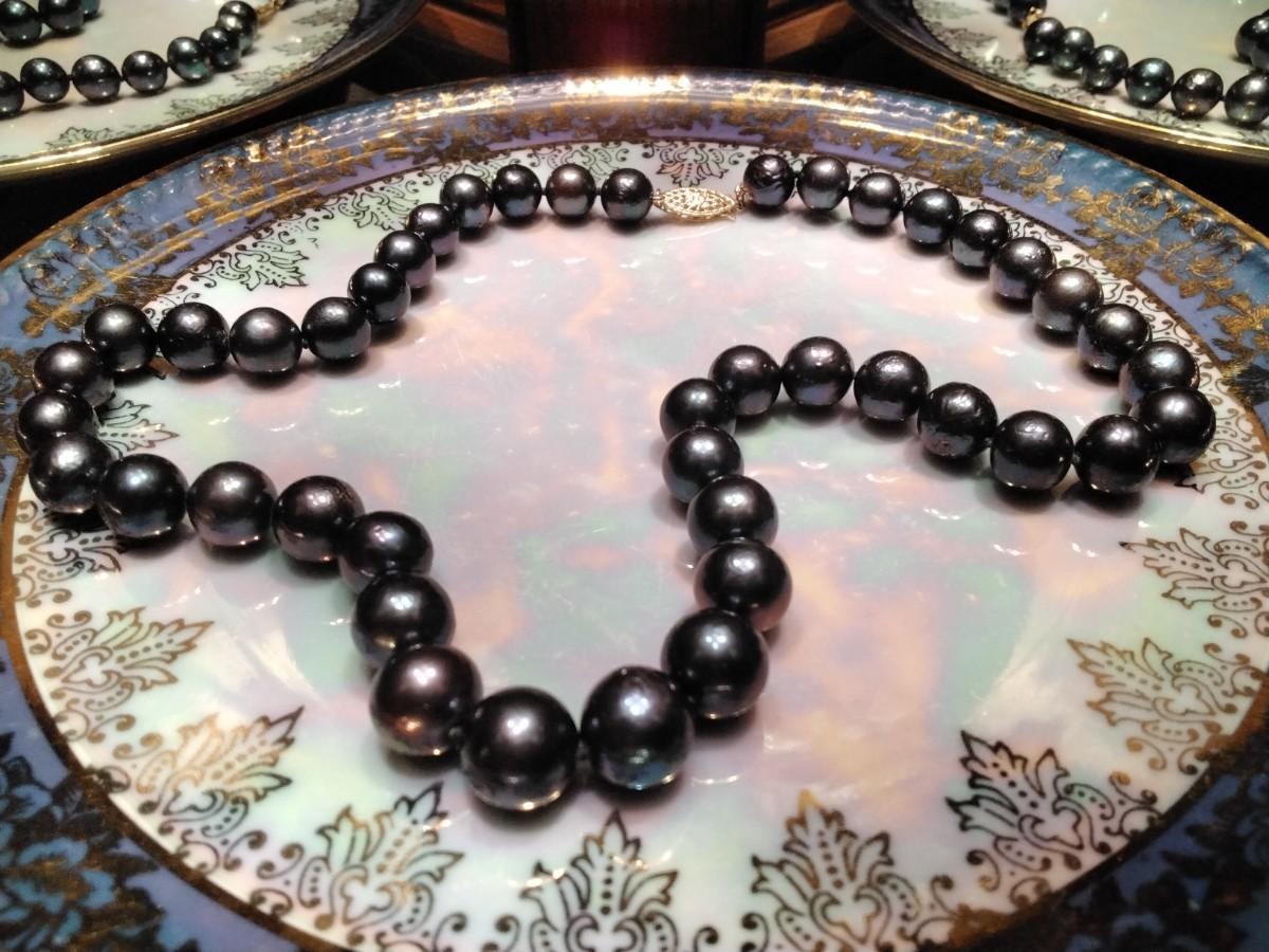 9 to 9.5 MM Black Pearl Necklace Big Solid 14kt Gold Clasp Filigree Style