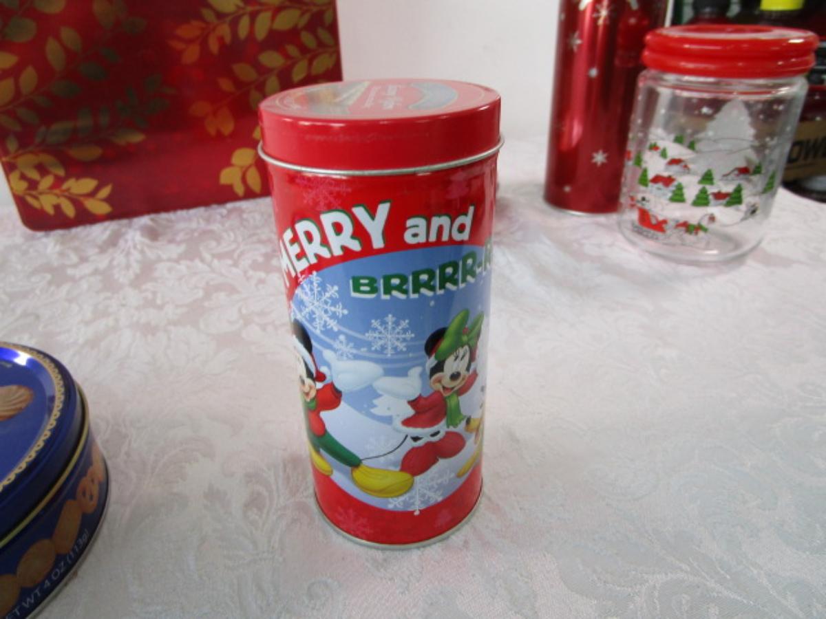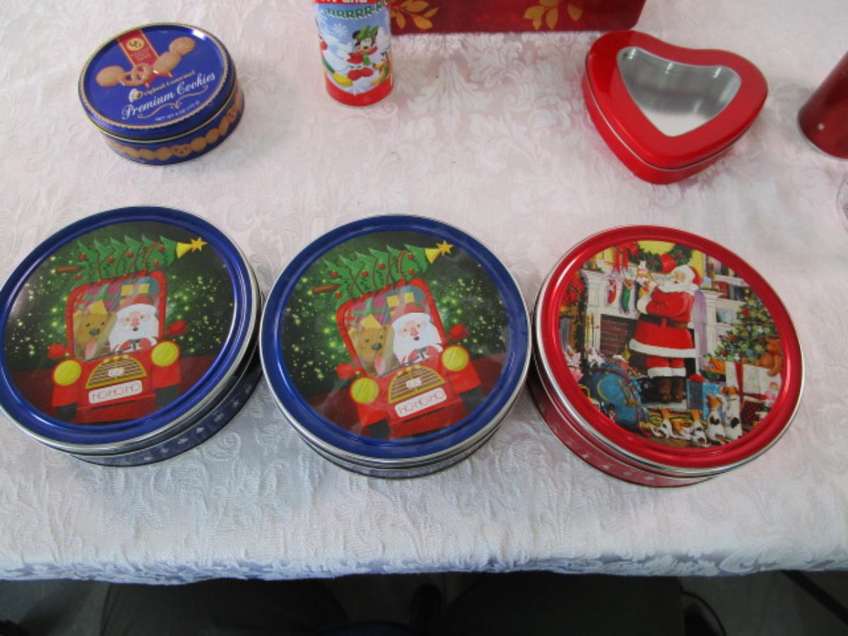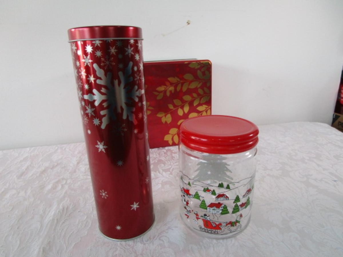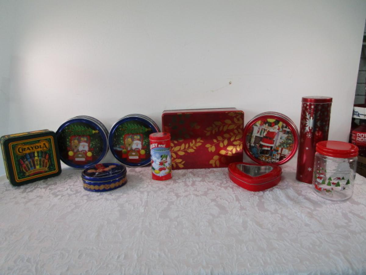 9 Various metal tins, 1 glass decorated jar, all with lids