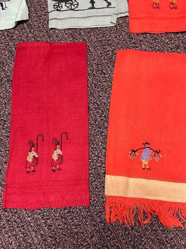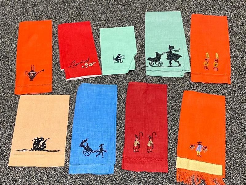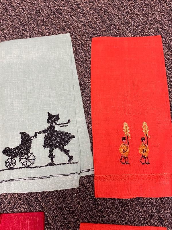 9 vintage handkerchiefs. Brightly colored, each stitched a different scene. Good Condition.
