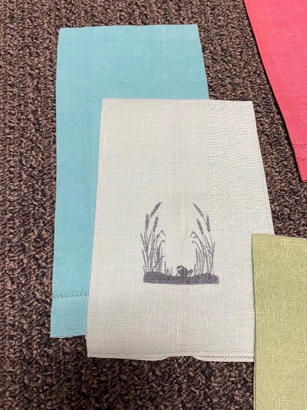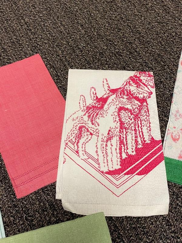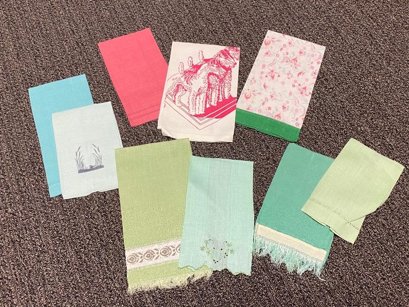 9 Vintage pieces of linen. Handkerchiefs and napkins. A few with patterns, a few solid colors. Good Condition.