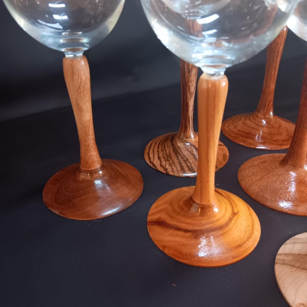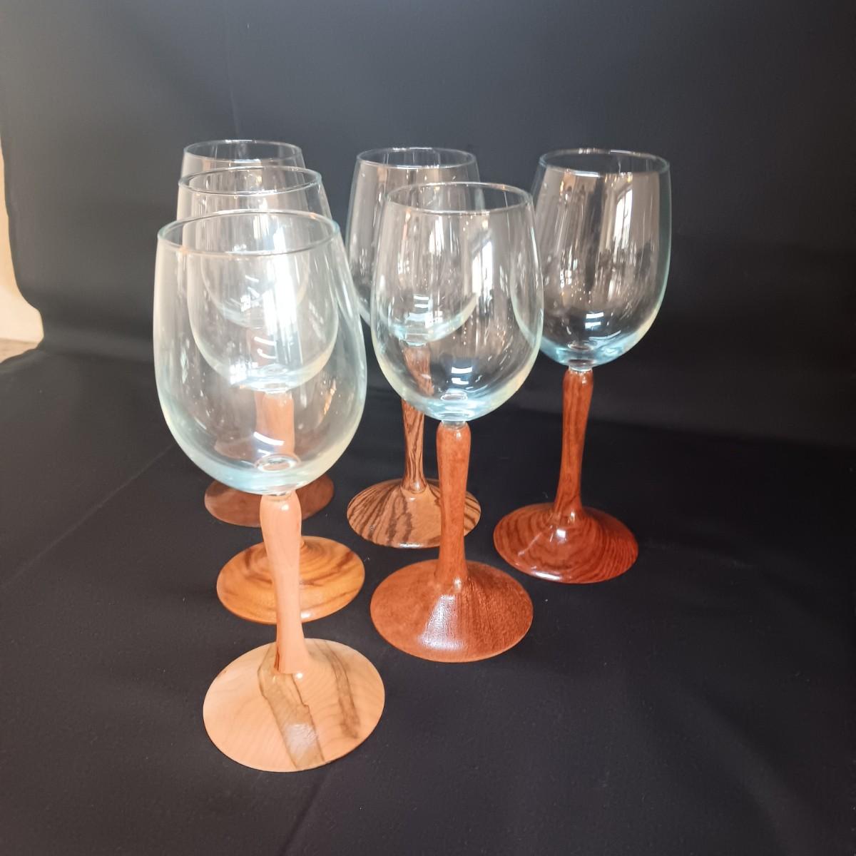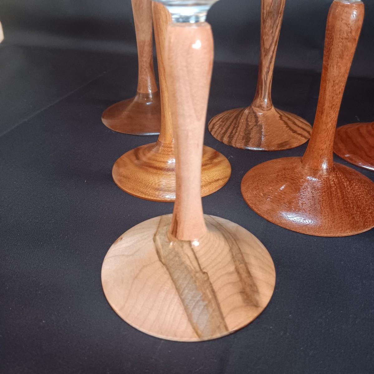 9" WINE GLASSES, EACH WITH DIFFERENT TYPE OF WOODEN STEMS, HANDMADE BY JERRY ERTLE OF FT COLLINS, CO