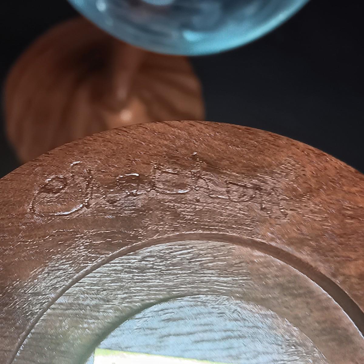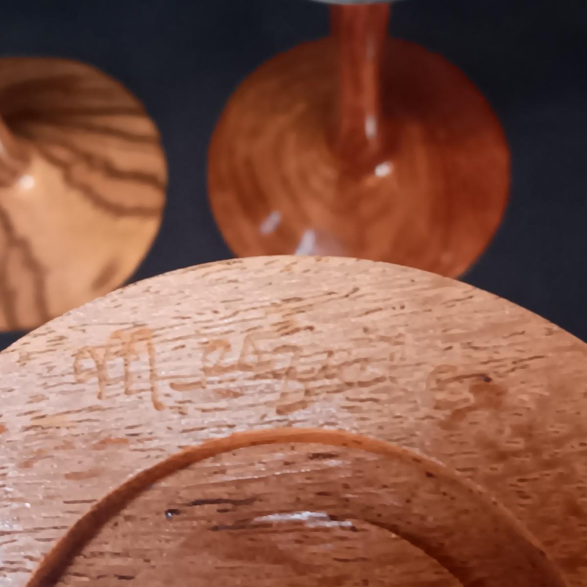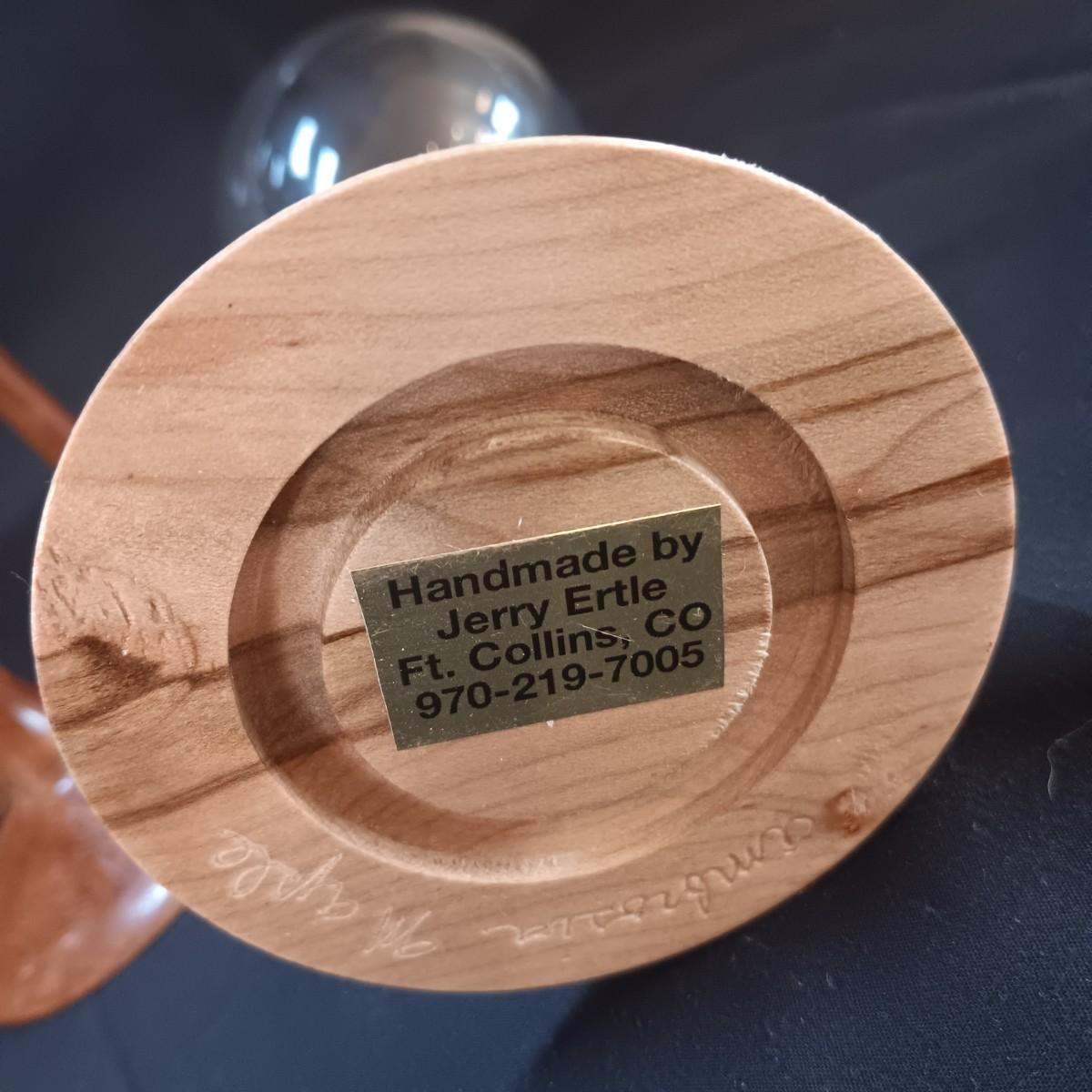9" WINE GLASSES, EACH WITH DIFFERENT TYPE OF WOODEN STEMS, HANDMADE BY JERRY ERTLE OF FT COLLINS, CO
