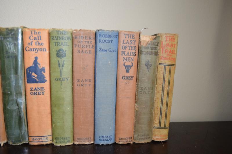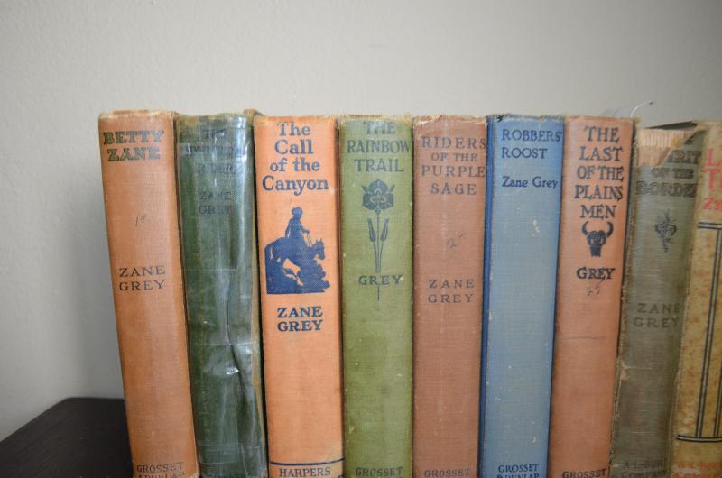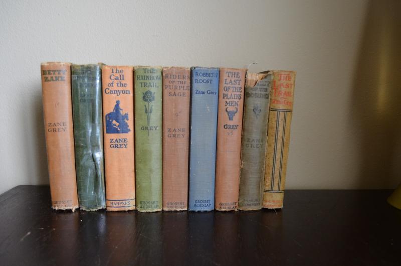 9 ZANE GREY HARD COVER BOOKS. COVER IS LOOSE ON ONE BOOG