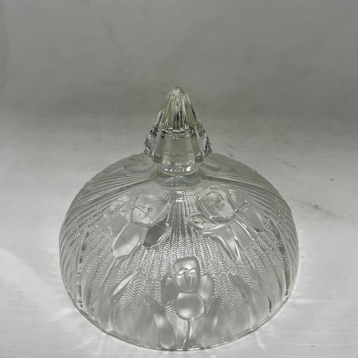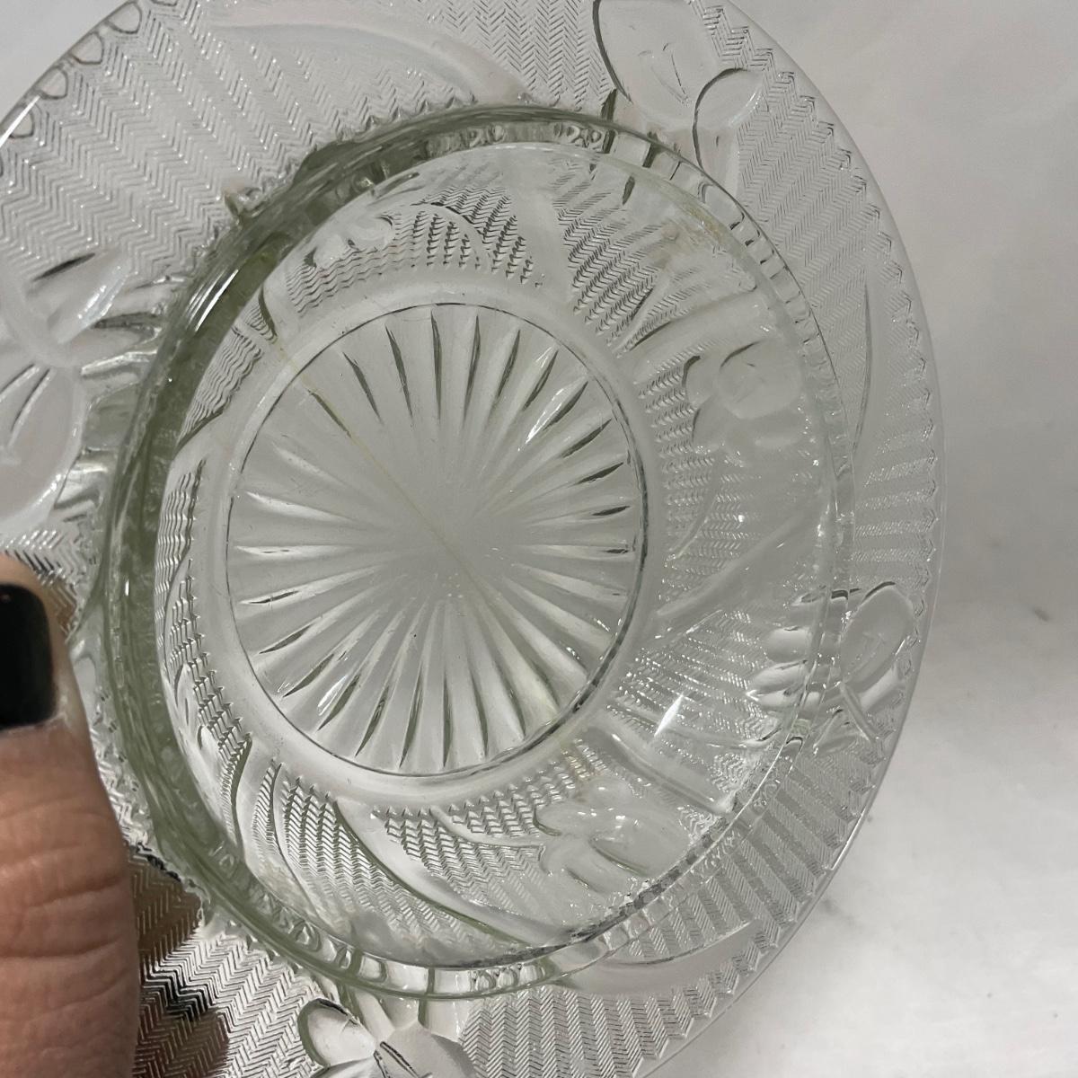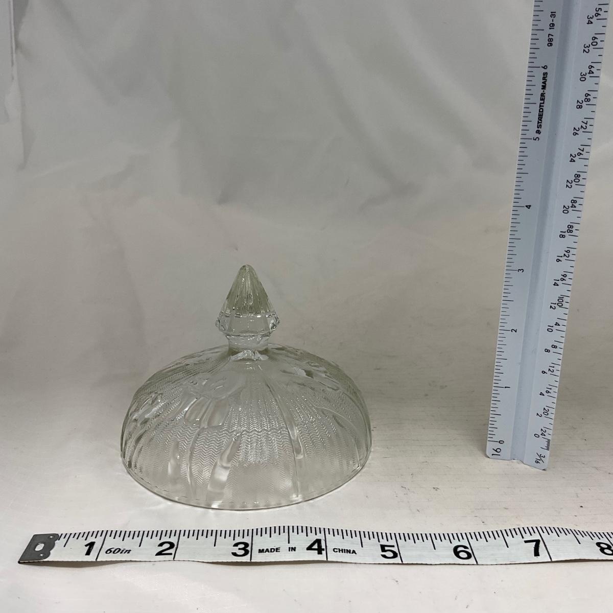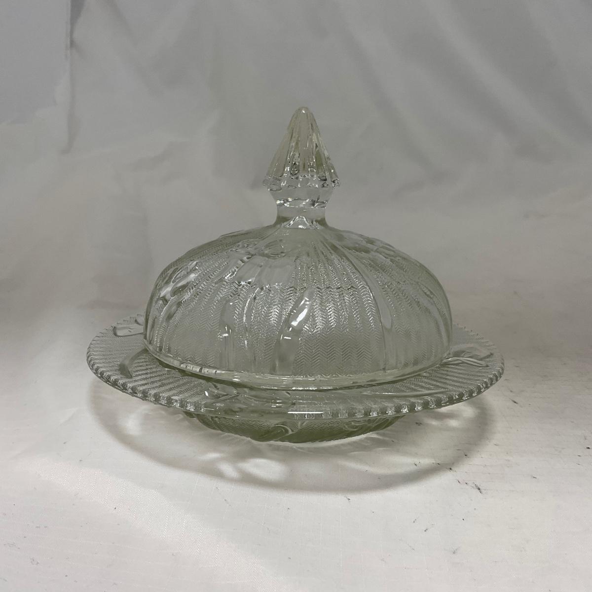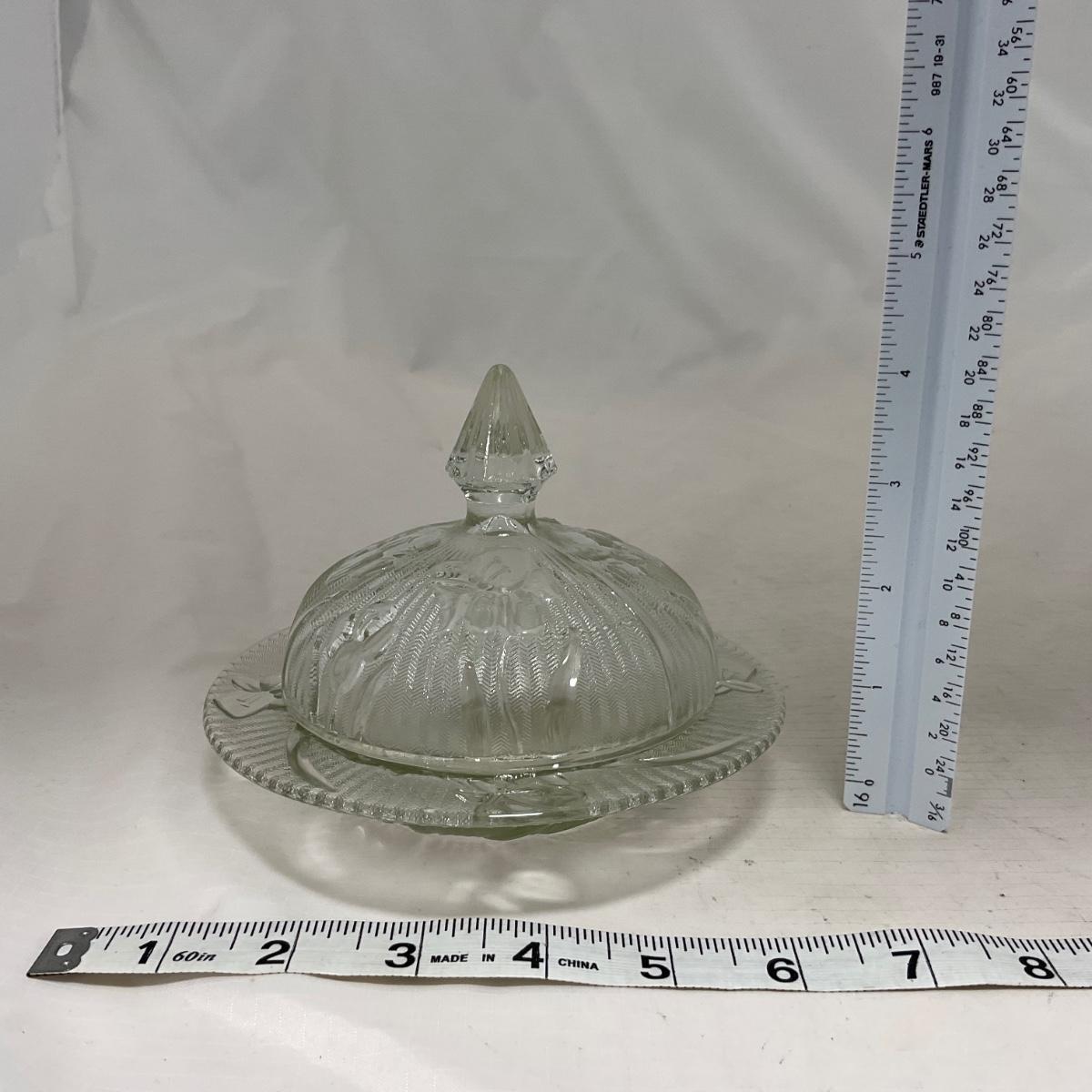 One clear glass covered butter dish with flower details. Please see photos for details and condition. ::: Shipping is available on this lot. If you require shipping you must let us know at the close of the auction. We will coordinate with you after the item has been won. Shipping fees will include insurance up to or exceeding the value of all items being mailed. If you have any questions regarding this lot please contact the auctioneer either via this website, by direct email or by phone. PICK UP TIMES and other important information can be found in the TERMS and DESCRIPTION of the auction. Please take a look for pertinent information. Thanks!