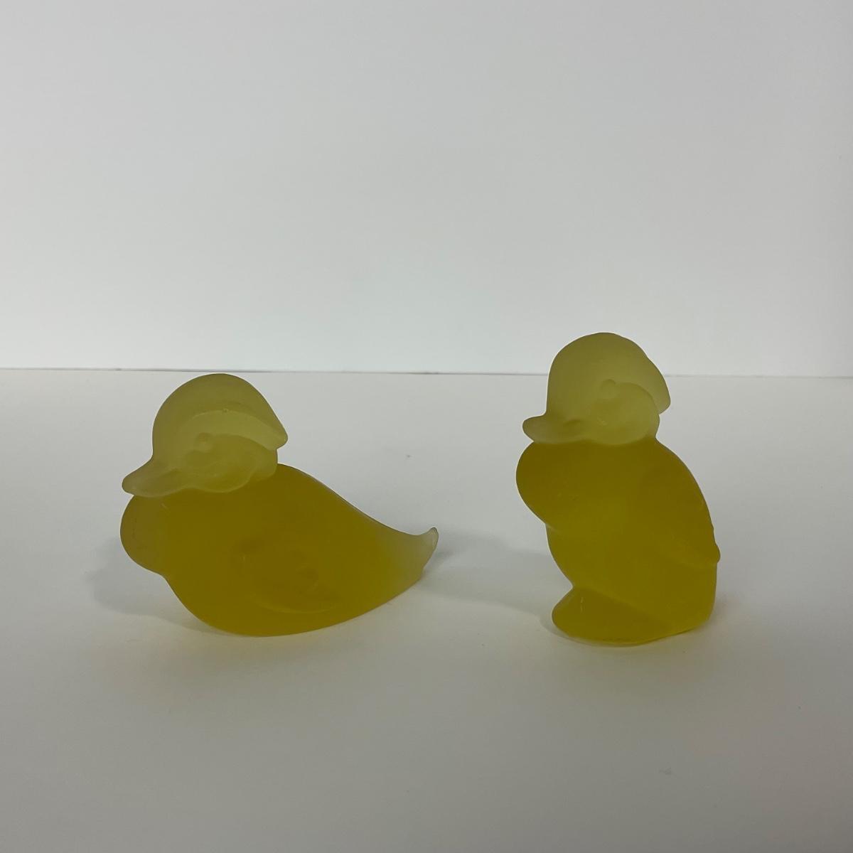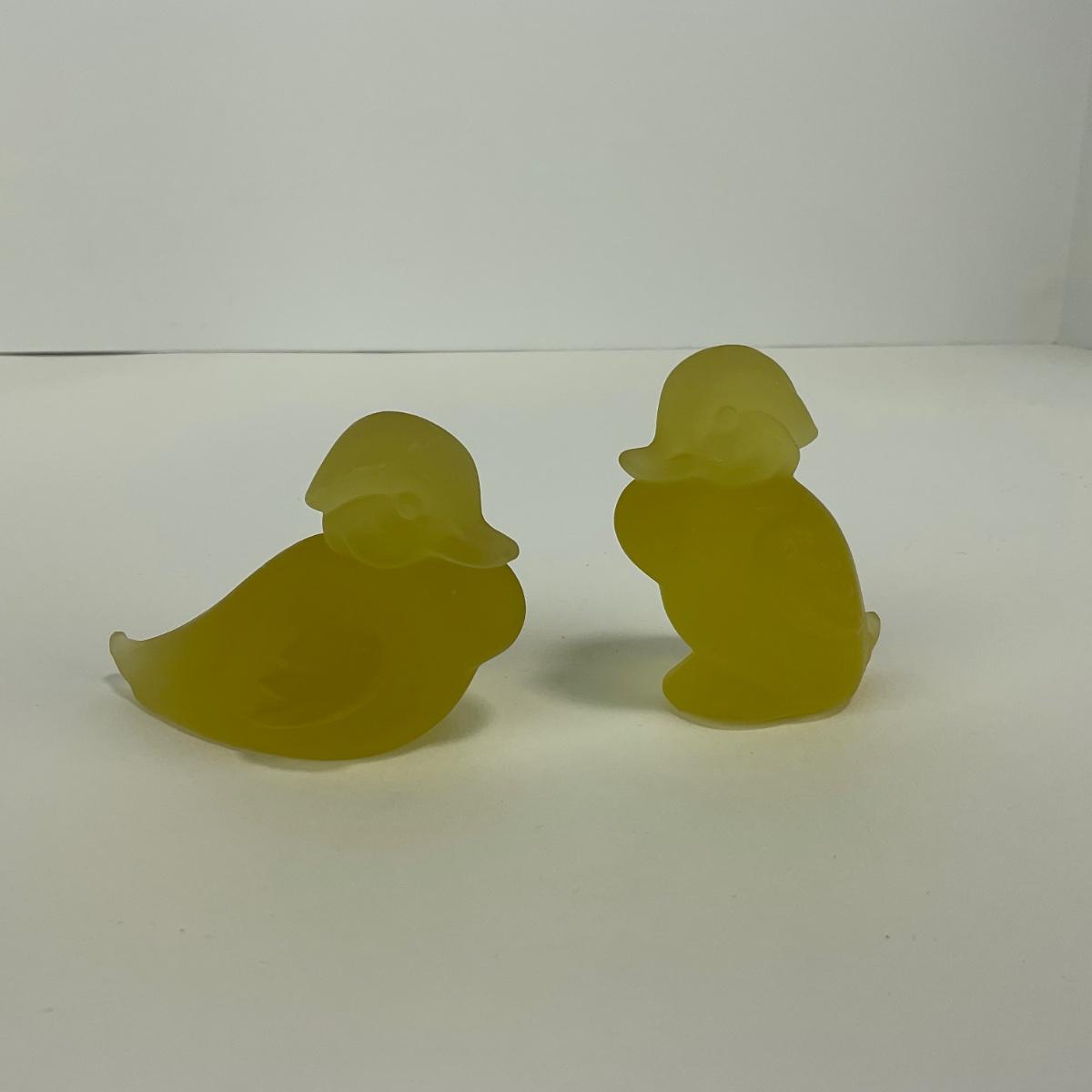Two frosted sunshine yellow Heisey by Imperial wood ducklings. There are a few minor scuffs and dings but they otherwise appear to be in good shape. Please see photos for details and condition. Any condition statement is given as a courtesy to a client, is an opinion, and should not be treated as a statement of fact. Reference to condition written, oral or within a condition report shall not be regarded as a full account of condition and may not include all defects, alterations, or restorations. Absence of a condition report does not imply a lot is flawless or lacking imperfections or damage. Katherine’s Auction & Appraisal Service shall have no responsibility for any error or omission. Returns shall not be accepted on the basis of condition. ::: Shipping is available on this lot. If you require shipping you must let us know at the close of the auction. We will coordinate with you after the item has been won. Shipping fees will include insurance up to or exceeding the value of all items being mailed. If you have any questions regarding this lot please contact the auctioneer either via this website, by direct email or by phone. PICK UP TIMES and other important information can be found in the TERMS and DESCRIPTION of the auction. Please take a look for pertinent information. Thanks!
