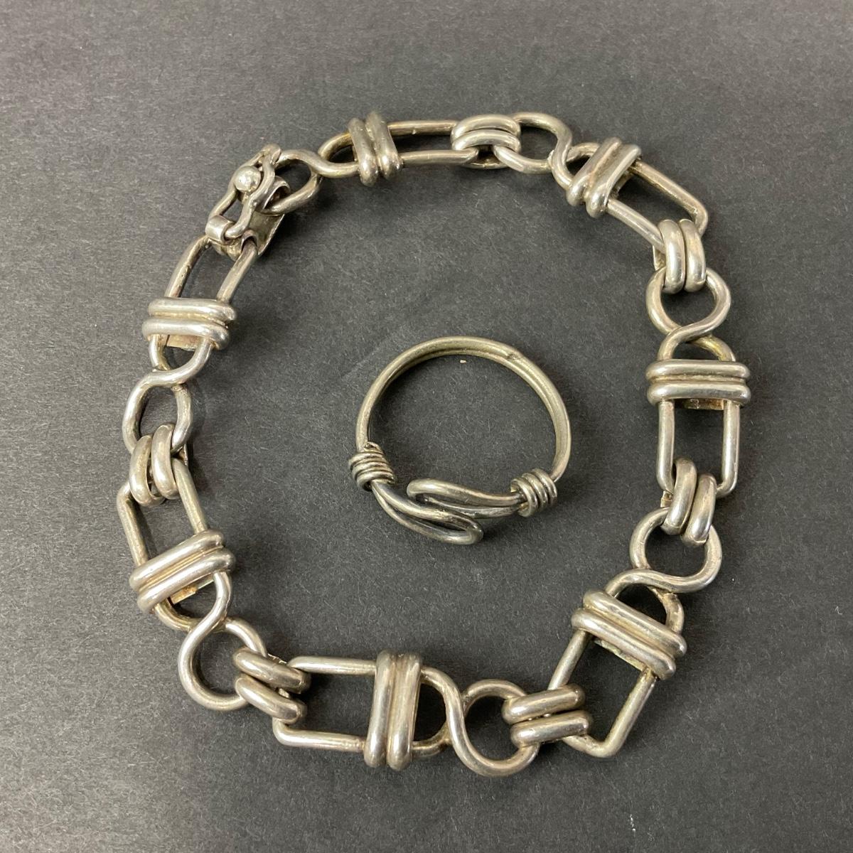 One matching bracelet and ring. This piece is an unknown sort of metal. The ring is a size . Please see photos for details and condition. Any condition statement is given as a courtesy to a client, is an opinion, and should not be treated as a statement of fact. Reference to condition written, oral or within a condition report shall not be regarded as a full account of condition and may not include all defects, alterations, or restorations. Absence of a condition report does not imply a lot is flawless or lacking imperfections or damage. Katherine’s Auction & Appraisal Service shall have no responsibility for any error or omission. Returns shall not be accepted on the basis of condition. ::: Shipping is available on this lot. If you require shipping you must let us know at the close of the auction. We will coordinate with you after the item has been won. Shipping fees will include insurance up to or exceeding the value of all items being mailed. If you have any questions regarding this lot please contact the auctioneer either via this website, by direct email or by phone. PICK UP TIMES and other important information can be found in the TERMS and DESCRIPTION of the auction. Please take a look for pertinent information. Thanks!