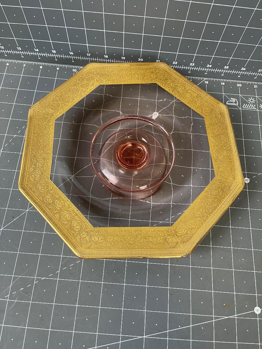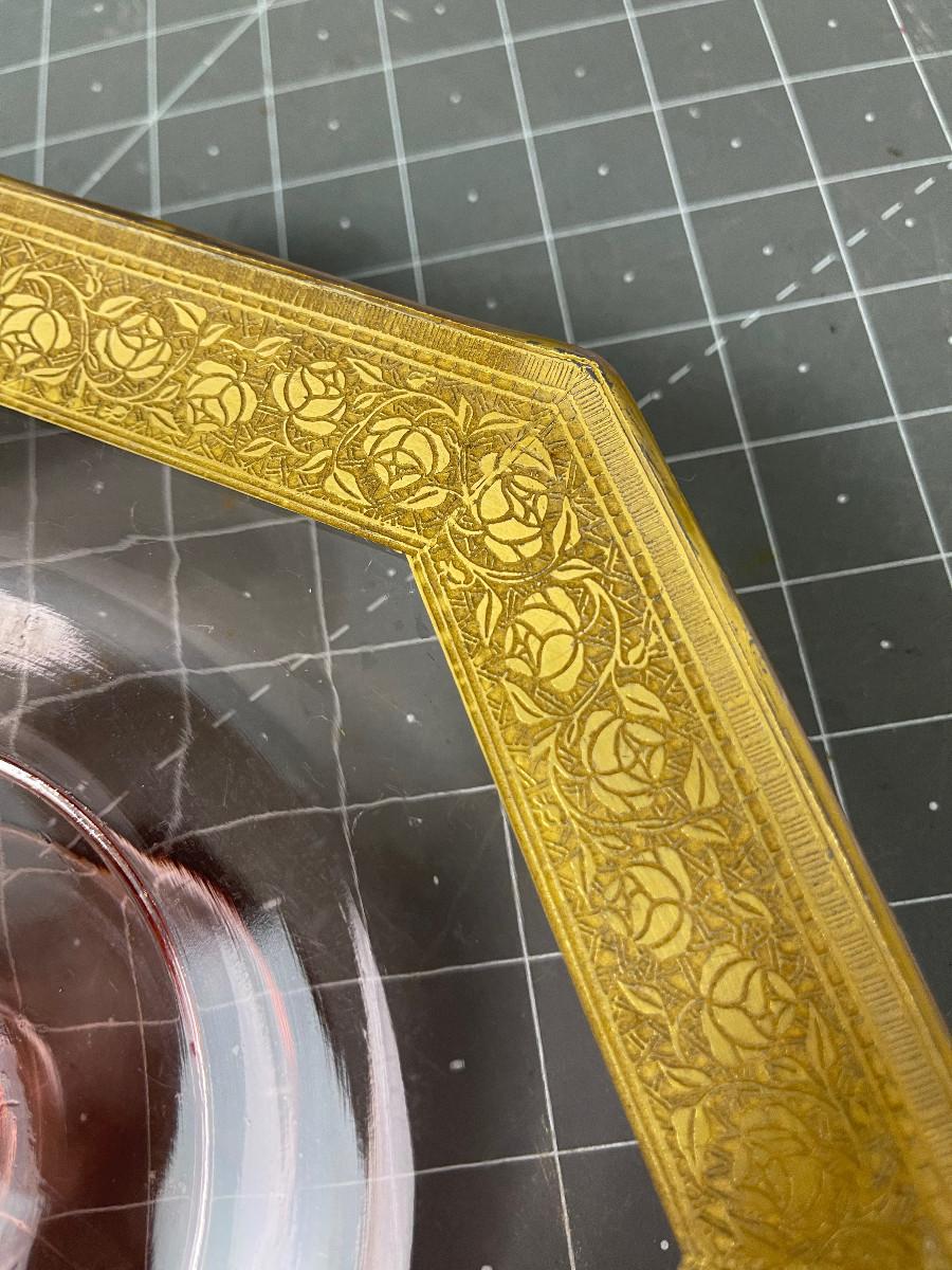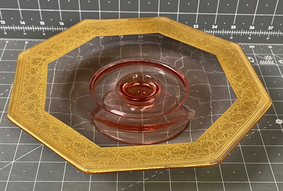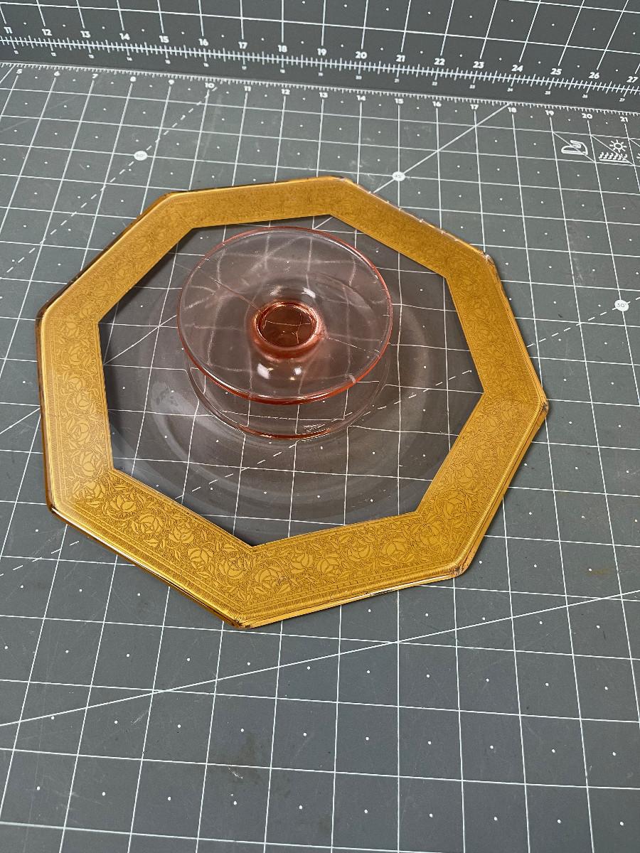 #90 Pink Glass Footed Cake Plate with Gold Rim