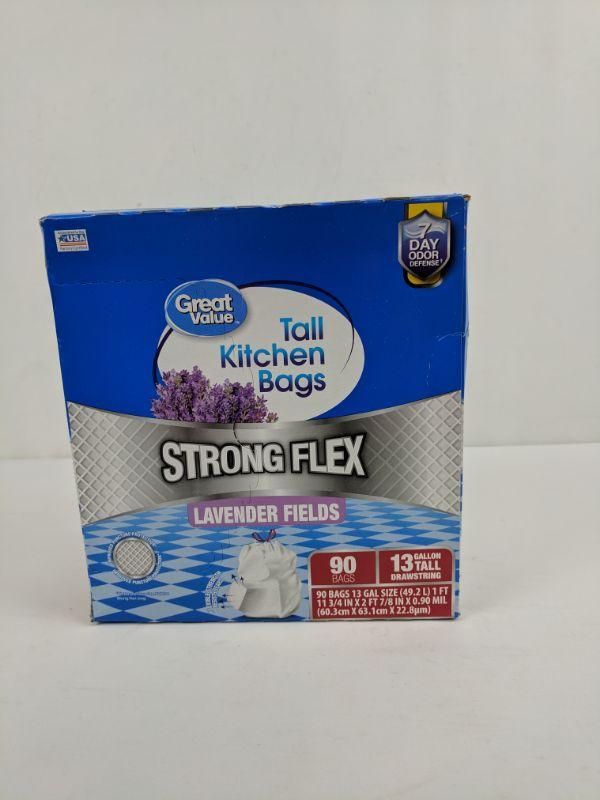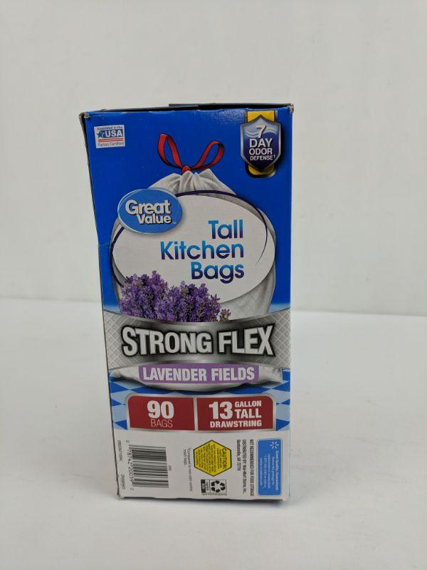 90 Tall Kitchen Bags, Strong Flex, Lavender Fields, 13 Gallon Tall Drawstring - New