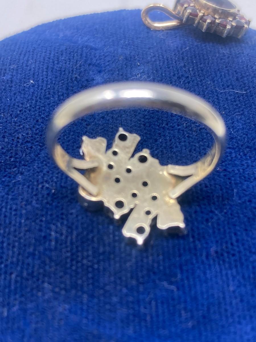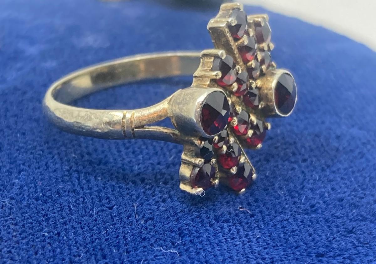 900 sterling ring is marked, silver pendant is unmarked and untested. Possibly garnet or carnelian stones.