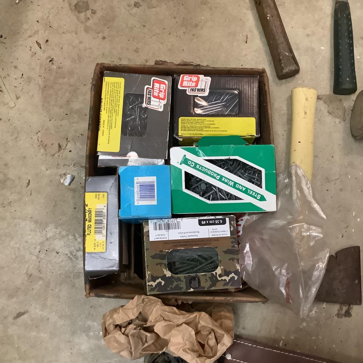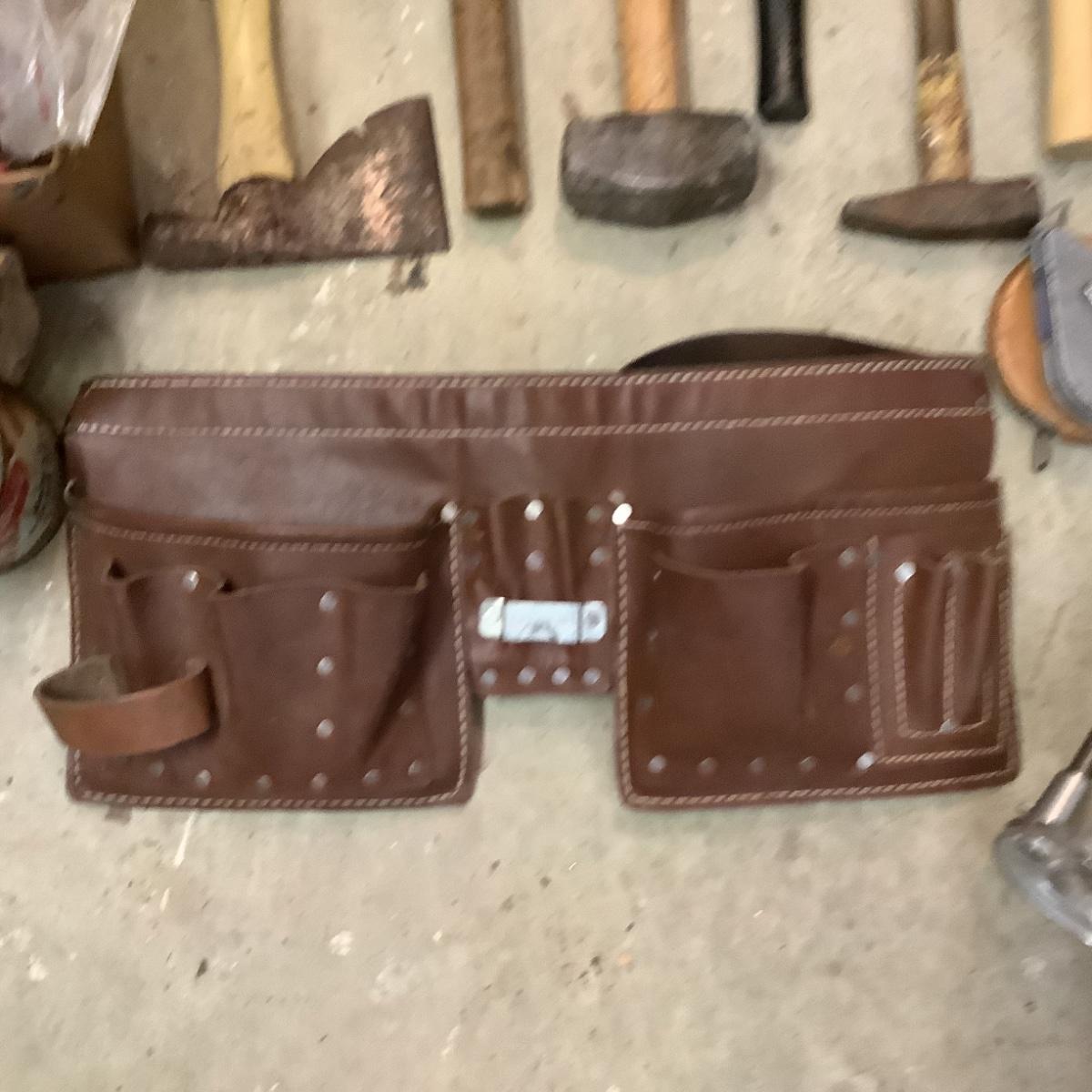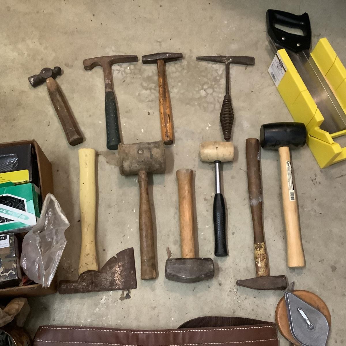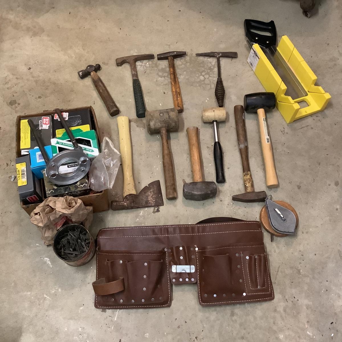 901 Lot of Vatious Hammers, Nails, and Leather Tool Belt