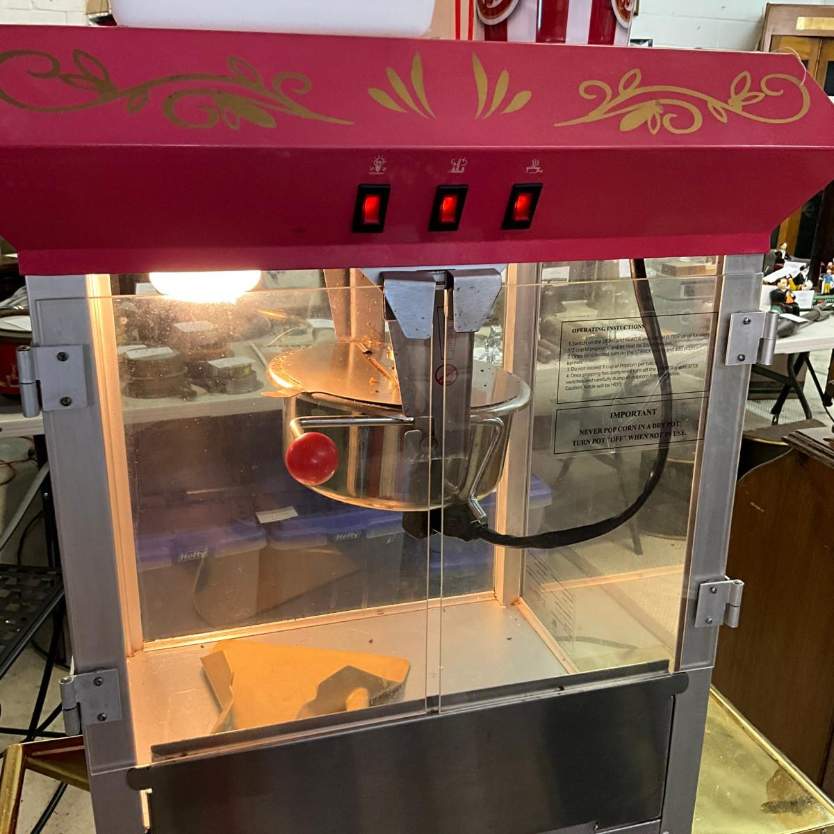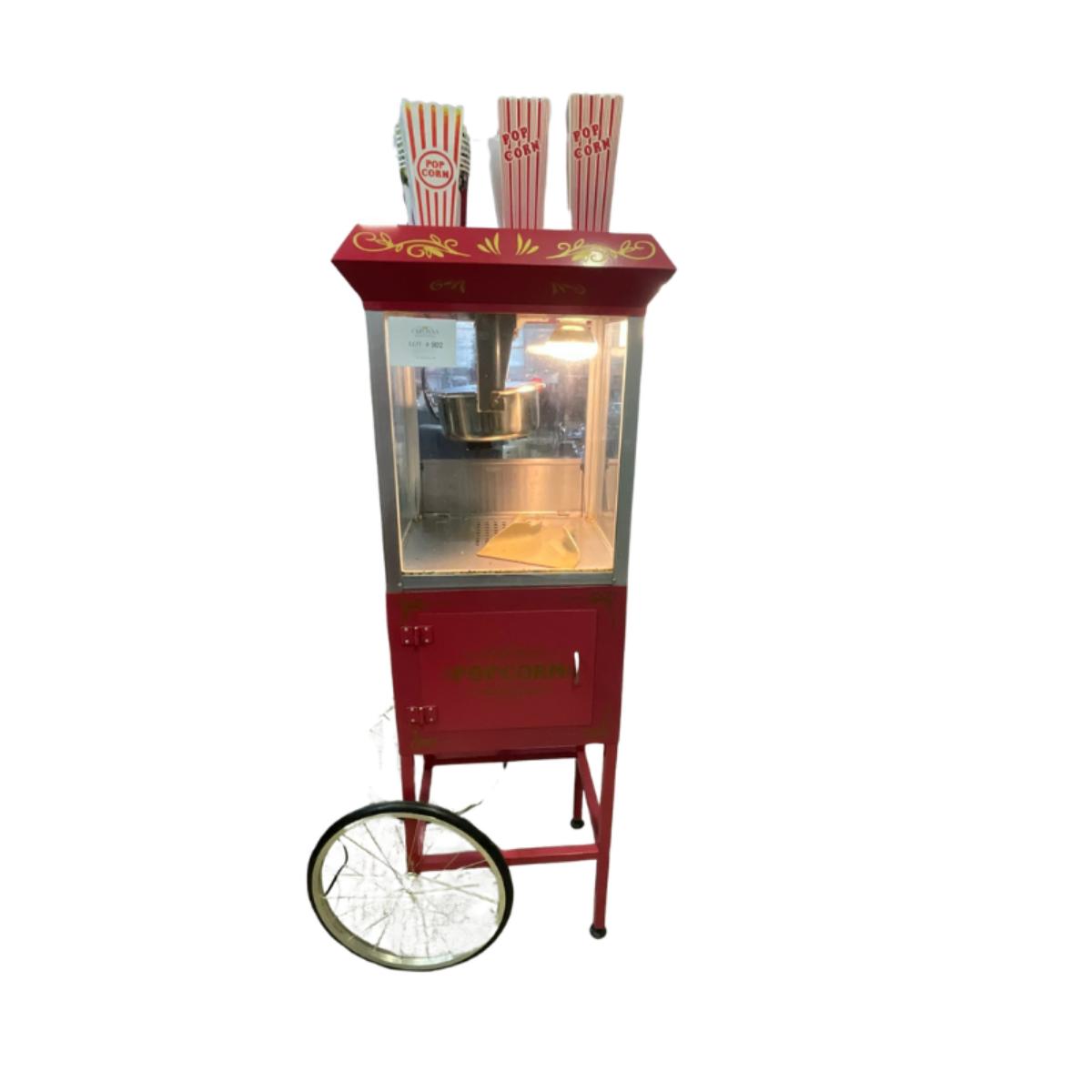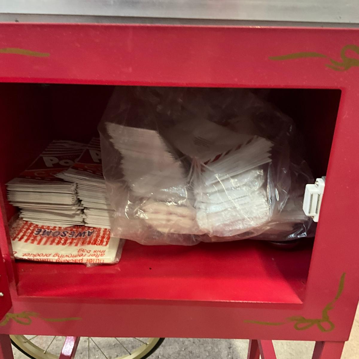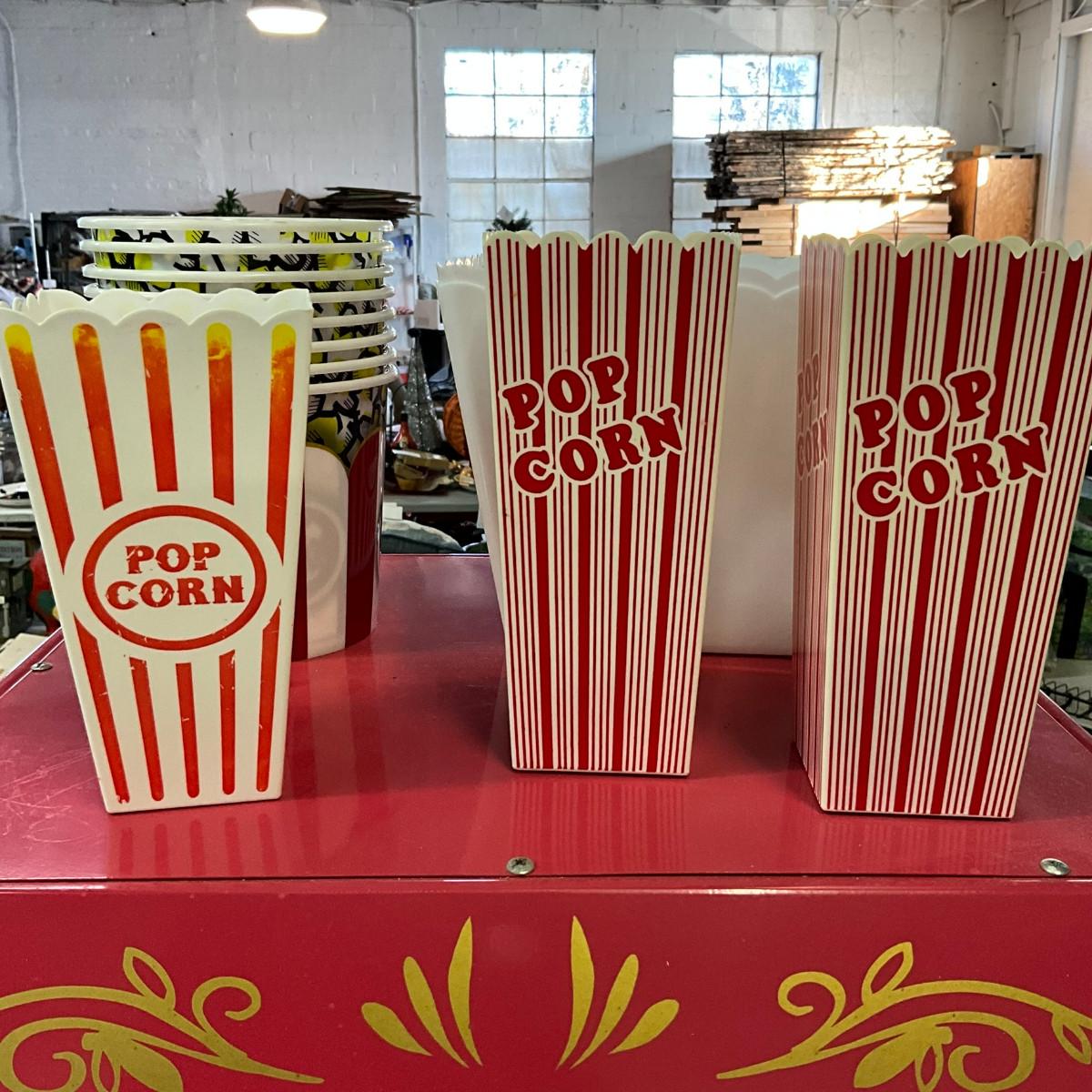Comes with popcorn scoop, paper popcorn bags, popcorn plastic buckets