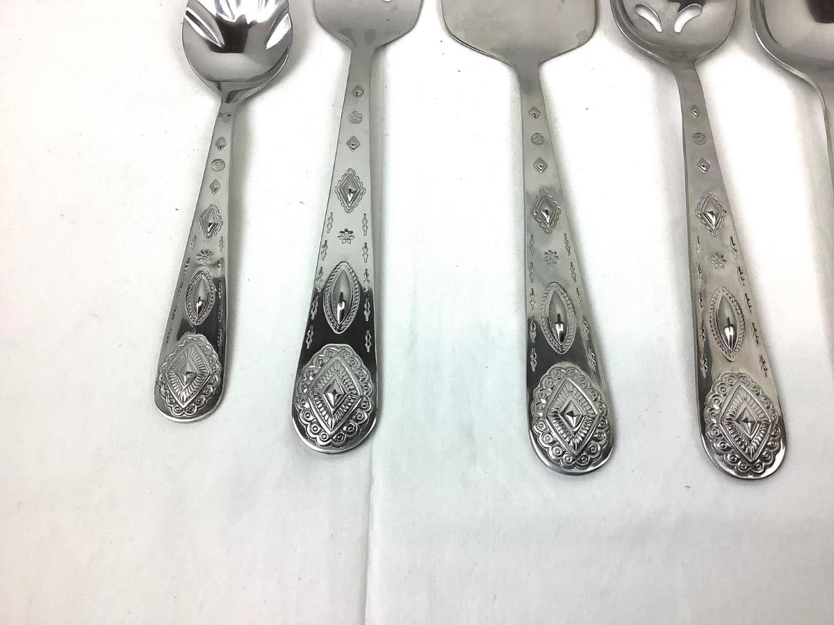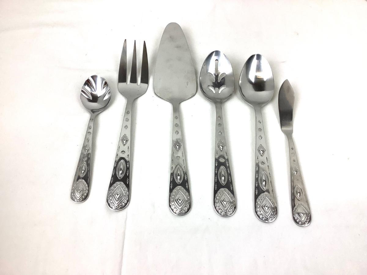 Pie server, master butter, serving spoon, slotted serving spoon, meat/serving fork, and sugar shell spoon.