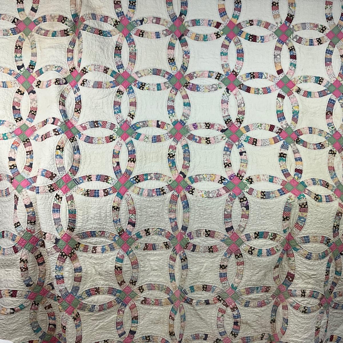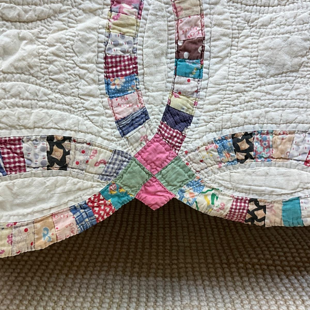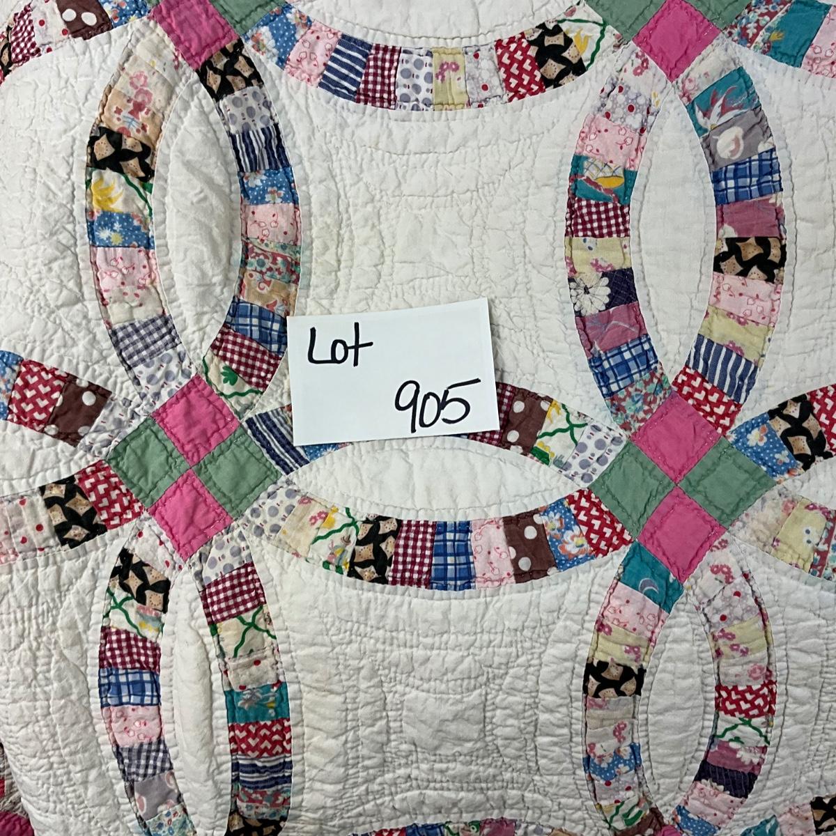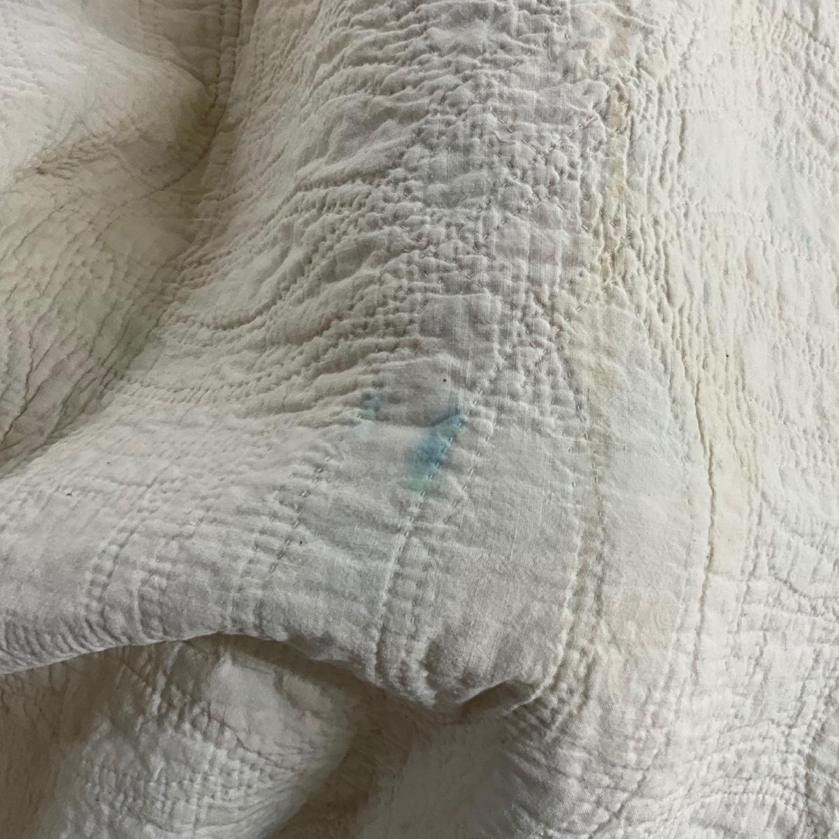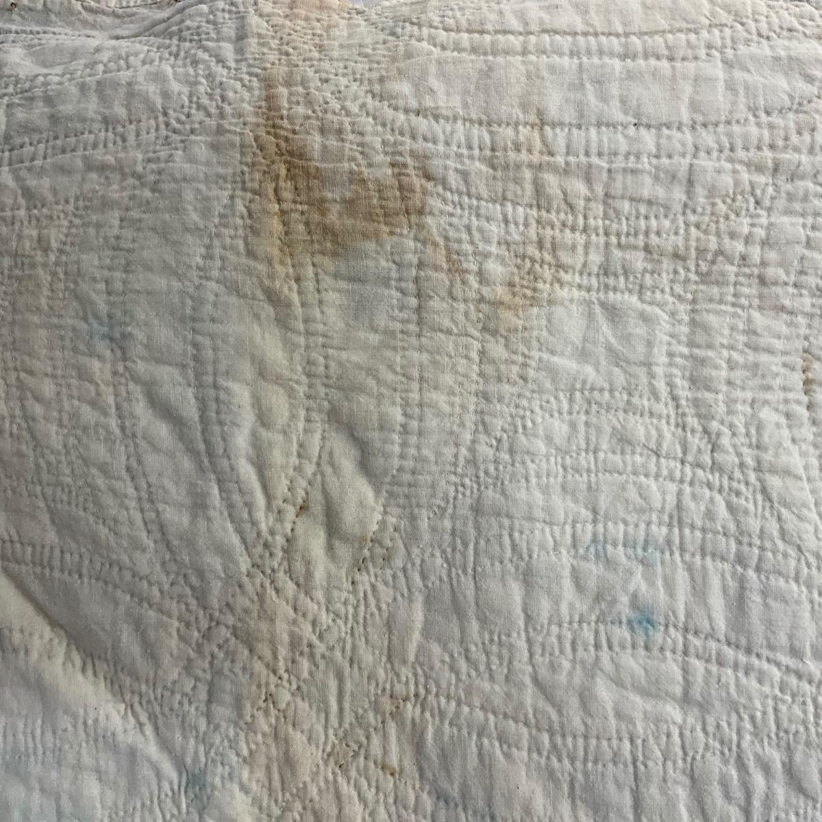 The quilt measures 79" wide x 93" long, some areas of discoloration on the back.