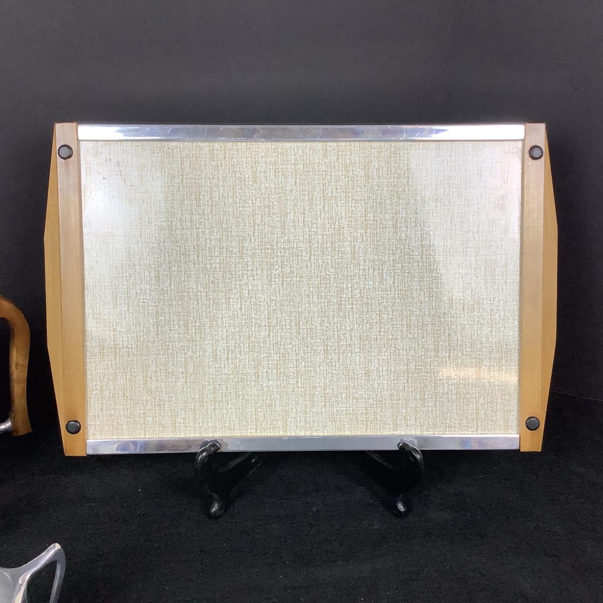 Tray is Formica with wooden handles measuring 18.5" long x 12" wide x 1.25" high
