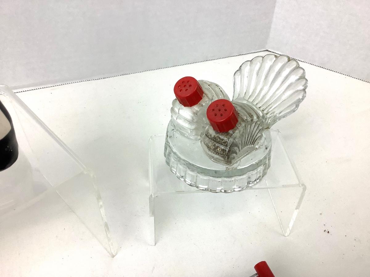 The Art Deco chrome set is salt, pepper and a middle condiment jar for mustard, ketchup etc. It measures 6.5" x 2" x 2". The Americana ceramic salt & pepper set has signs of wear from age and are 5" tall. The glass salt and pepper set with the fan tail tray is 4" x 2.5".
