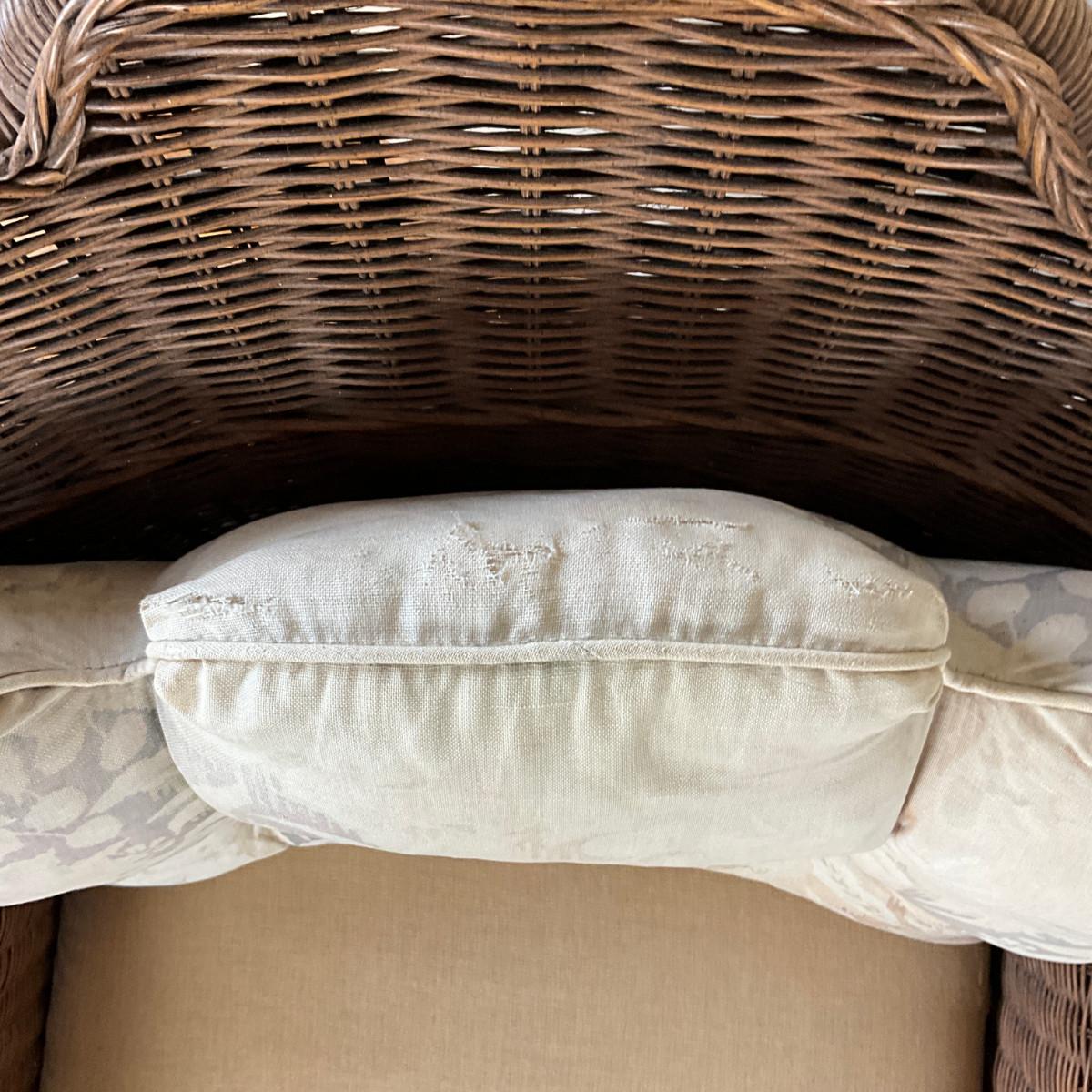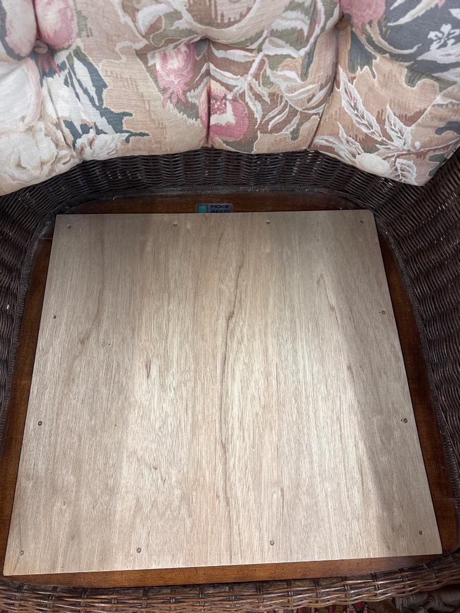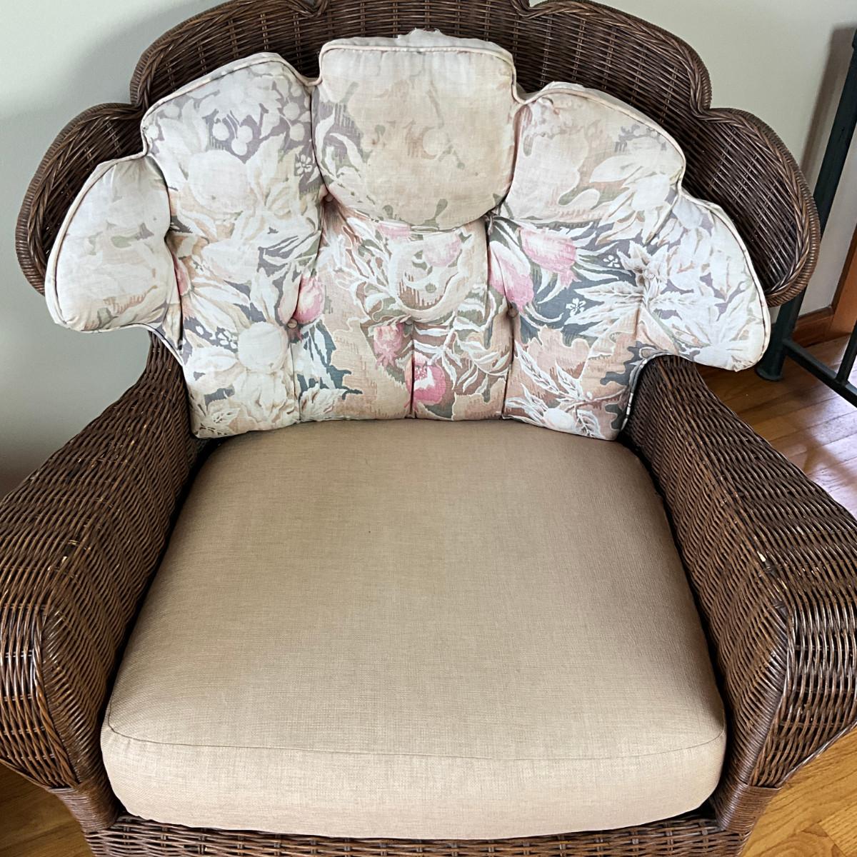 Has some minor damage to wicker, front bottom coming unraveled, cushions have fading