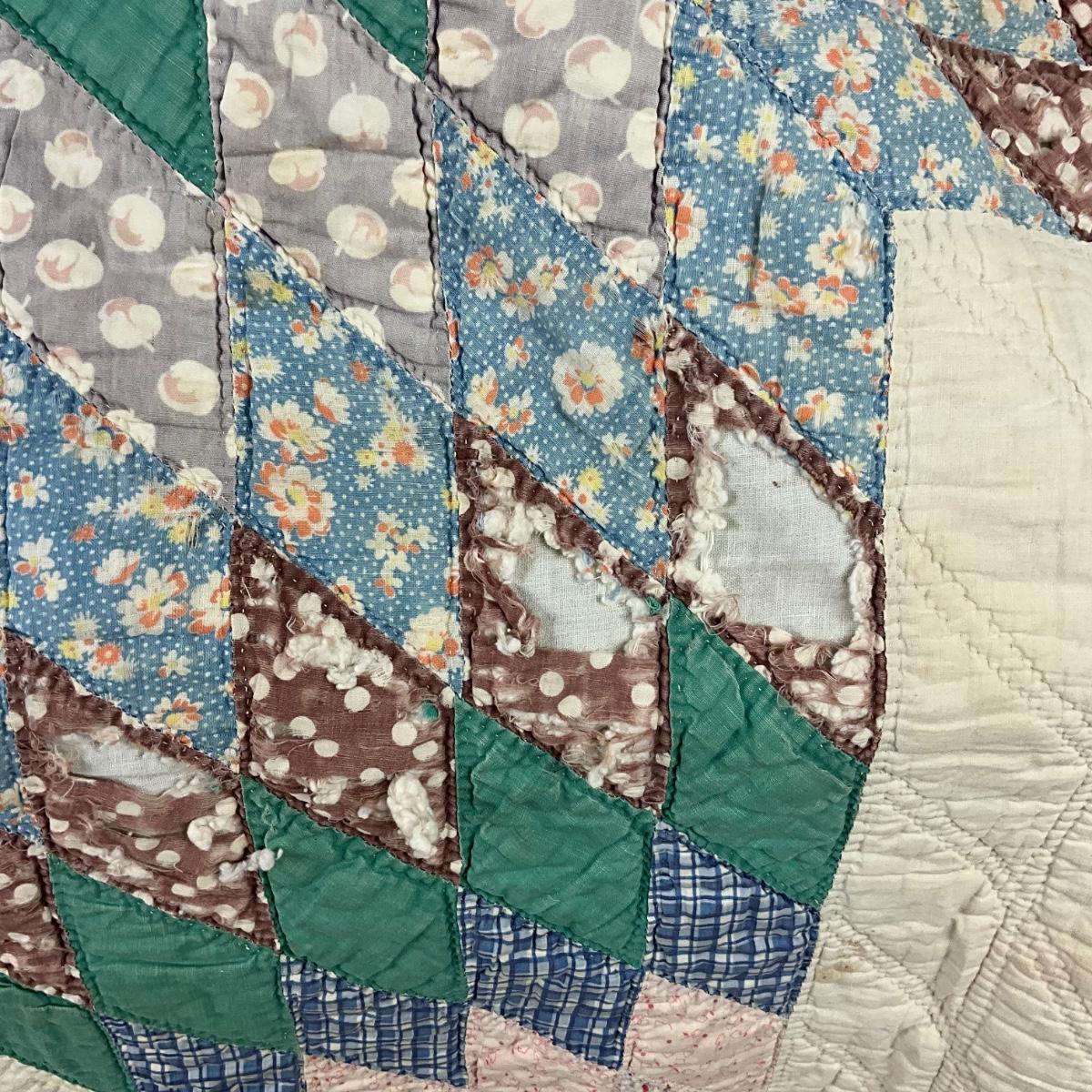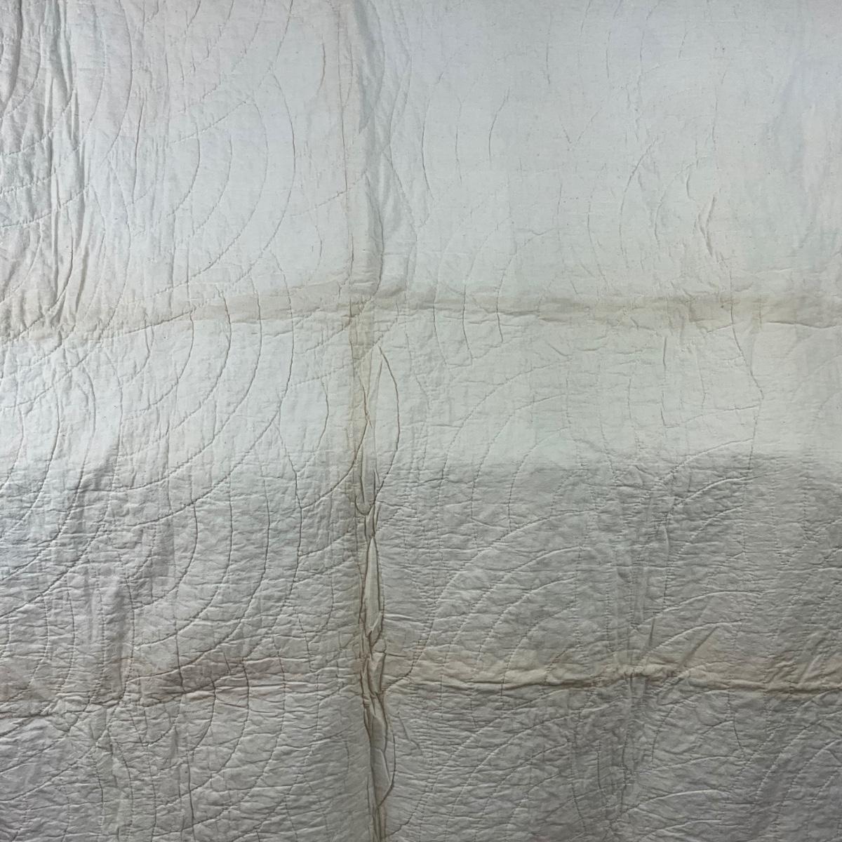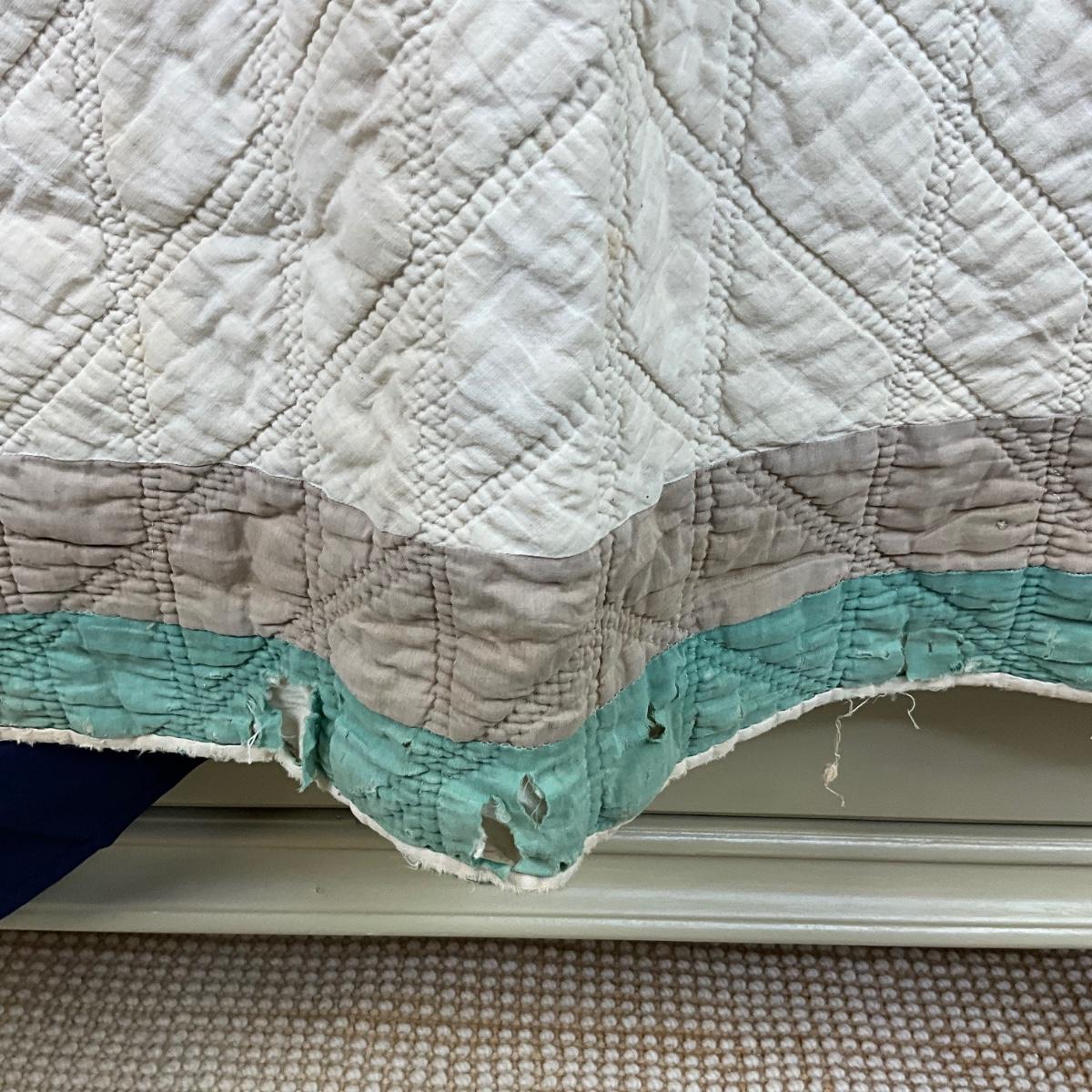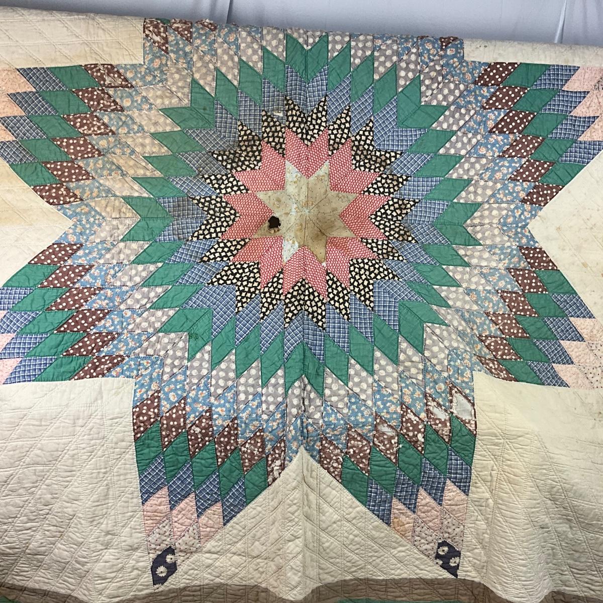 There are areas of discoloration and one tear, measures 84" wide x 70" long.